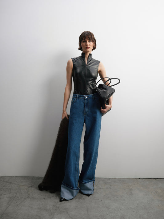 Штани еко-шкіра вільного крою чорні з вишивкою