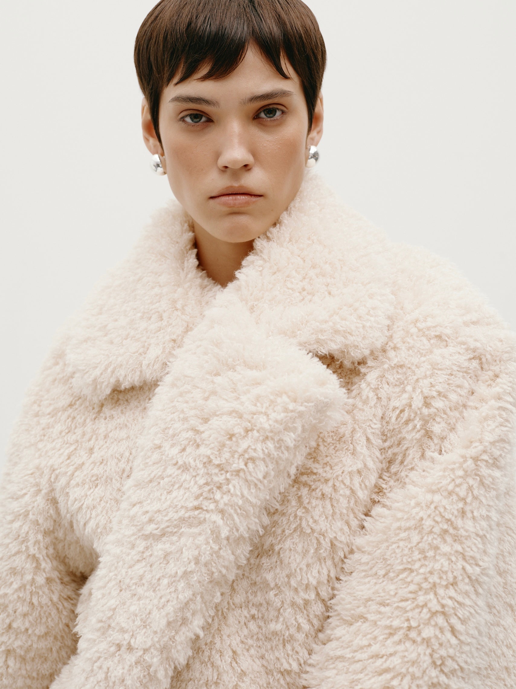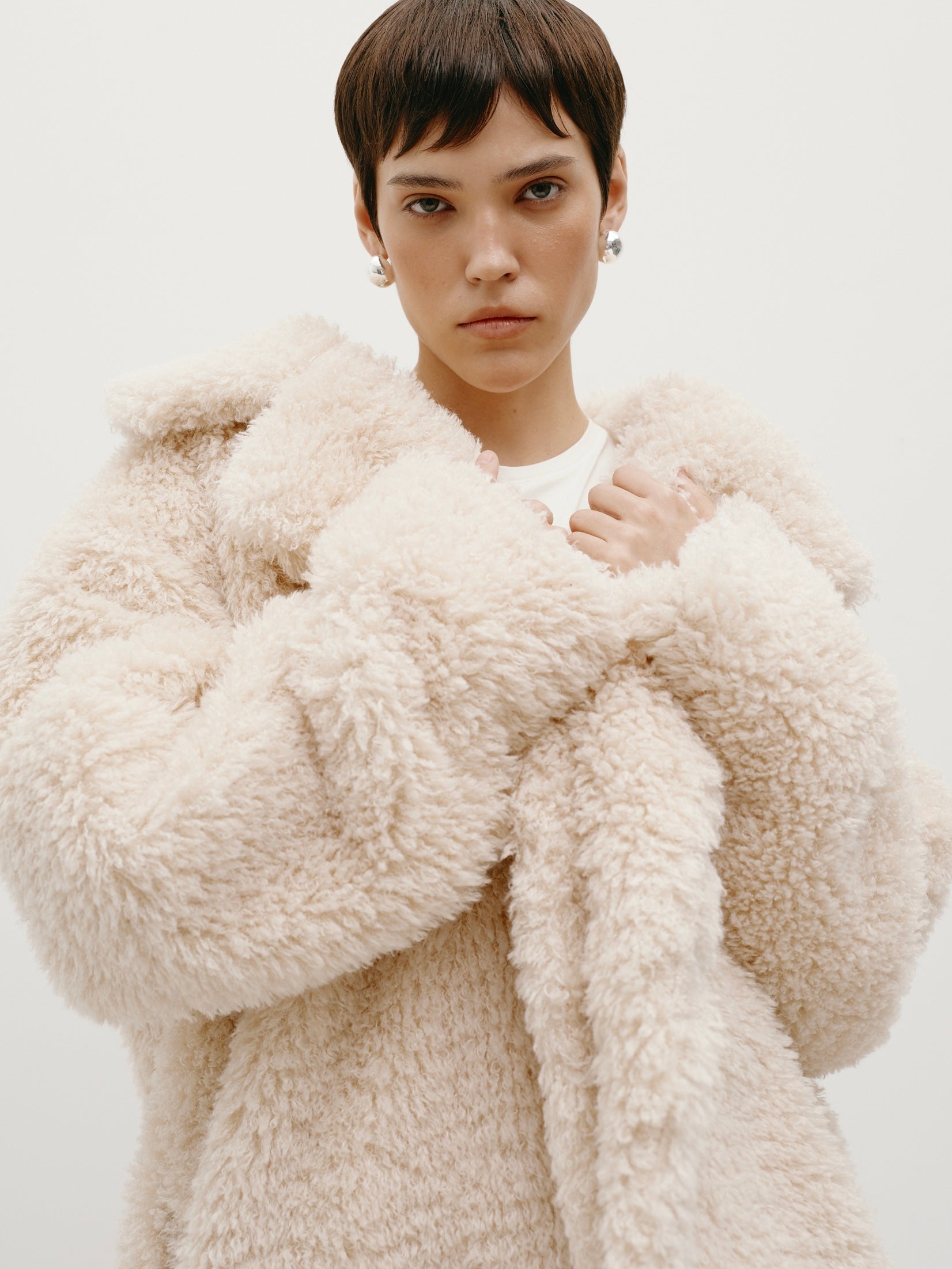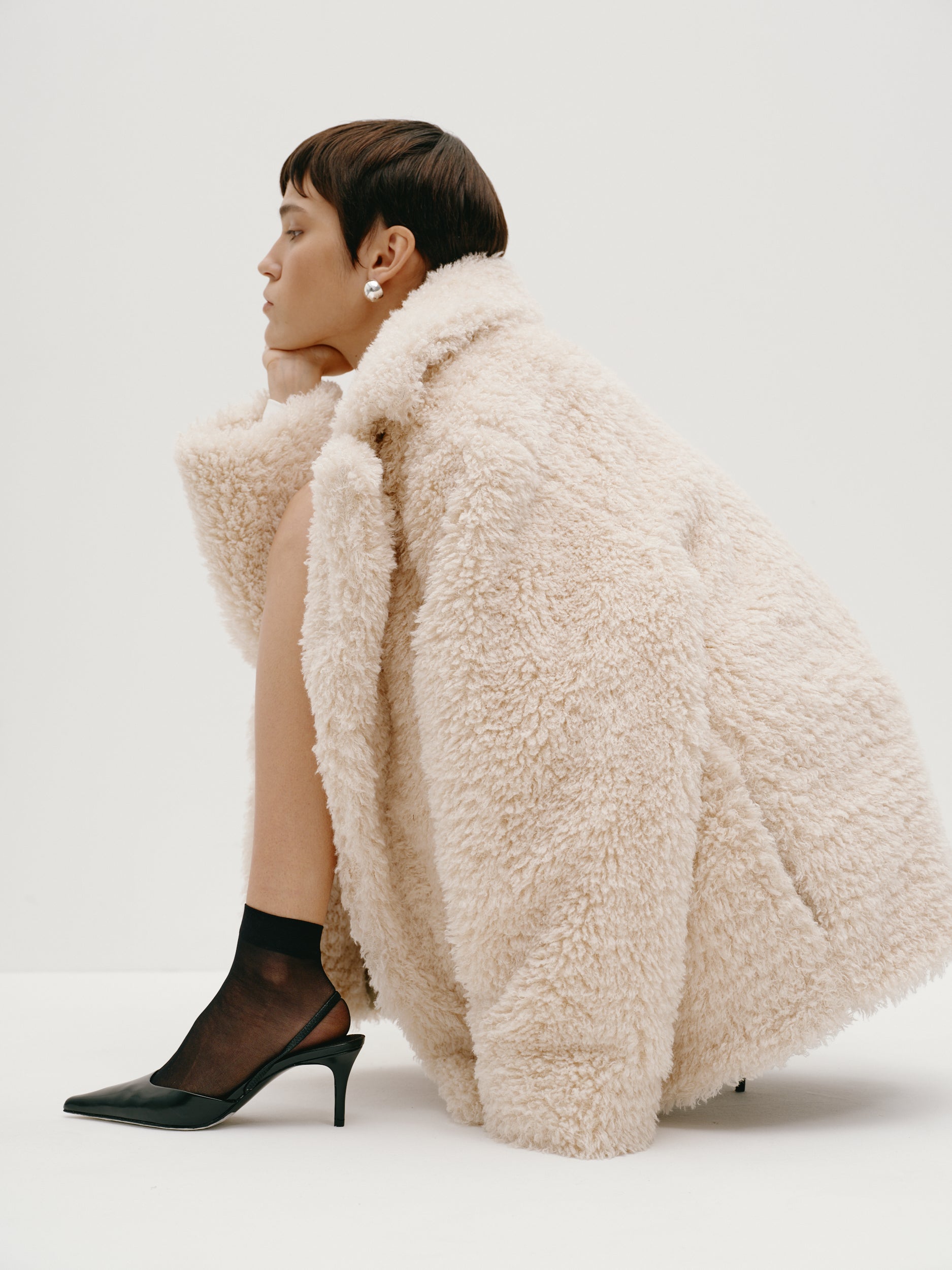 The cream fur coat is a blend of elegance, coziness, and modern style. Its relaxed silhouette adds lightness to the outfit, while the soft texture ensures comfort even on the coldest days. The minimalist design makes the coat versatile: it pairs harmoniously with both classic dresses and heels, as well as everyday casual outfits.