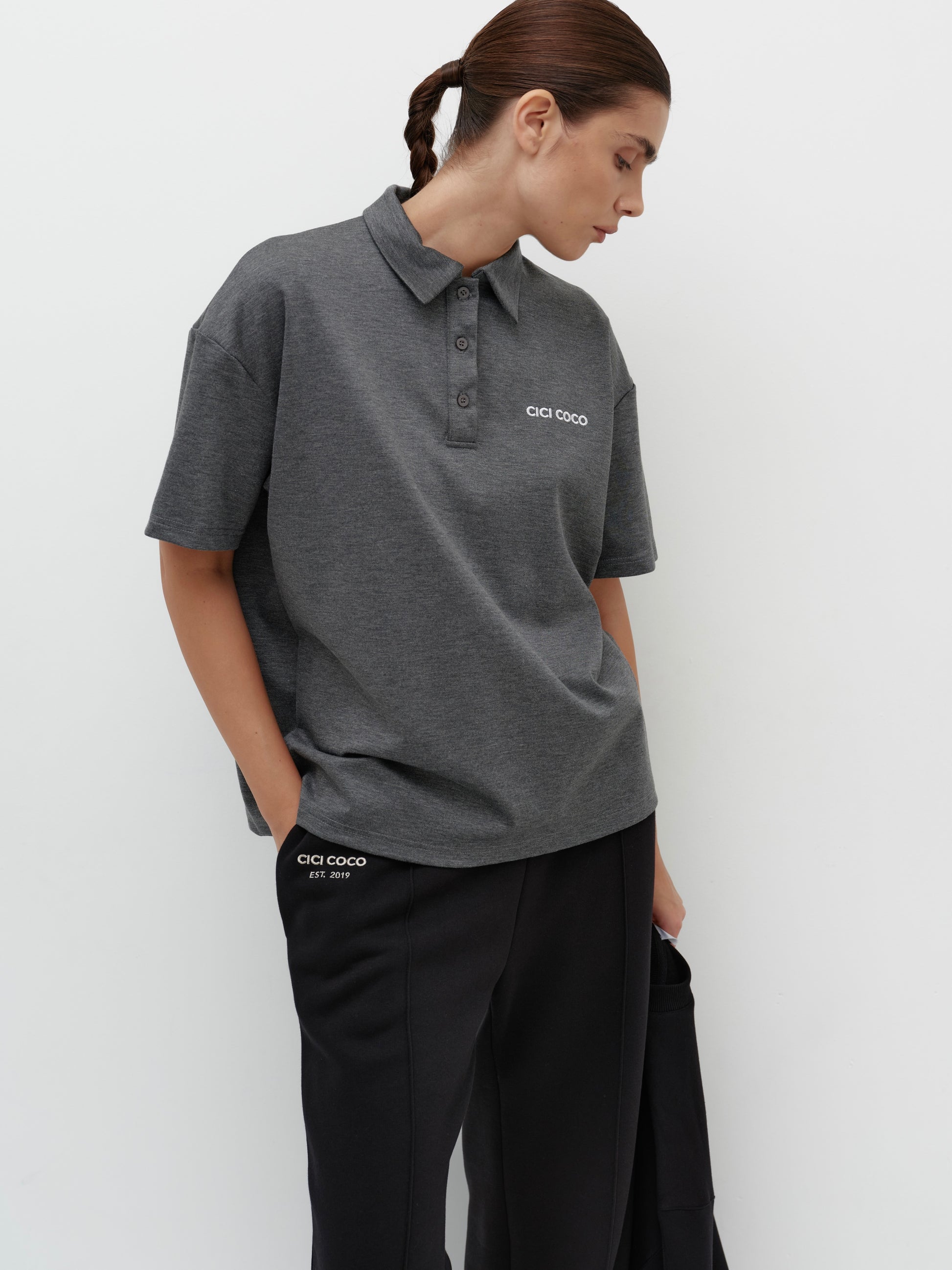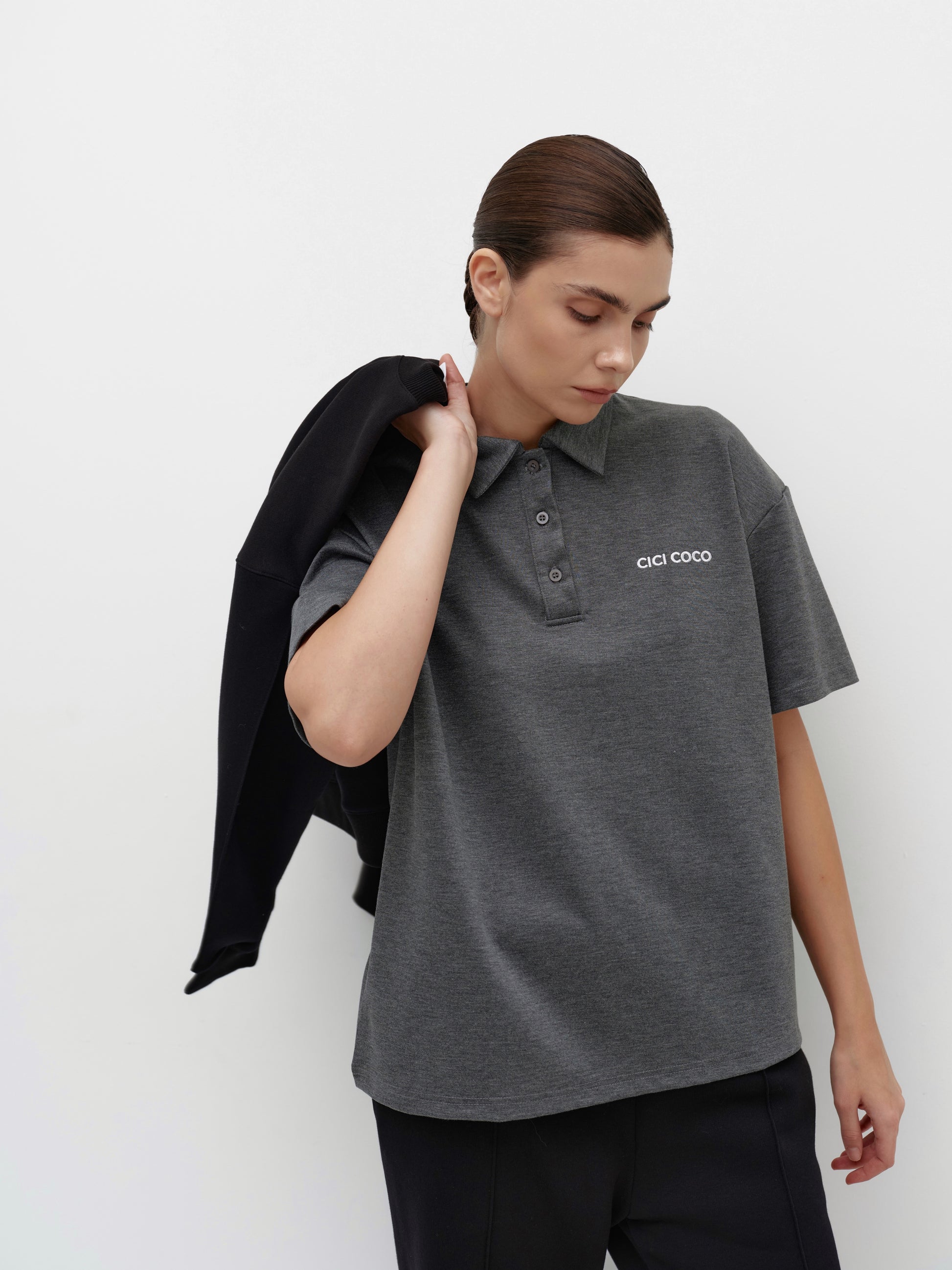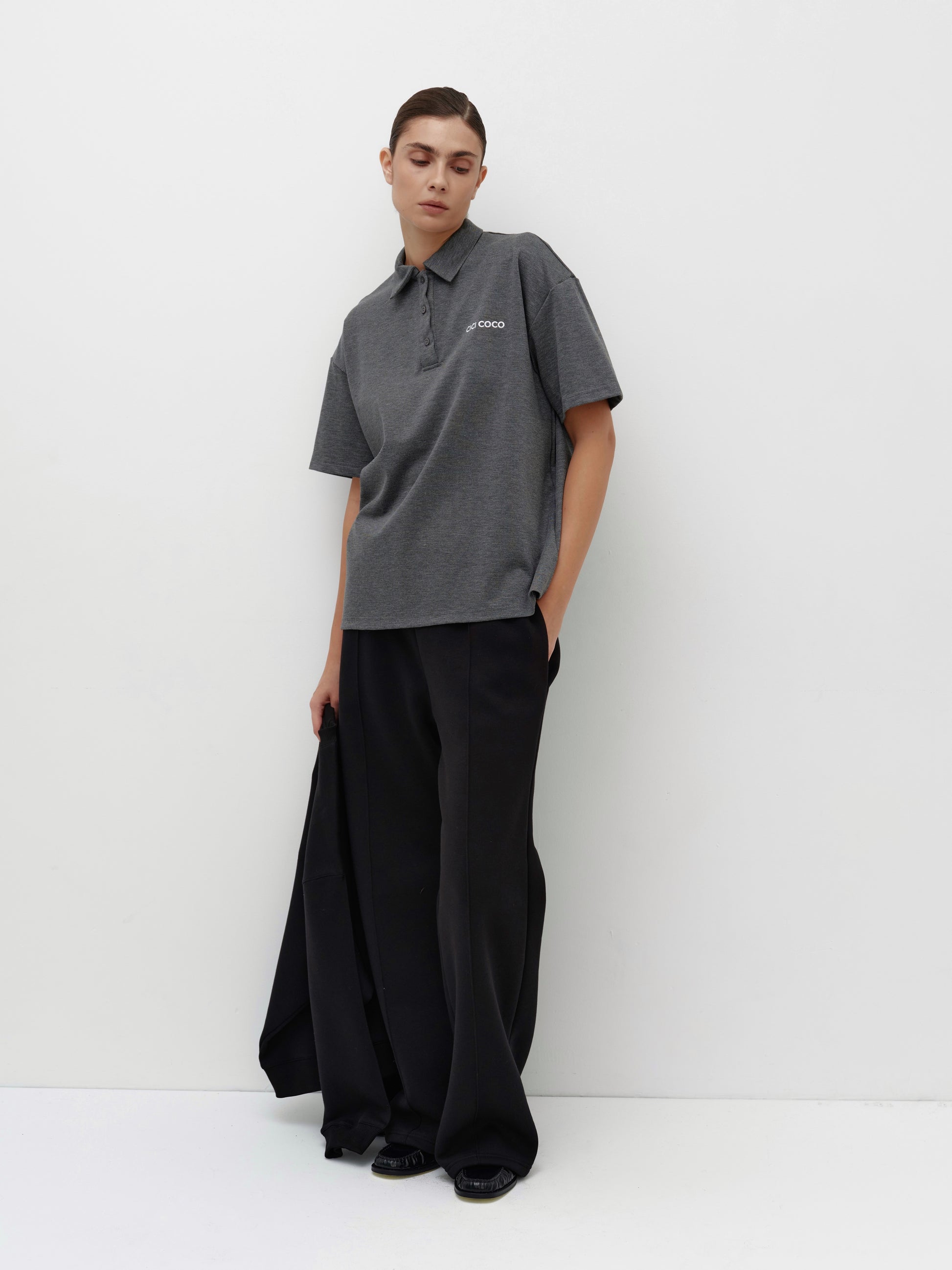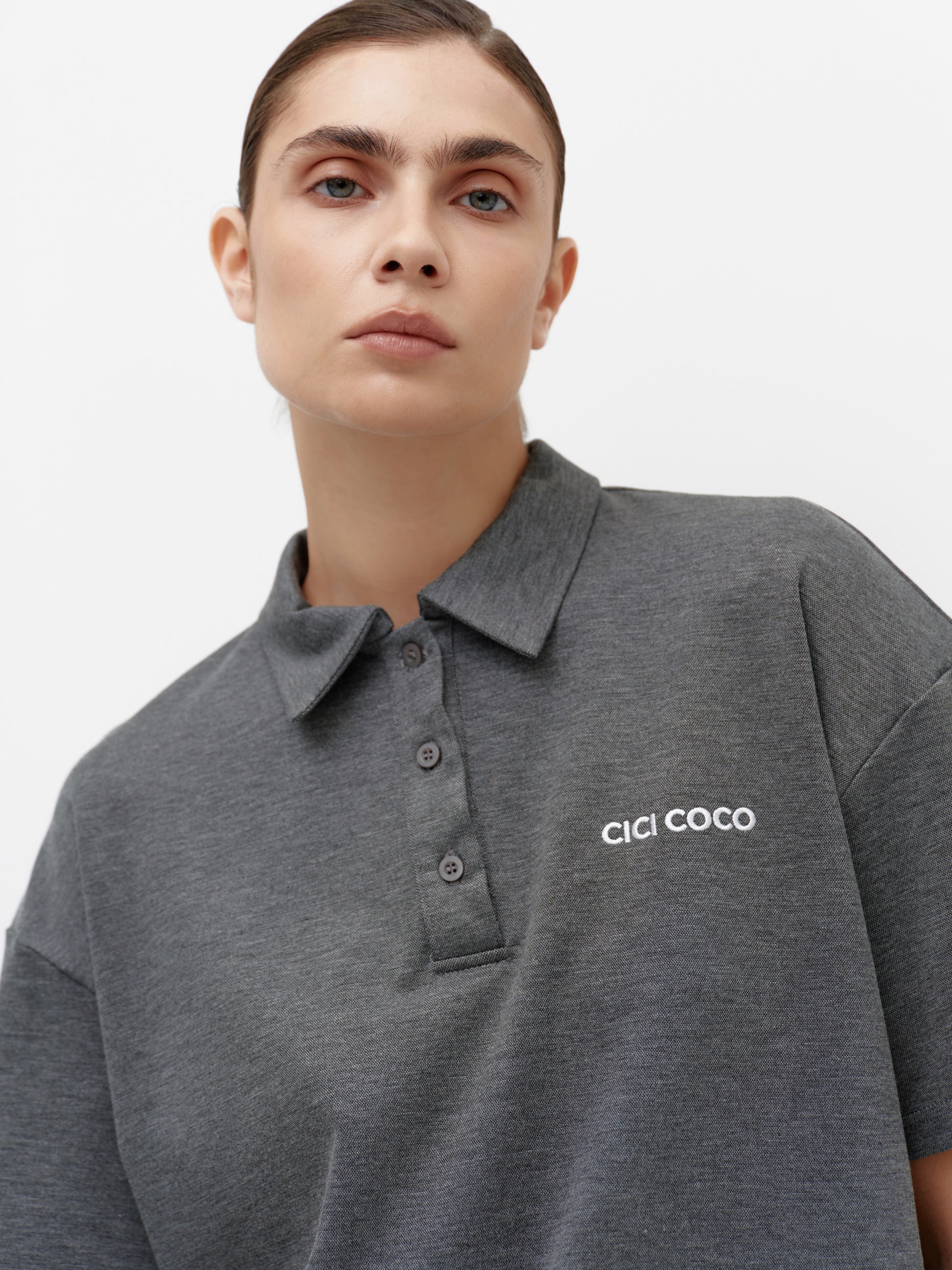 A graphite women's polo t-shirt with a logo is the perfect combination of classic style and comfort. Its simple cut accentuates the silhouette, while the soft fabric ensures a pleasant tactile feel and all-day comfort.