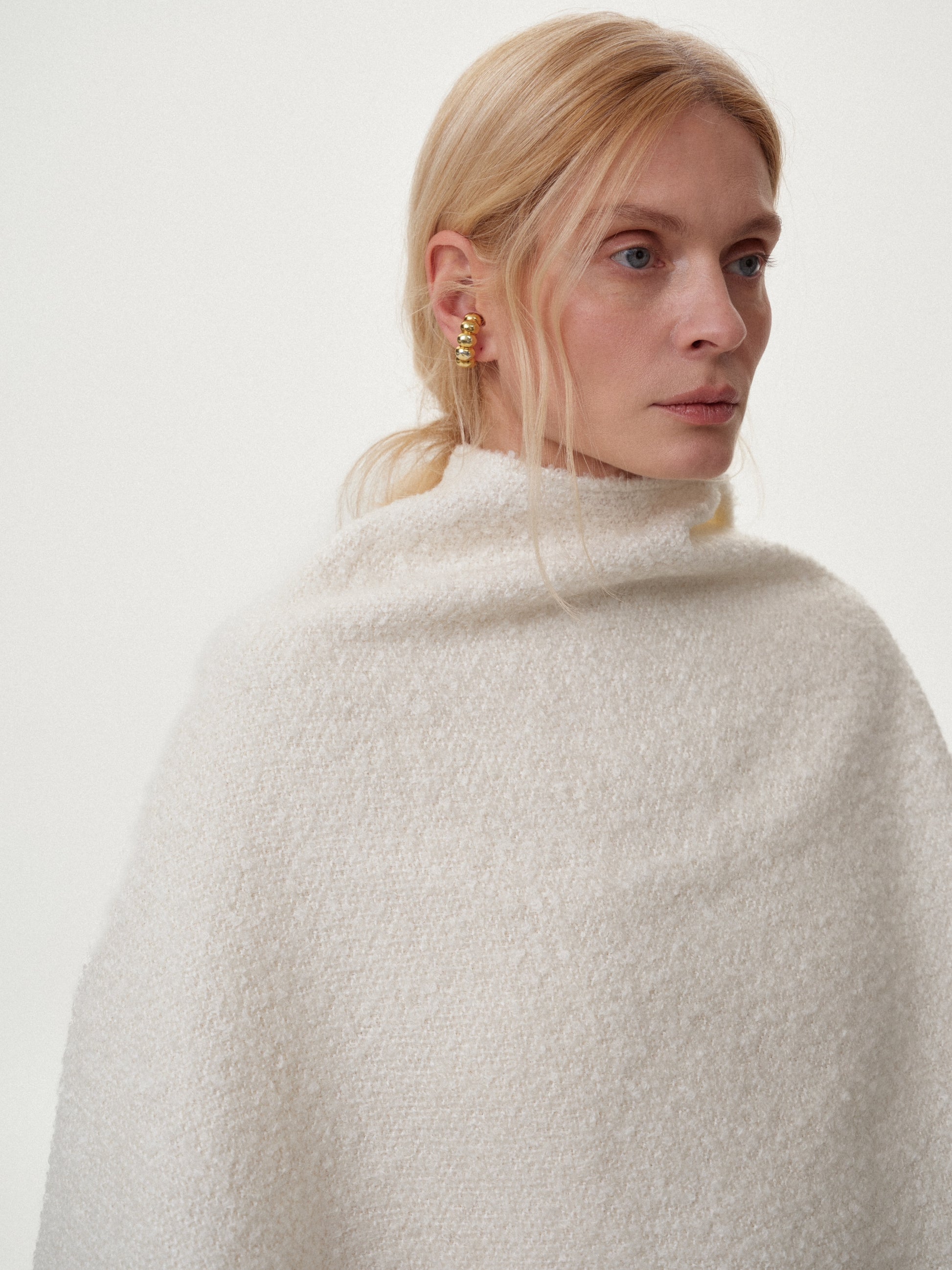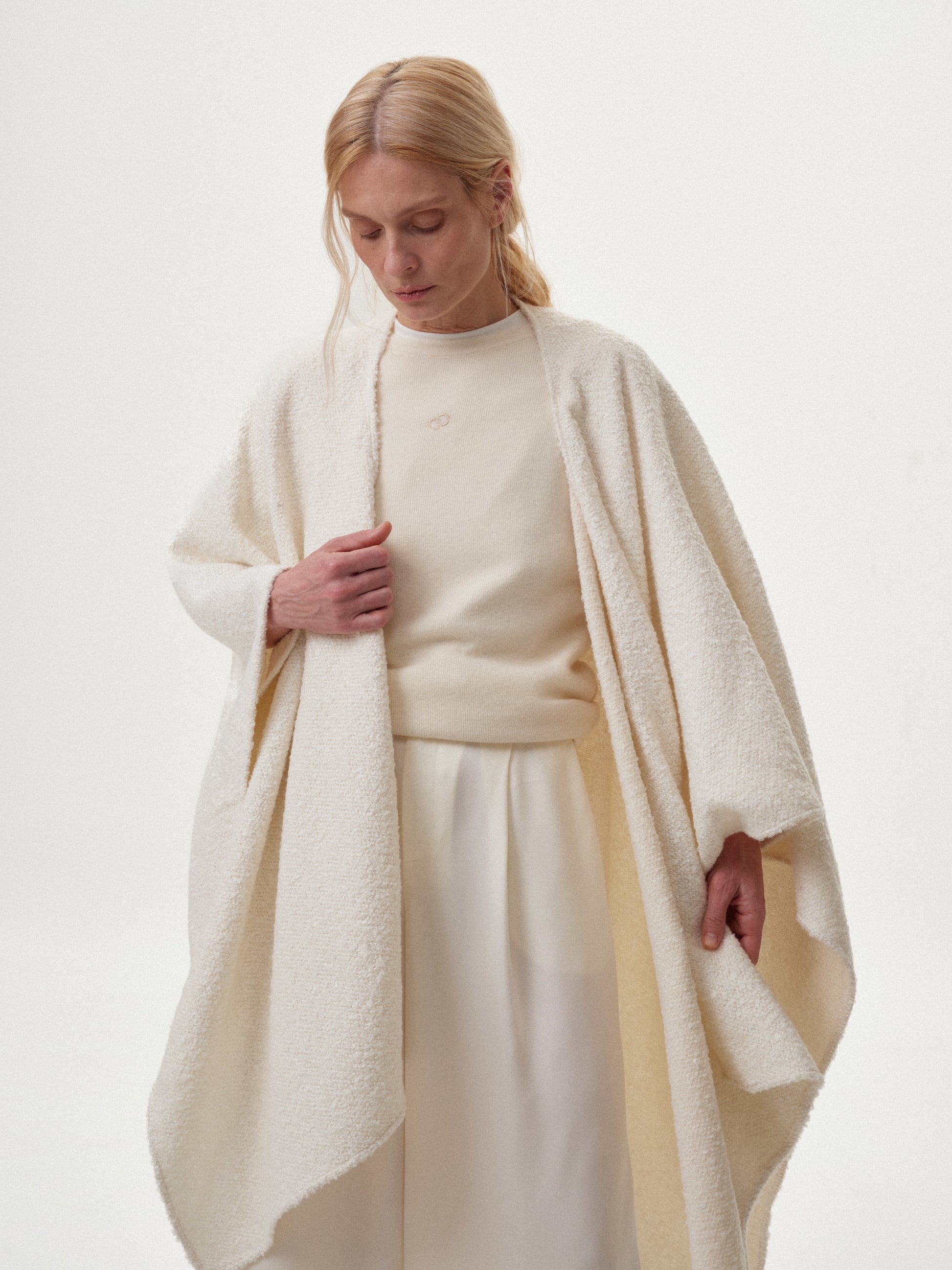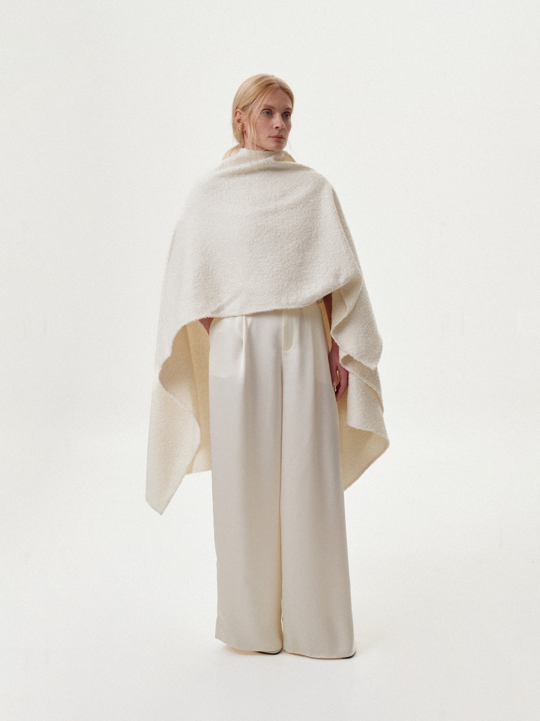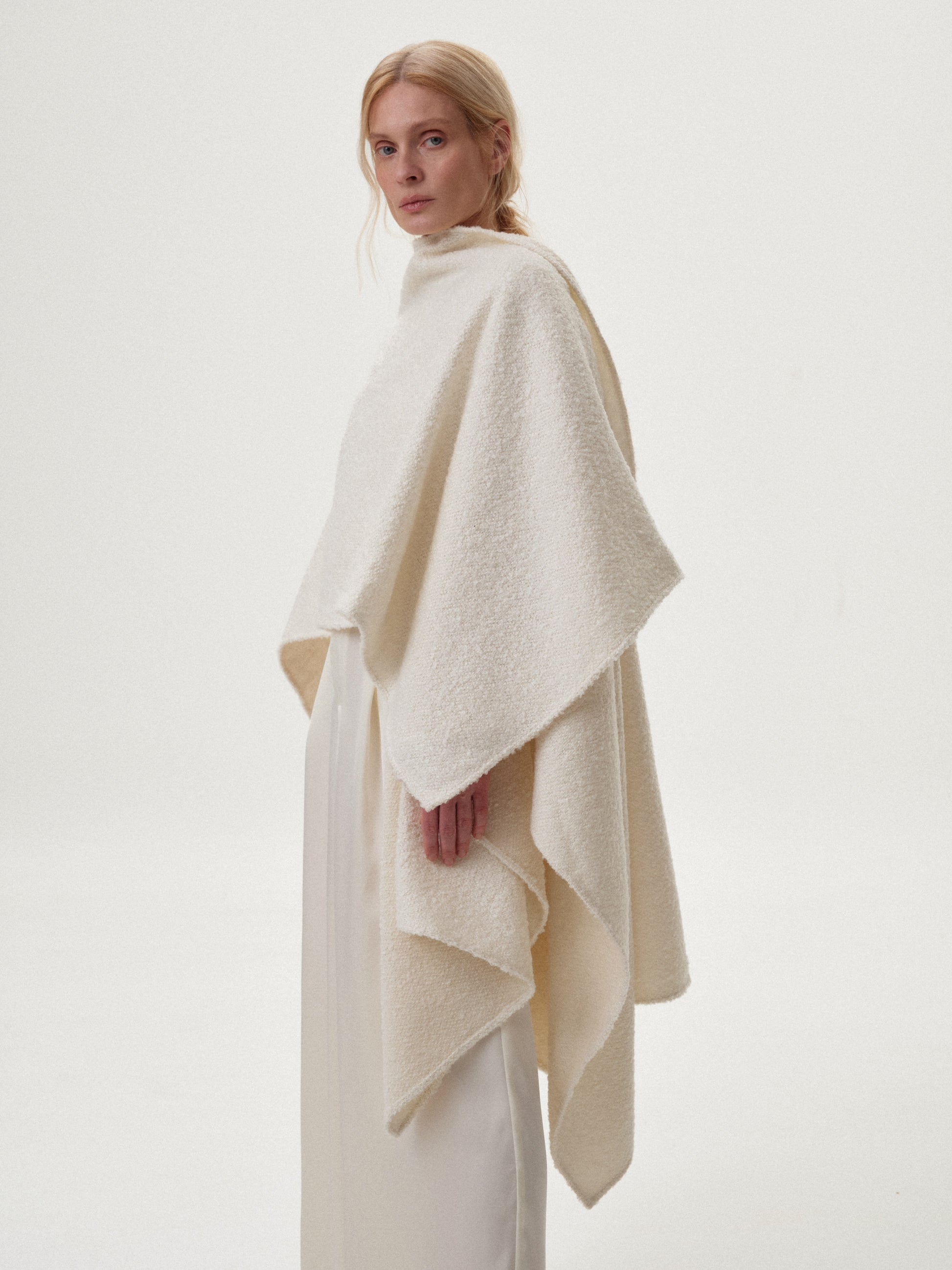 Накидка - пончо букле — це виразний елемент гардероба з м’якою текстурою та вільною пластикою. Об’ємний силует красиво драпірується, створюючи відчуття легкості та затишку, а фактурне букле додає образу глибини й делікатної виразності. Світлий відтінок підкреслює чистоту форми та легко поєднується з базовими речами сезонного гардероба.