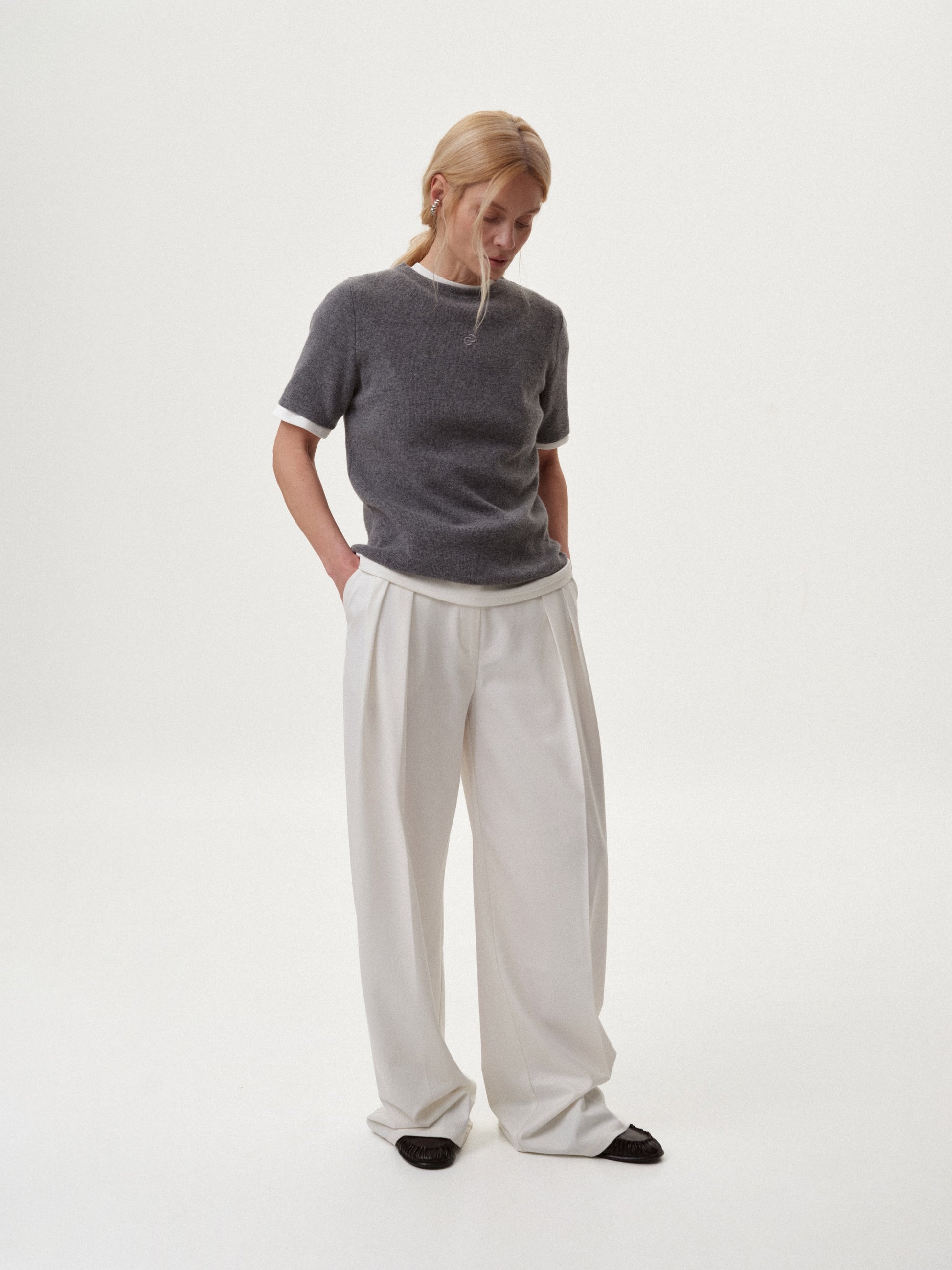 Pair the milk-white palazzo trousers with a blazer for a refined feminine look, adding heels to complete the ensemble. Alternatively, create a business outfit by choosing classic ballet flats or loafers. These trousers also fit effortlessly into casual looks when combined with shirts, sweaters, or turtlenecks.