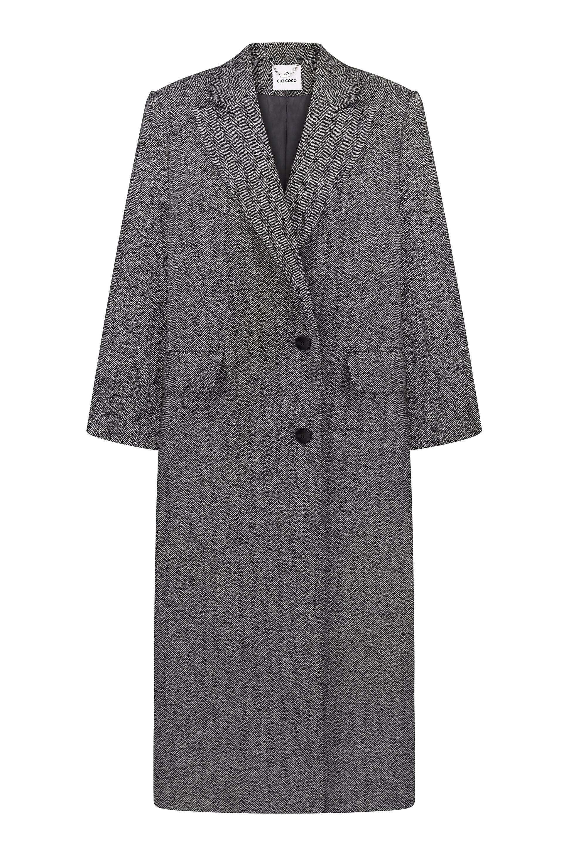 The straight cut and original print create an elegant yet modern look. The black and white combination makes this model versatile, easily pairing with different colors and styles. The coat fastens with a button, adding convenience and elegance.