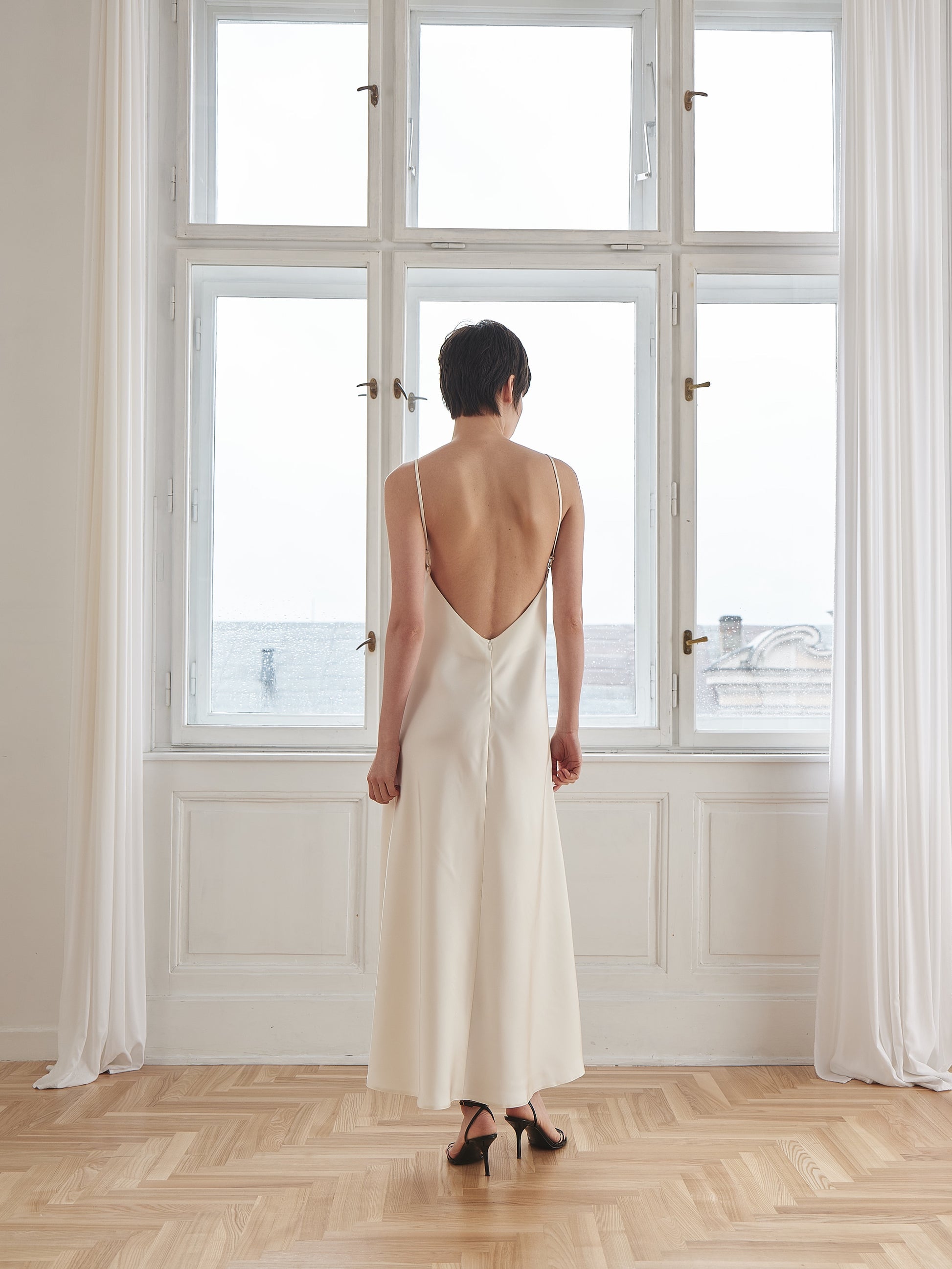 Сатинова молочна сукня з вирізом на спині