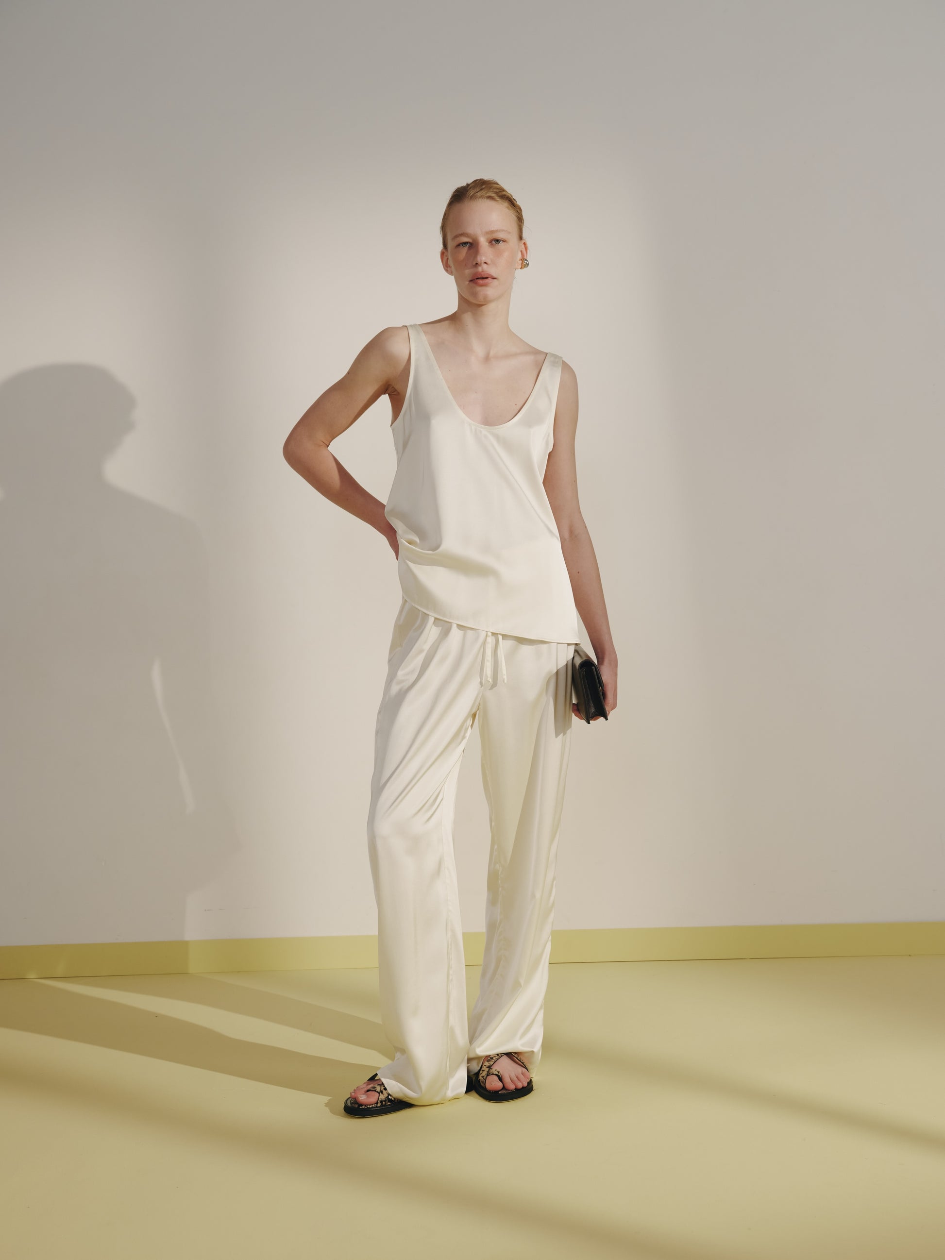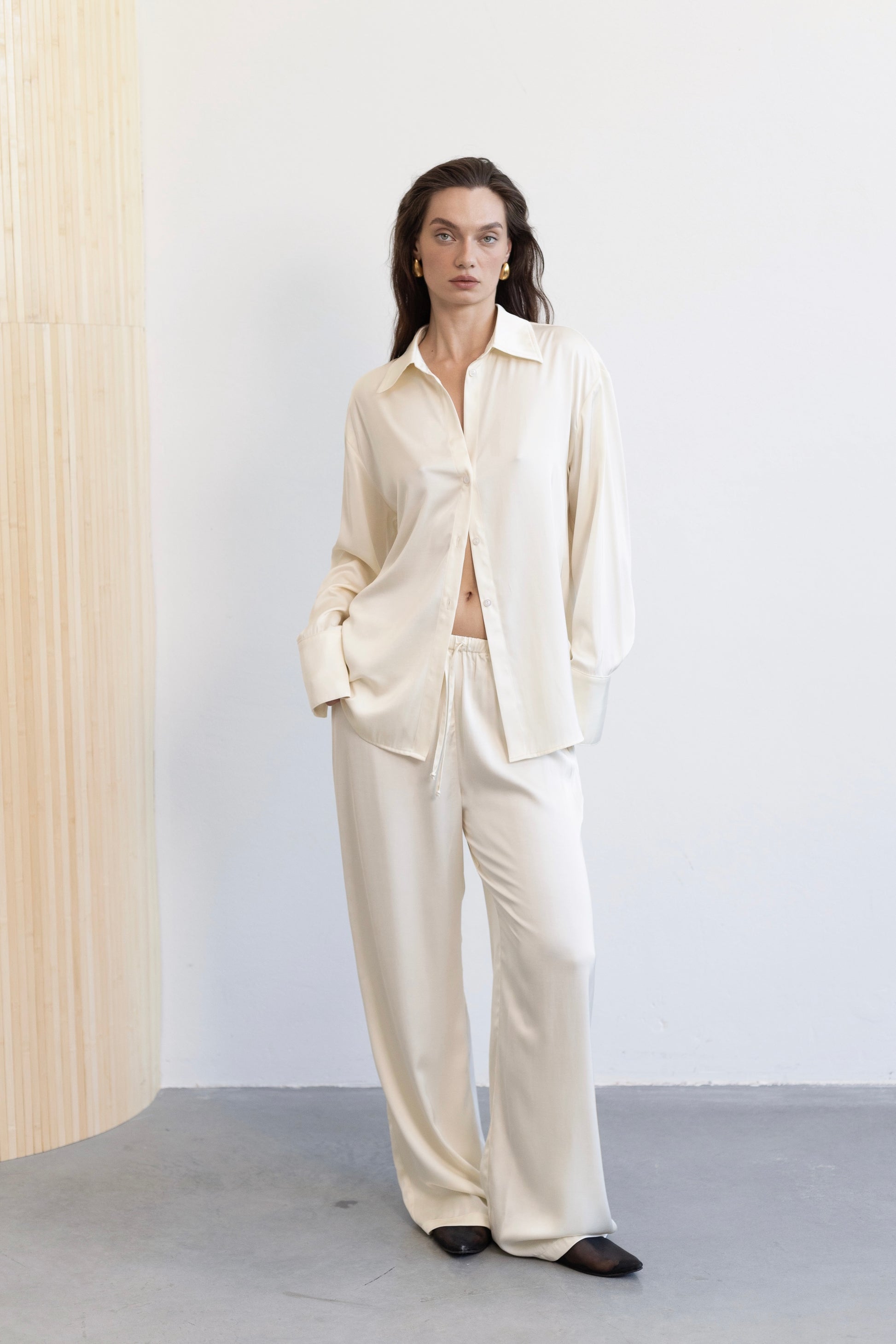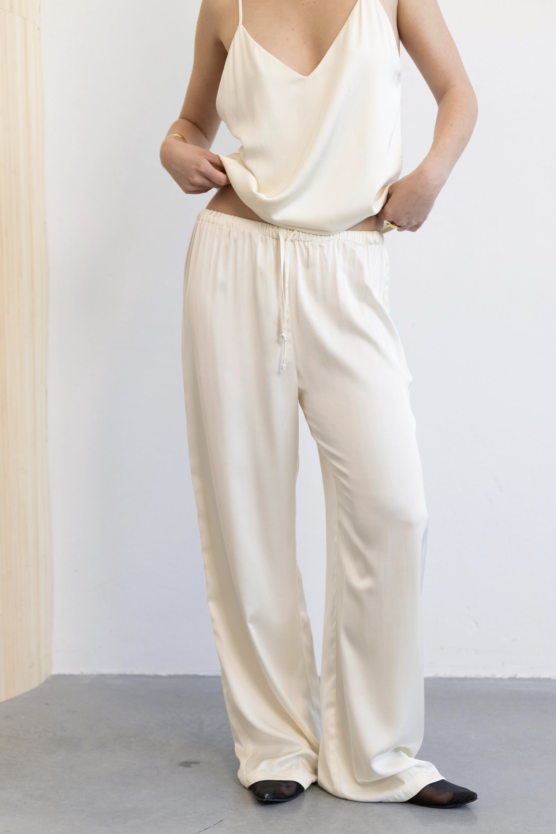 The satin fabric is soft to the touch, has a light sheen, and adds refinement to the outfit. The loose cut and thoughtful design make these trousers a versatile wardrobe essential.