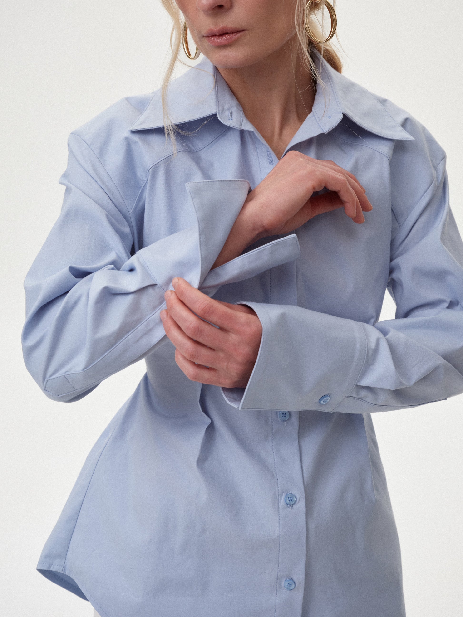 Сорочка блакитна з акцентом на талію – це поєднання класичного крою та делікатного підкреслення силуету в оновленій кольоровій інтерпретації. Чіткий комір і лаконічні лінії зберігають стриманий характер, а акцент на талії формує витончену, зібрану пропорцію. Блакитний відтінок додає образу свіжості та легкості, дозволяючи інтегрувати сорочку як у спокійні базові комплекти, так і в більш яскраві або контрастні стилізації сезону.
