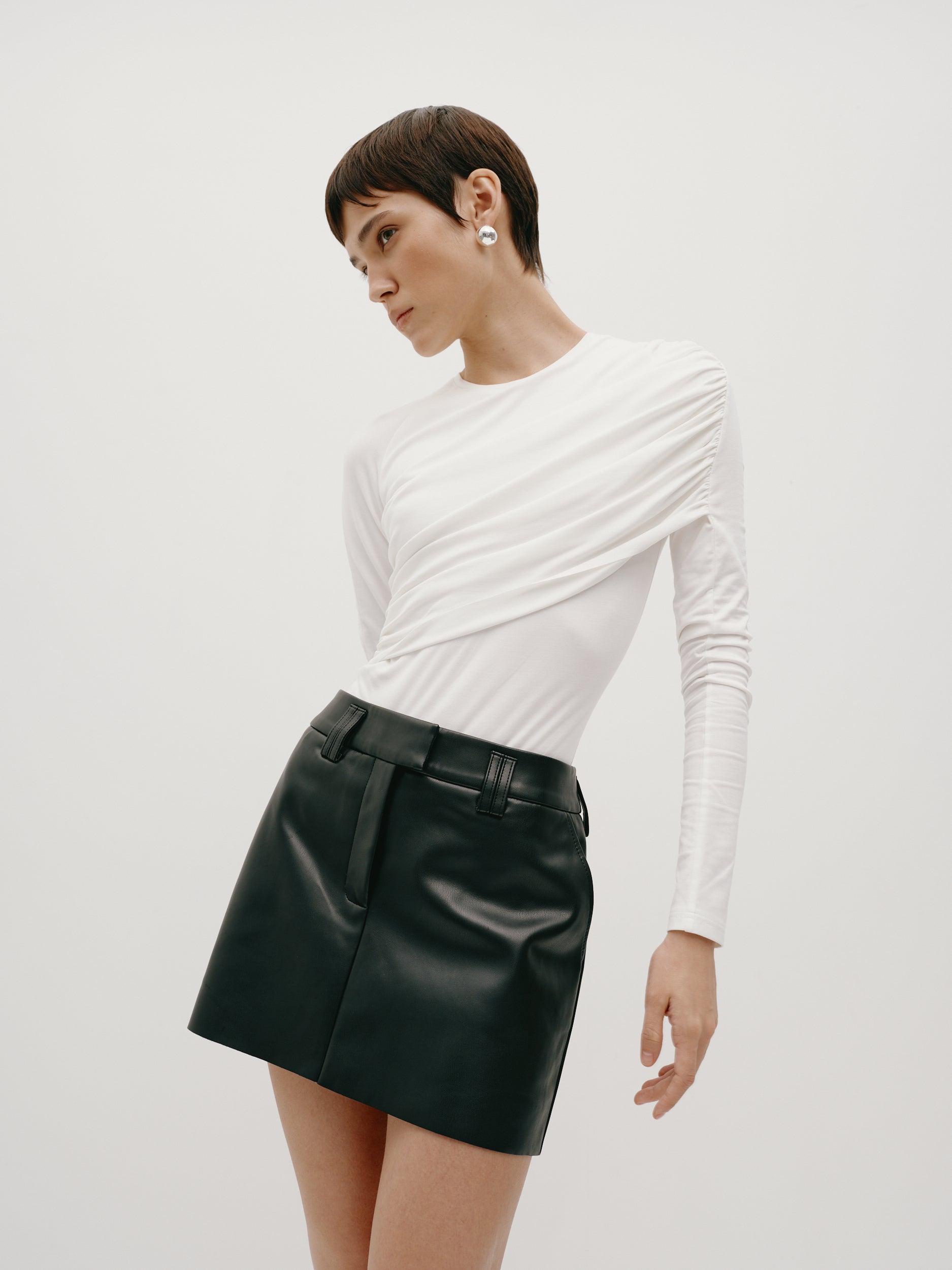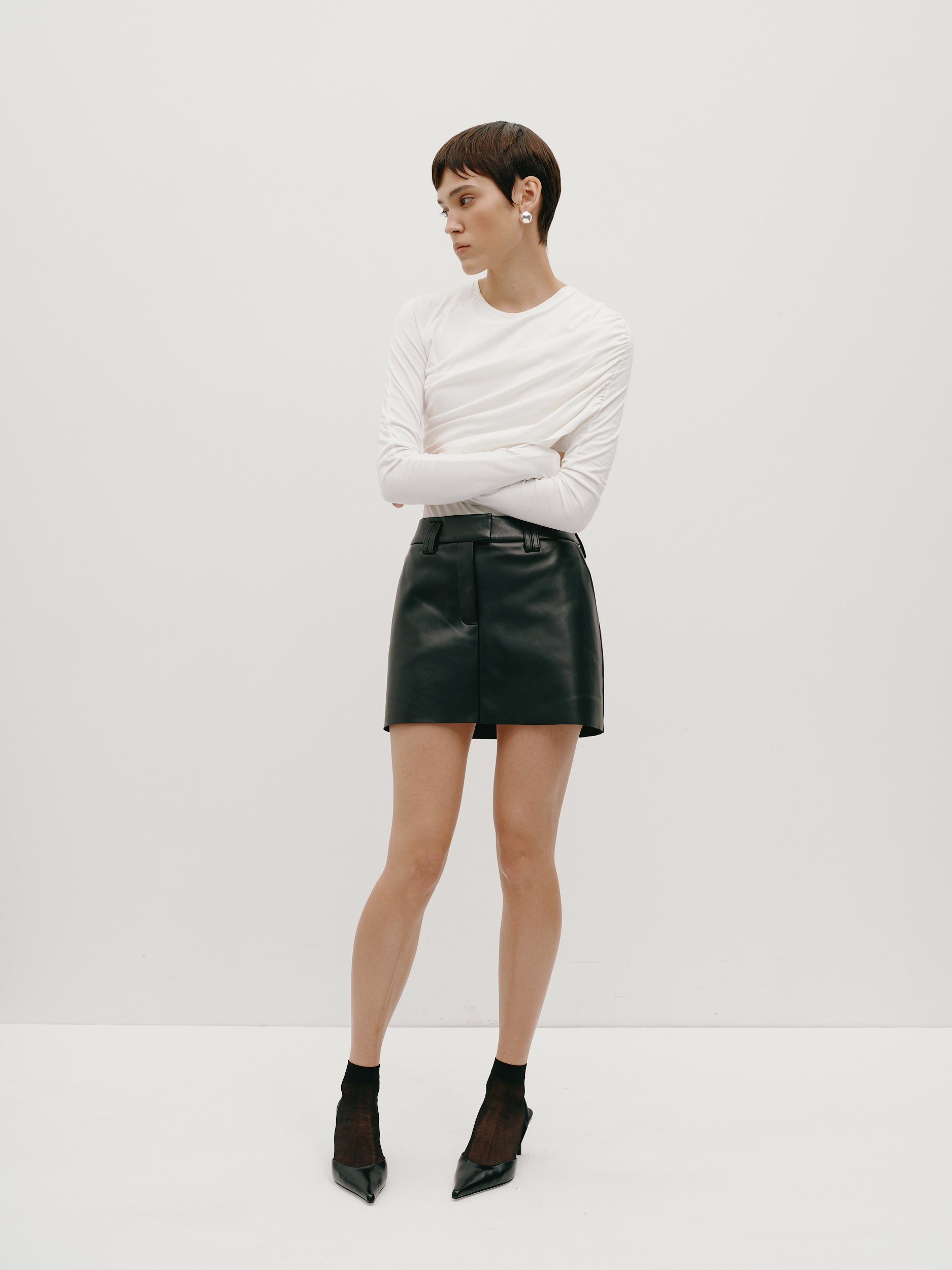 If you buy the black eco-leather mini skirt, it will become a versatile addition to your wardrobe, perfectly pairing with both classic blouses and jackets, as well as with light tops or sporty t-shirts. This skirt is ideal for evening outings, fashion experiments, and stylish combinations.