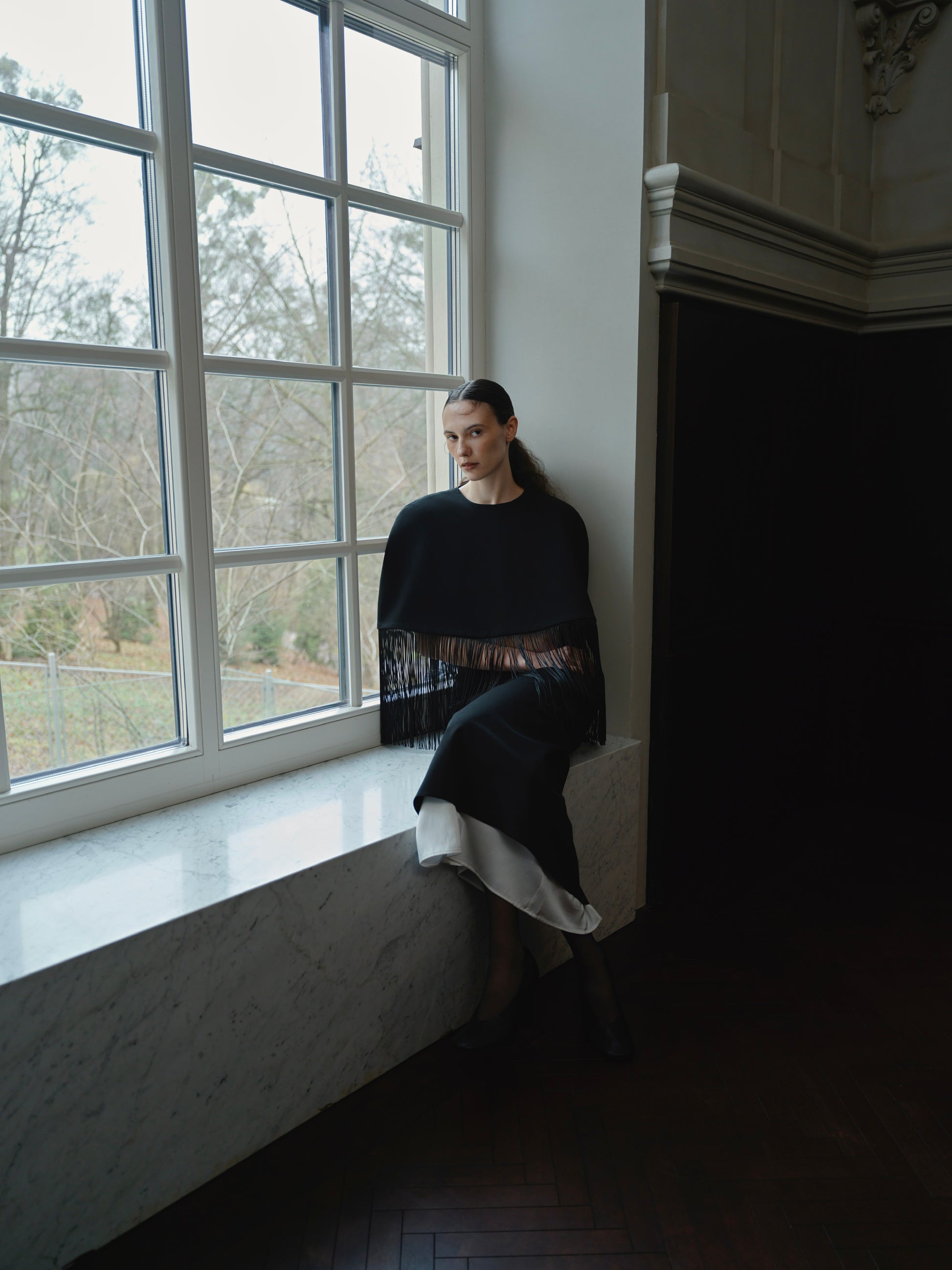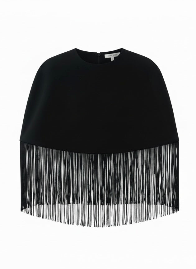 Структурований чорний кейп з бахромою – це виразний акцент одягу, що поєднує елегантність і сучасний характер. Чітка форма створює ефектний силует, а динамічна бахрома додає руху та робить образ більш живим і стильним. Застібка на замок ззаду забезпечує акуратну посадку та чистий мінімалістичний вигляд. Такий кейп легко поєднується як з класичними, так і з вечірніми сетами, додаючи образу драматичності та впевненості.