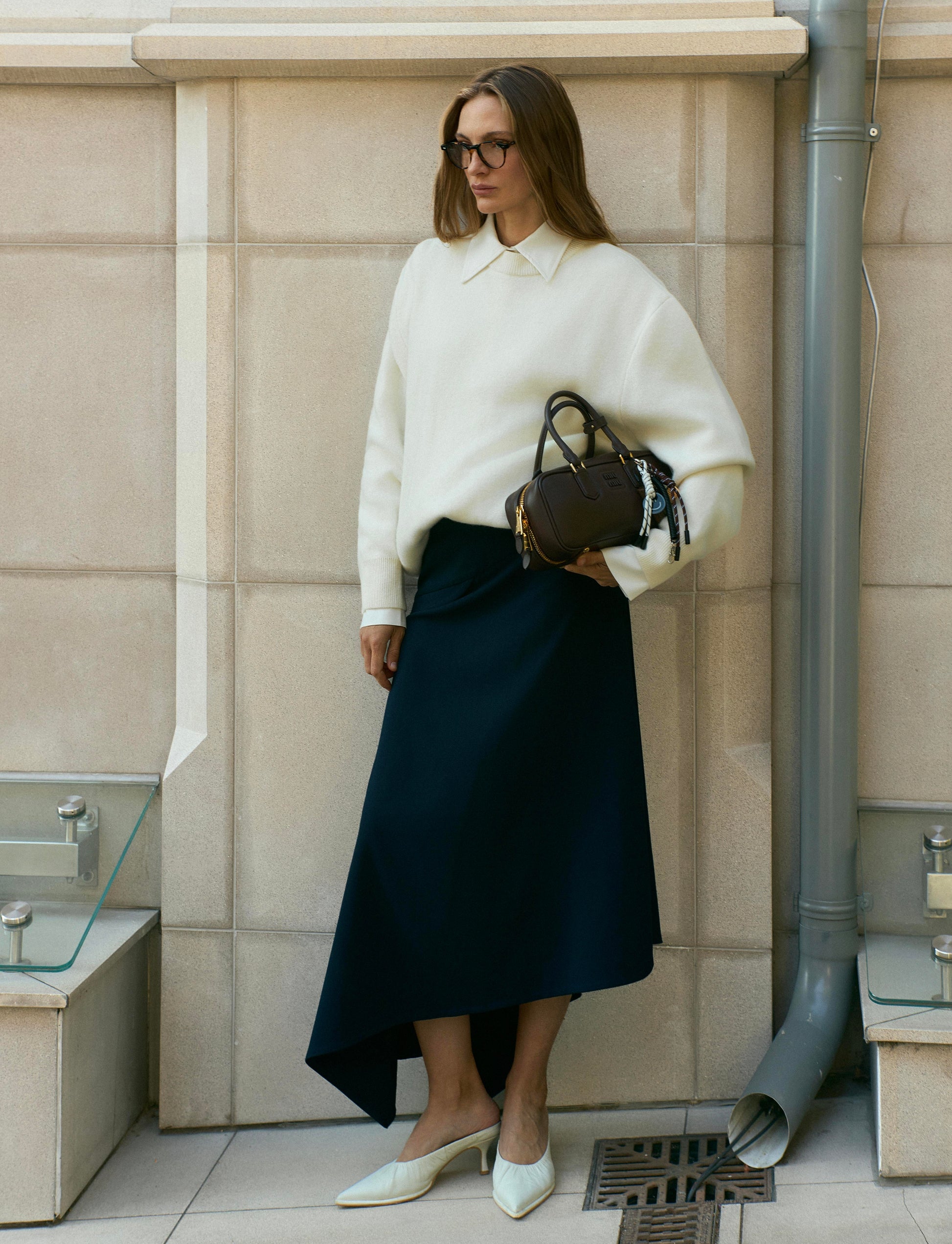 Thanks to its neutral ivory shade, the sweater easily pairs with suit trousers, jeans, skirts, or even over dresses. You can wear it on its own or complement it with a jacket for a more elegant look.