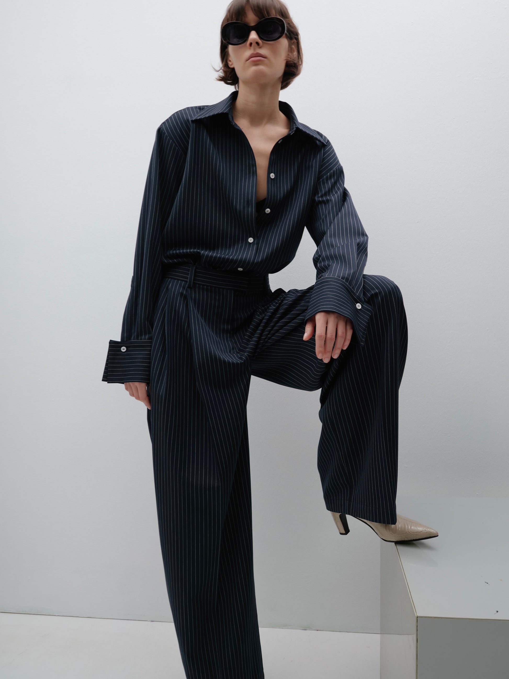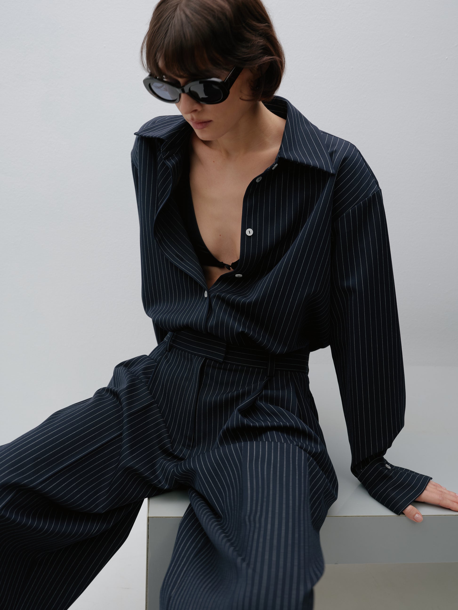 Синя жіноча сорочка-боді у смужку – це поєднання класики та сучасного комфорту. Вона створена з легкої тканини, що приємно прилягає до тіла та забезпечує зручну посадку протягом усього дня. Стриманий принт у смужку додає виробу динаміки, а силует боді гарантує ідеальну посадку. Така модель легко поєднує в собі елегантність сорочки та практичність базового боді.