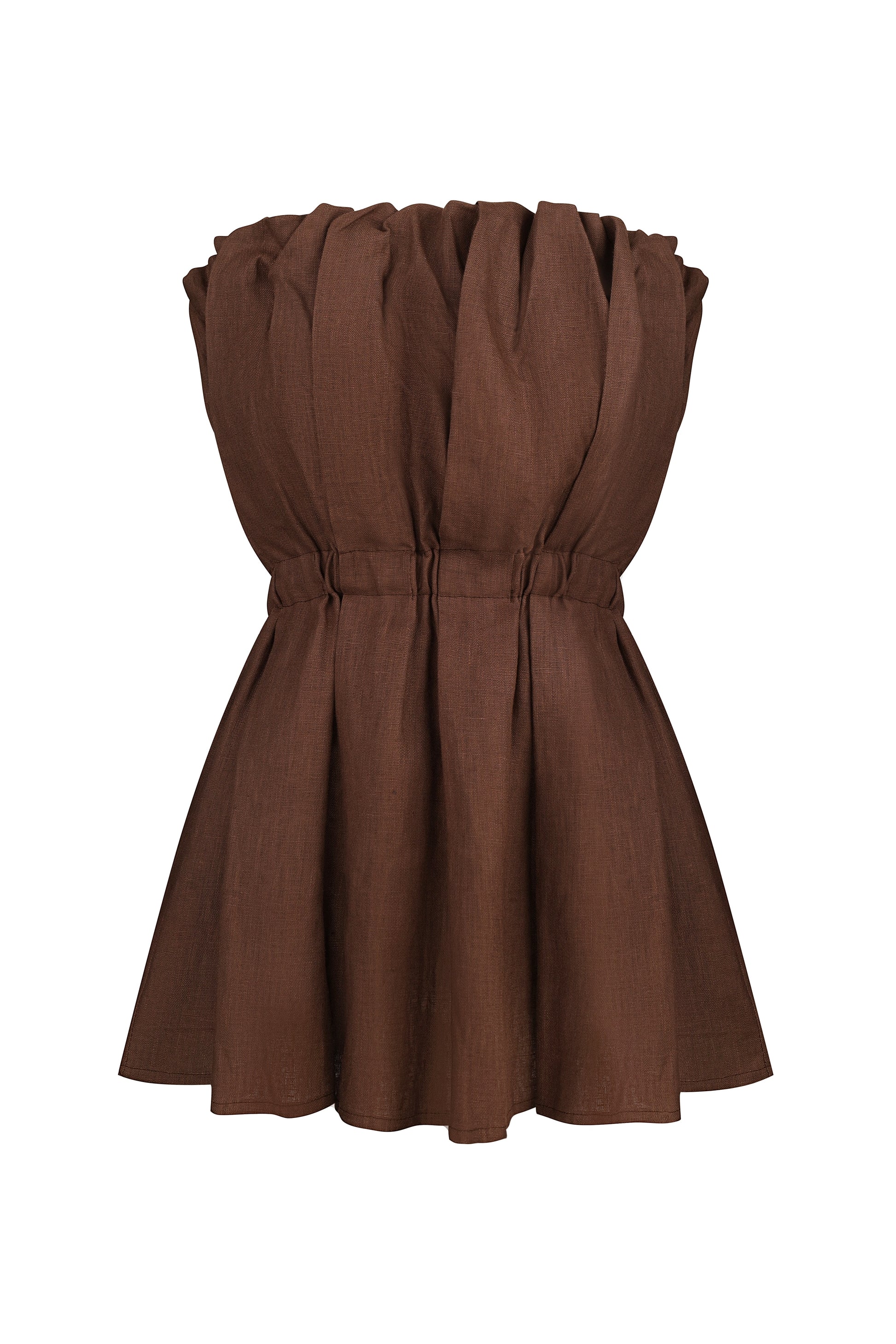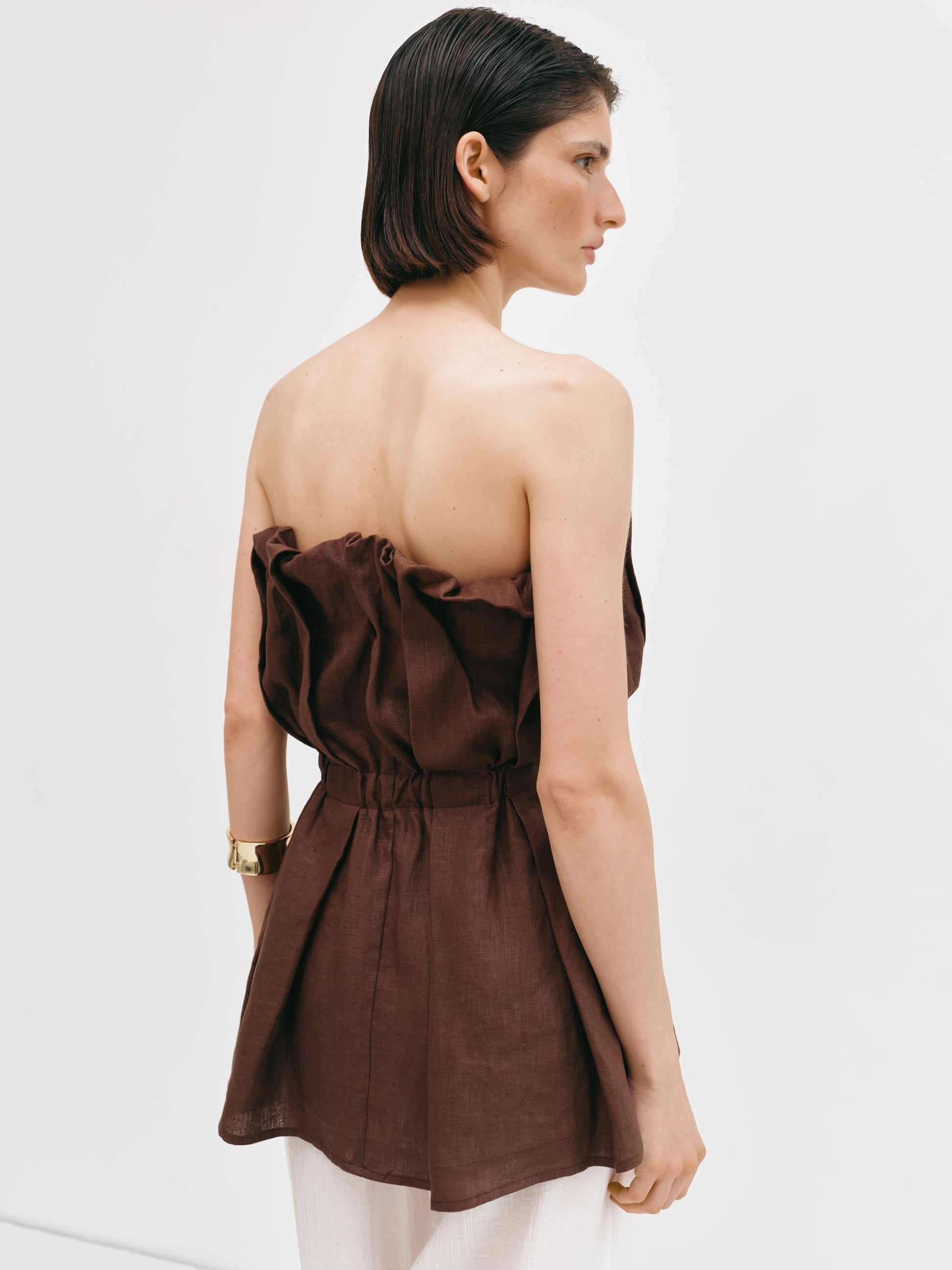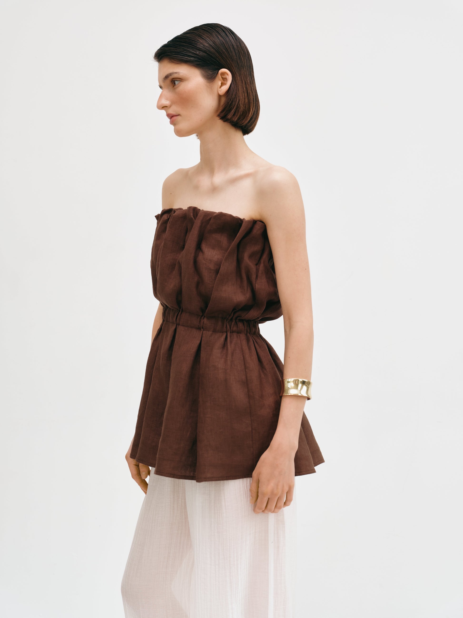 Жіночий топ - буф бандо коричневий — це втілення ніжності, жіночності та актуальної романтики в сучасному стилі. Об’ємна форма додає образу легкості, а відкриті плечі делікатно підкреслюють лінію шиї та ключиць.