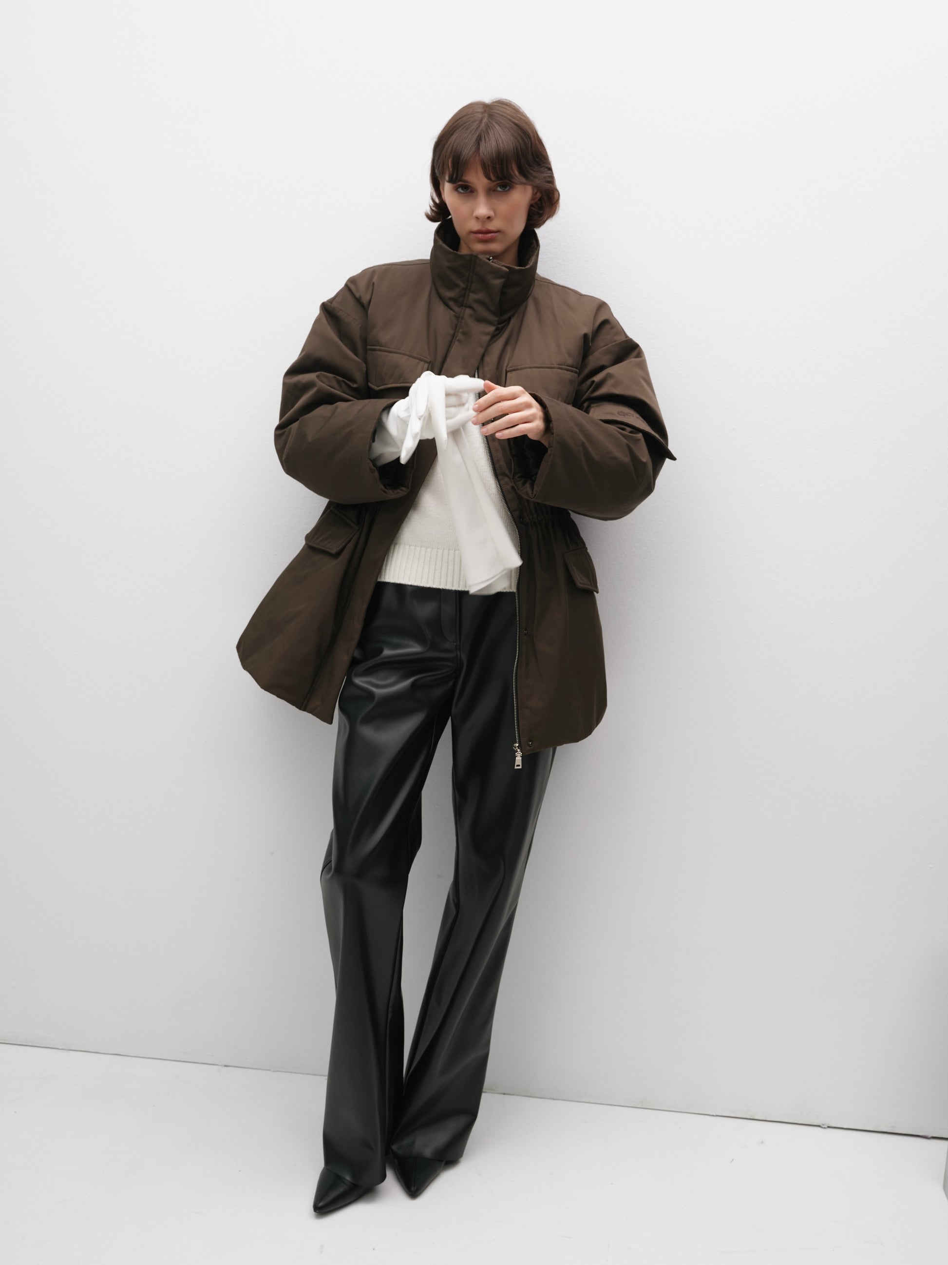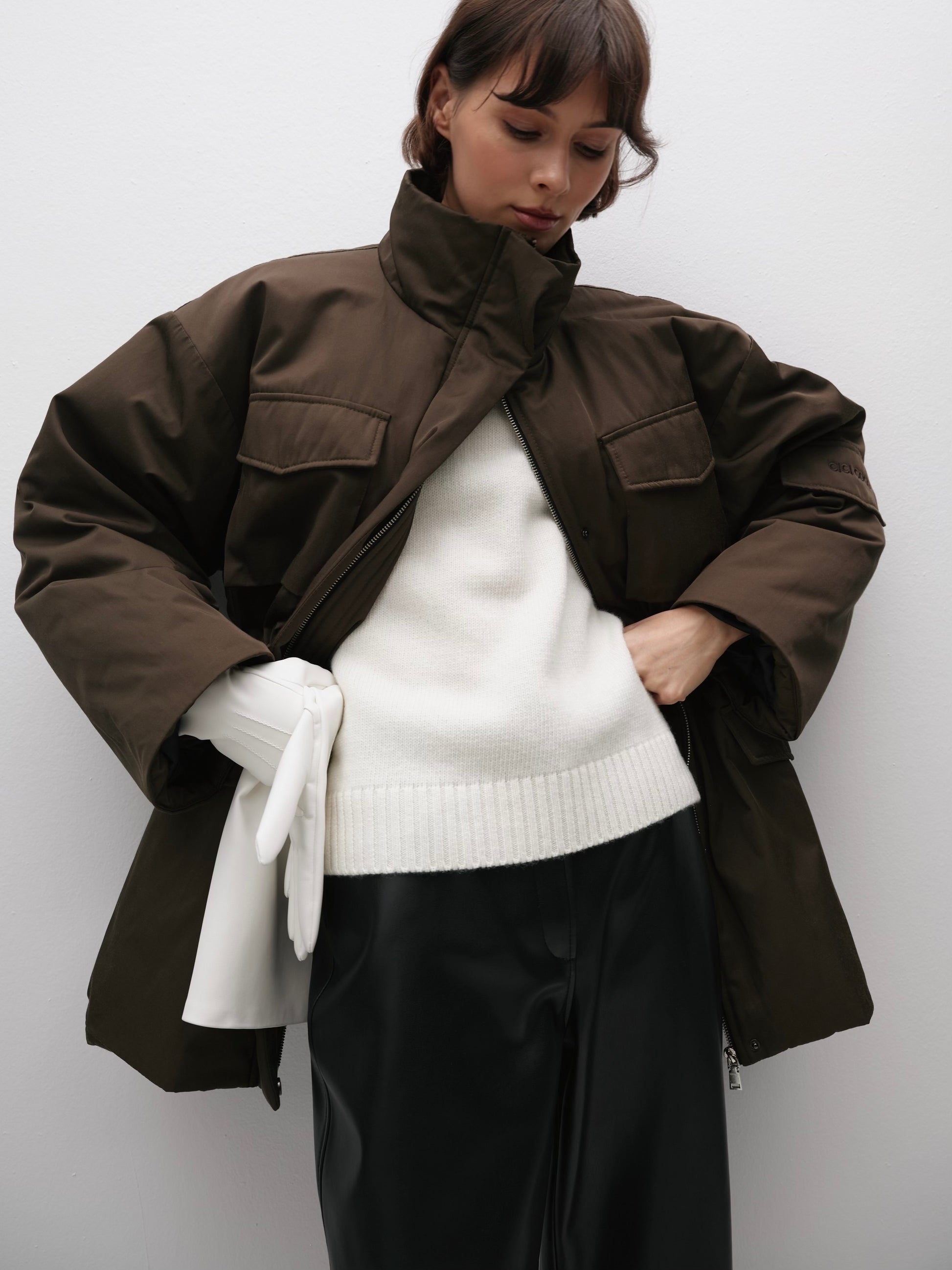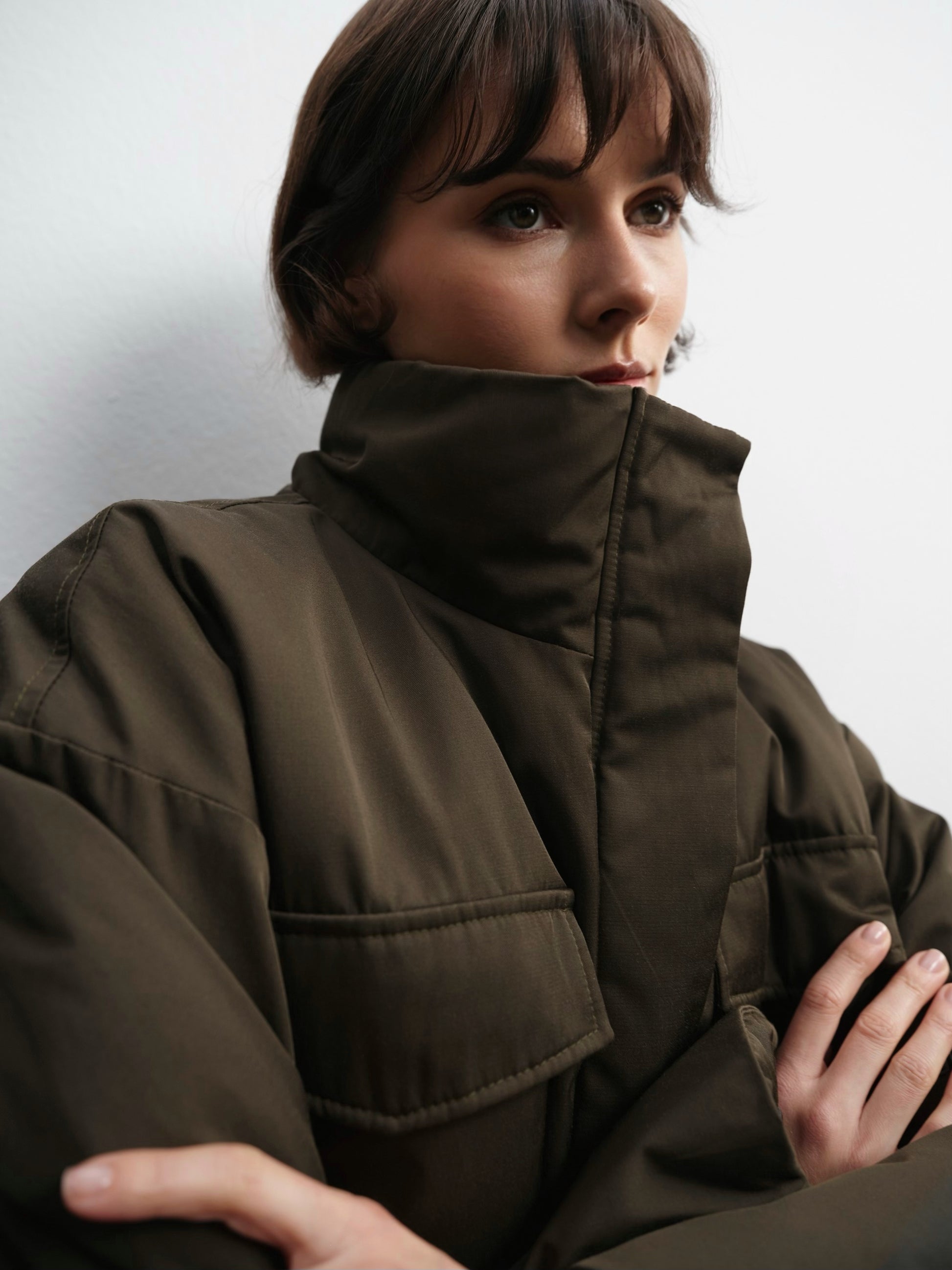 Парка хакі чудово поєднується з джинсами, трикотажними сукнями чи спортивними образами. Додайте масивне взуття або черевики — і отримаєте комфортний, але водночас трендовий міський лук.