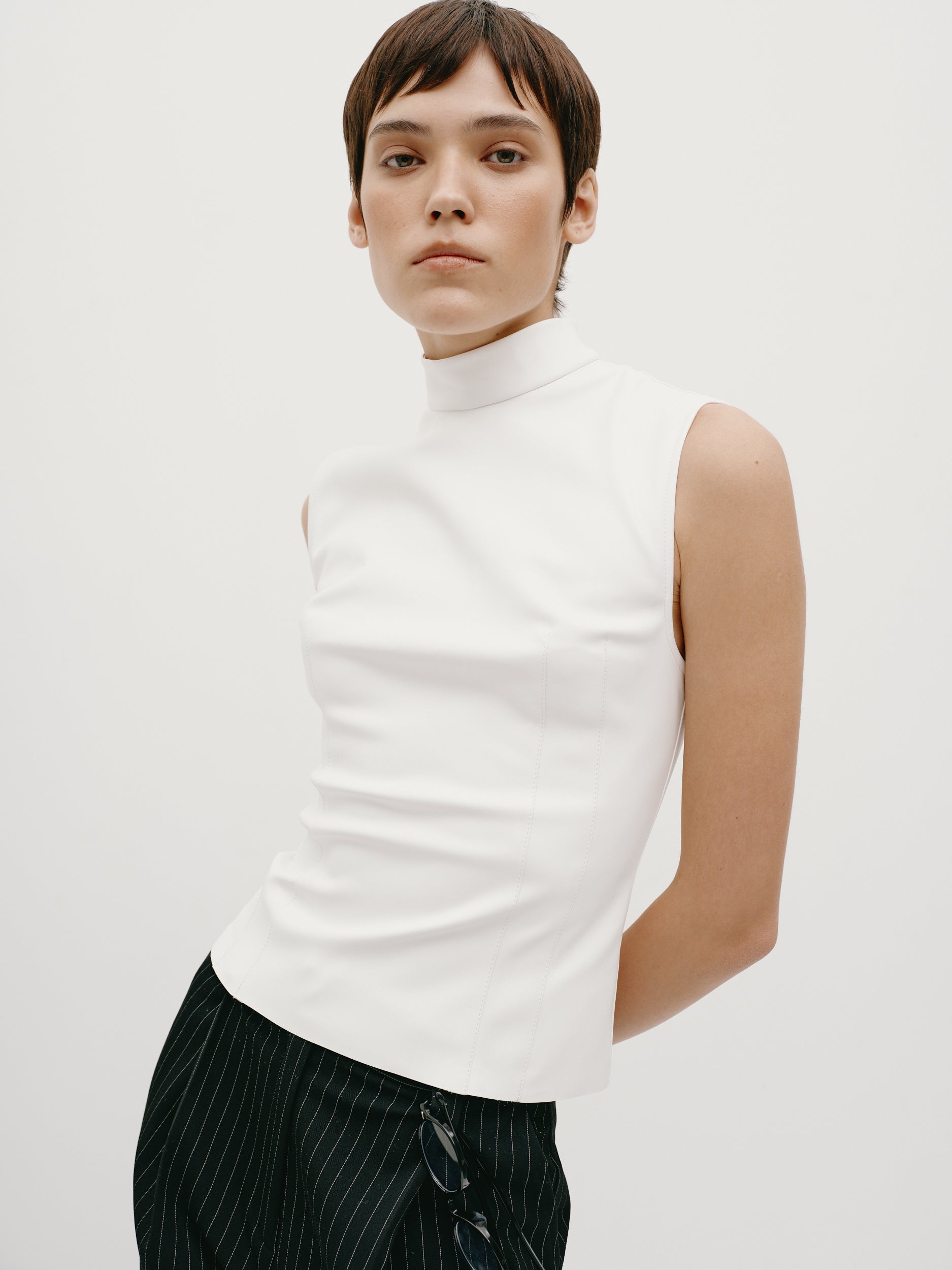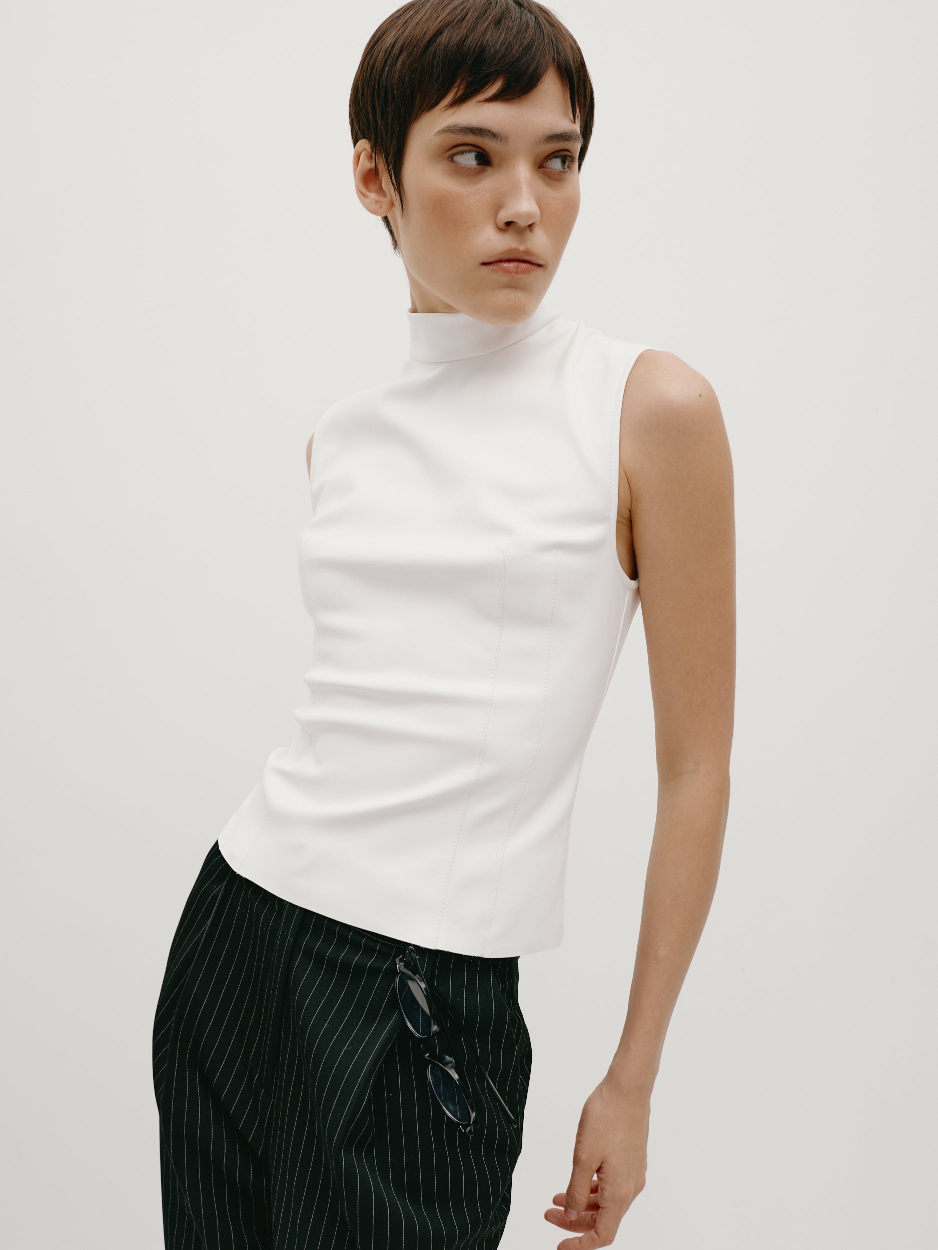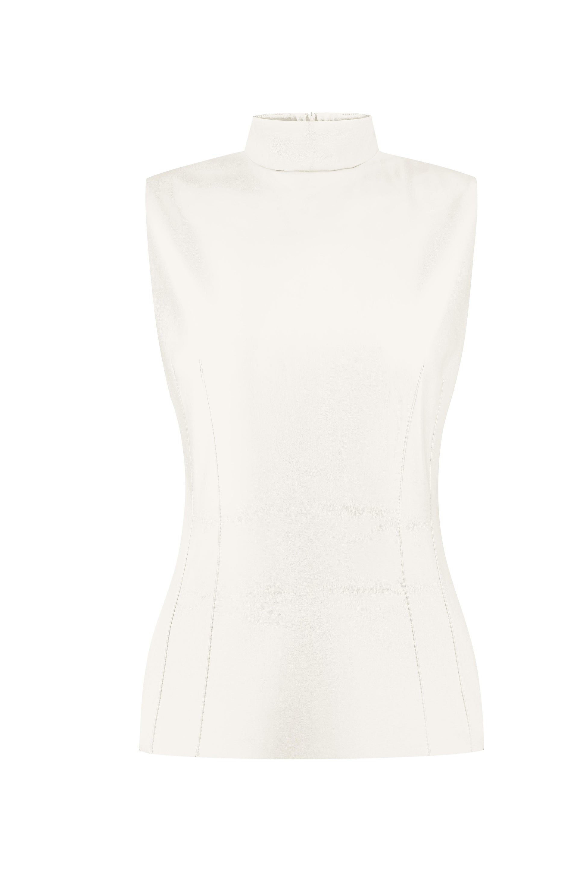 Жіночий гольф без рукавів з еко-шкіри молочного кольору – це стильний та оригінальний елемент гардероба.