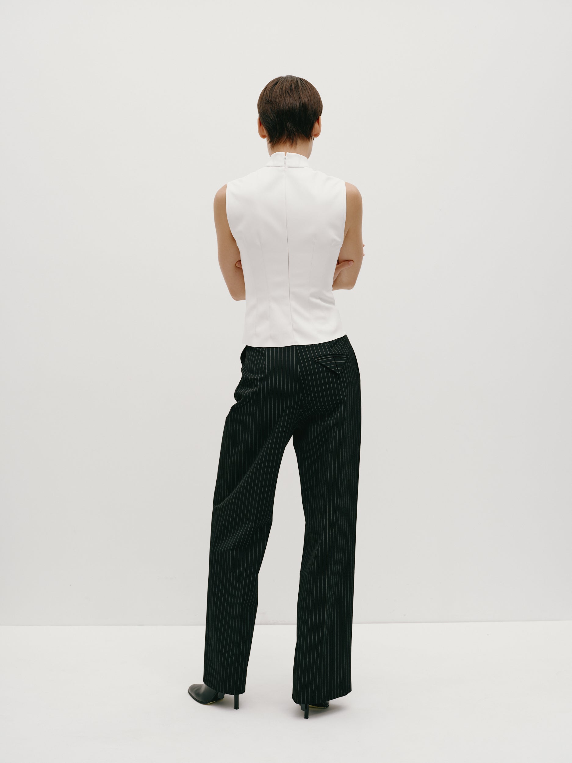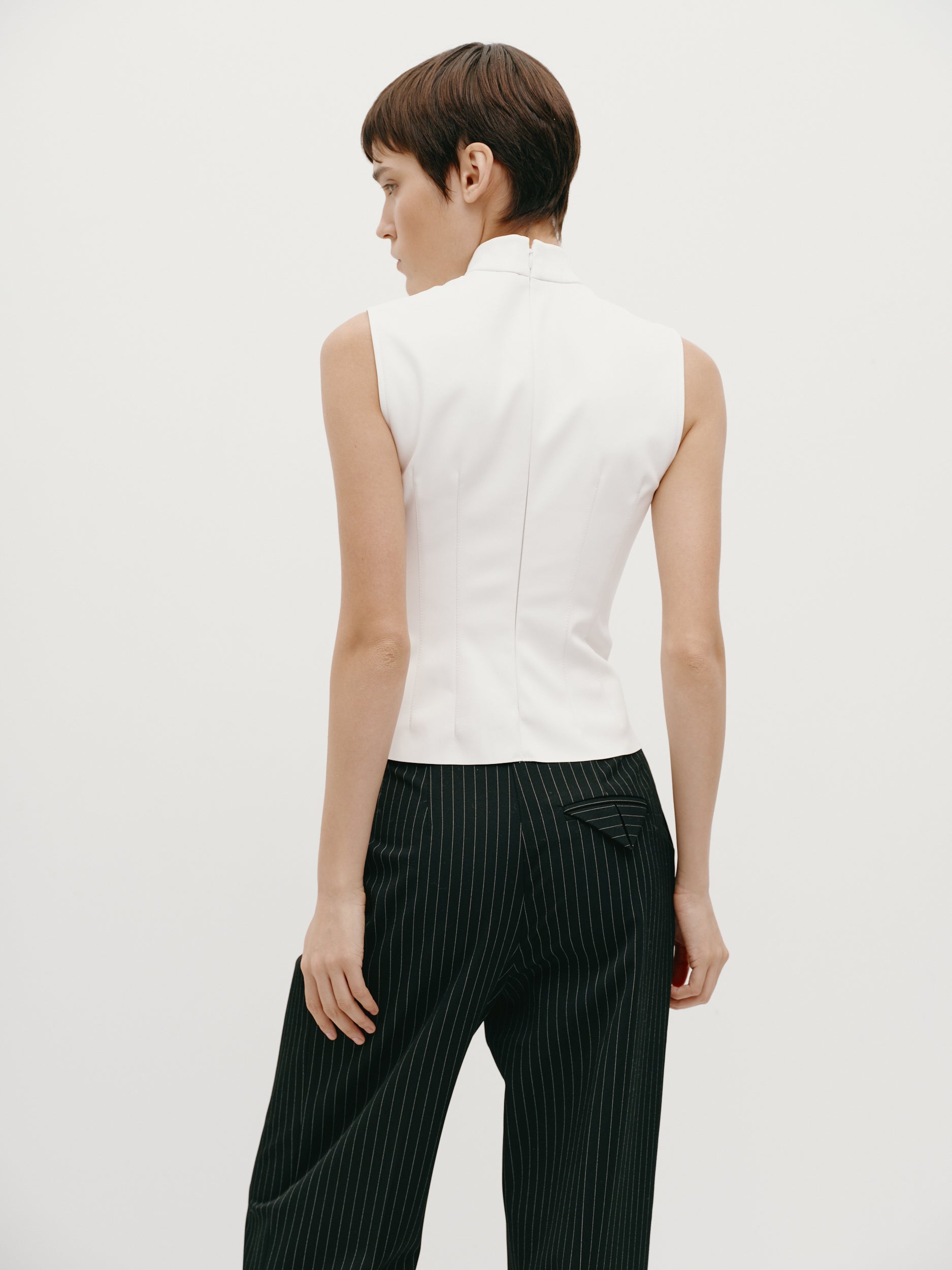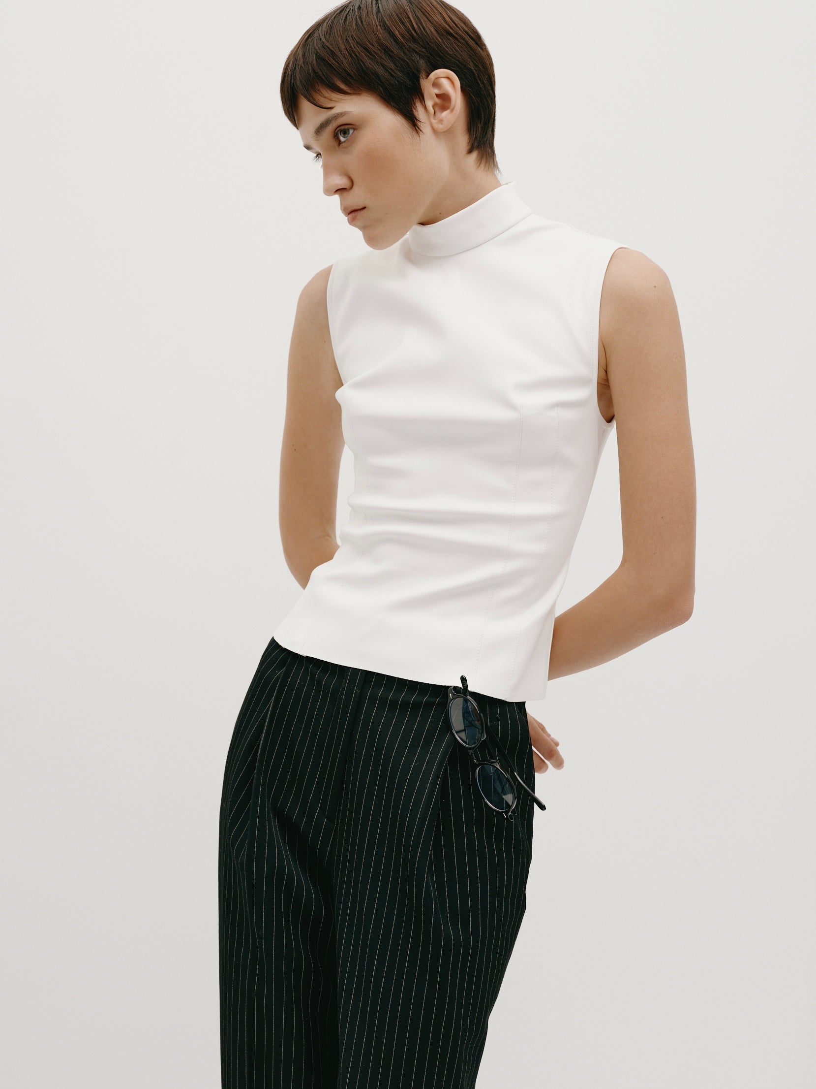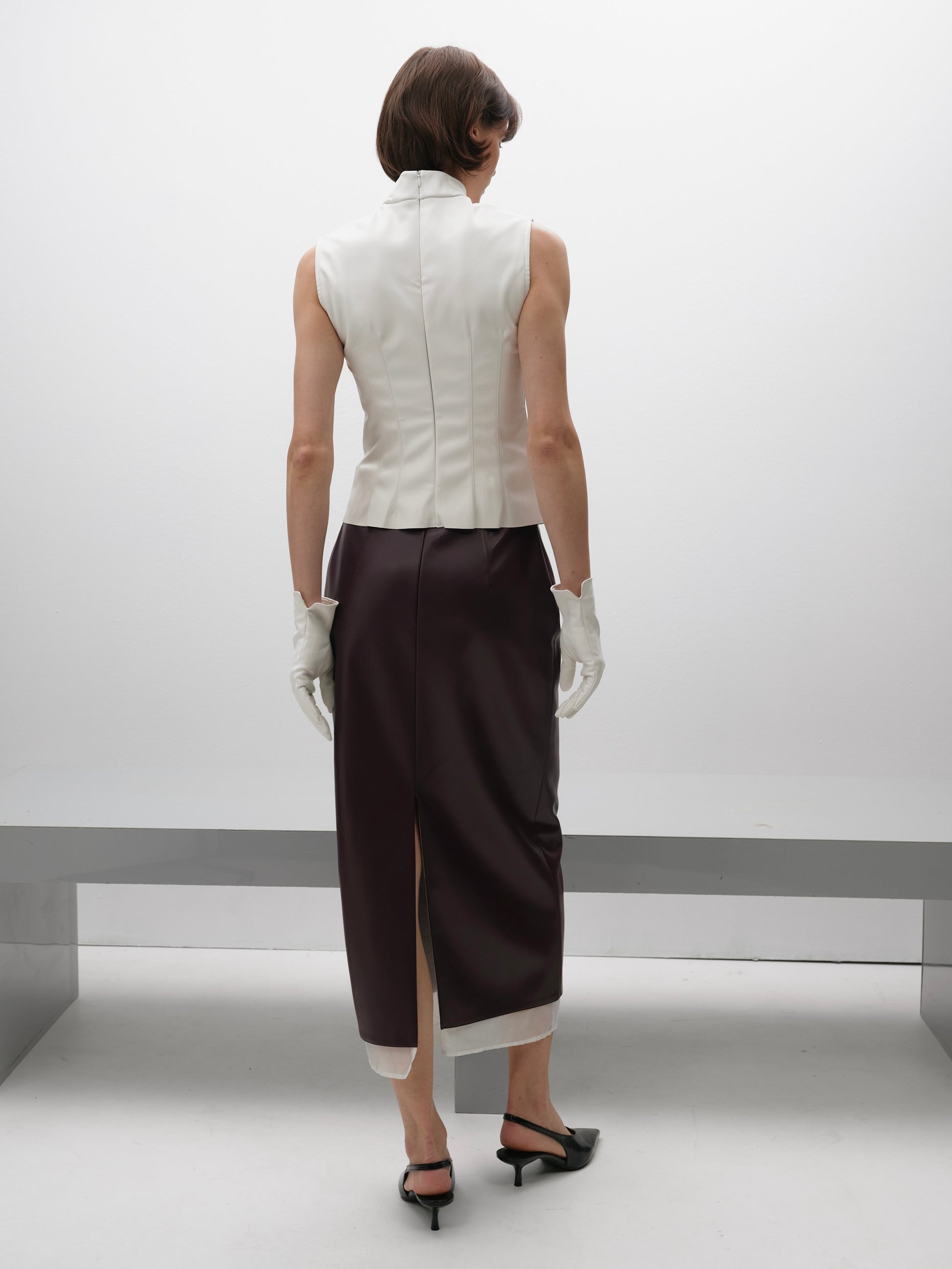 Жіночий гольф без рукавів з еко-шкіри молочного кольору – це стильний та оригінальний елемент гардероба.