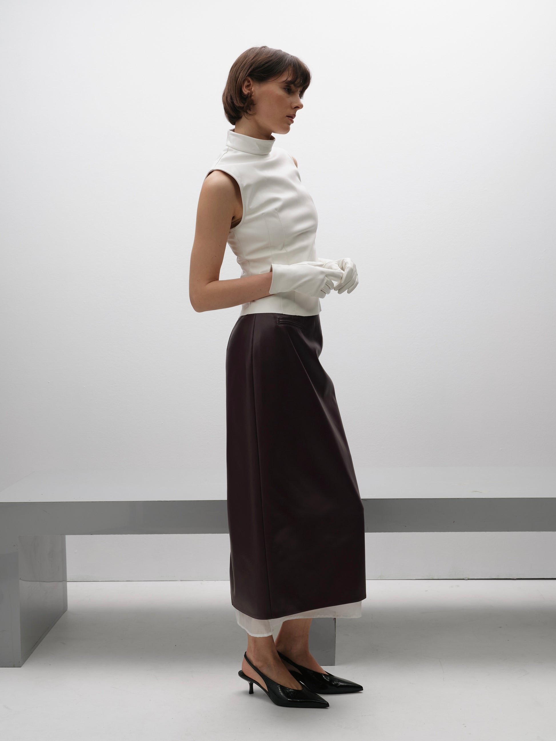 Облягаючий крій підкреслює фігуру, а гладка текстура еко-шкіри надає образу сучасності та елегантності. Молочний колір робить його універсальним, що дозволяє легко комбінувати з різними стилями: від класичних до кежуал.