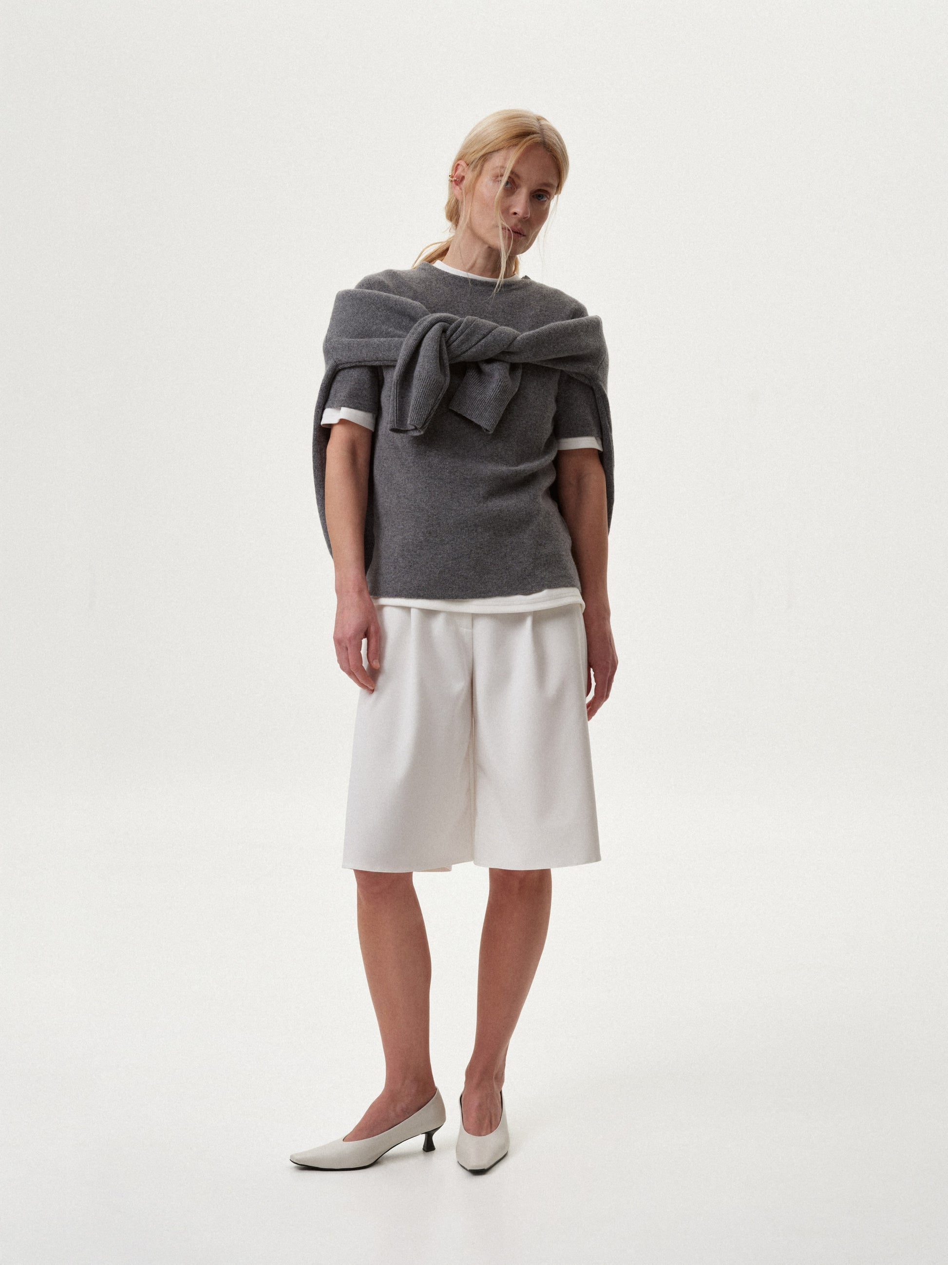 Бермуди молочні класичні - це про чистоту ліній, збалансований крій та м’яку інтерпретацію сучасної класики. Стриманий силует і довжина до коліна формують акуратну, зібрану пропорцію, що виглядає легко та впевнено. Молочний відтінок підкреслює архітектуру крою та додає образу світлоти, роблячи бермуди універсальною основою для мінімалістичних і багатошарових стилізацій.