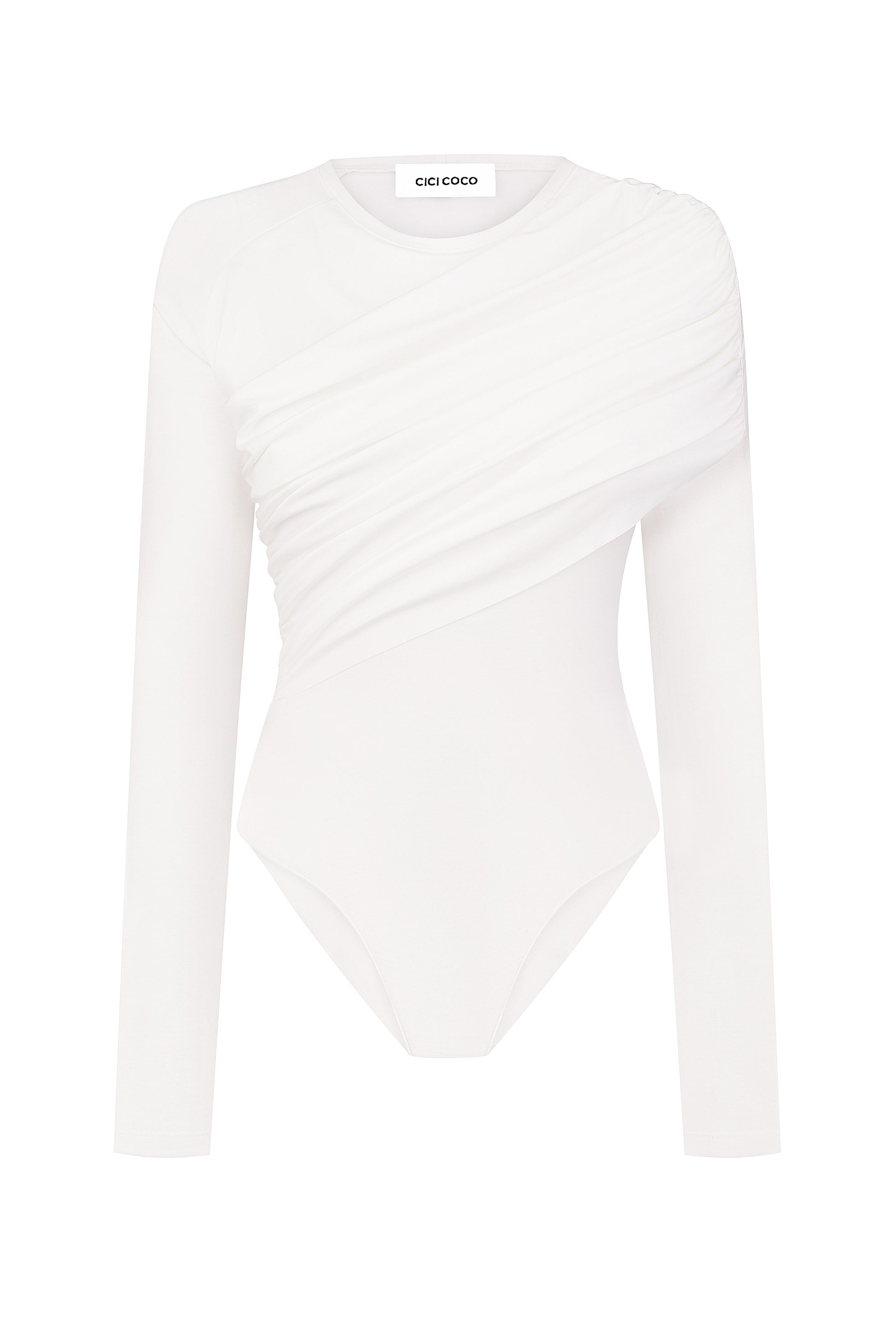 Жіноче молочне боді з драпіруванням — втілення ніжності, елегантності та комфорту. Легка тканина з віскози м’яко лягає по фігурі, створюючи витончений силует. Драпірування додає вишуканості, роблячи цей елемент гардероба універсальним для різних образів.