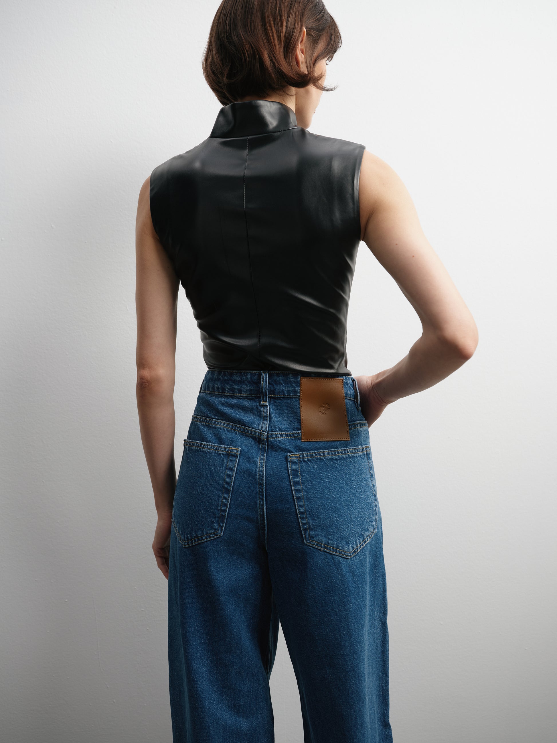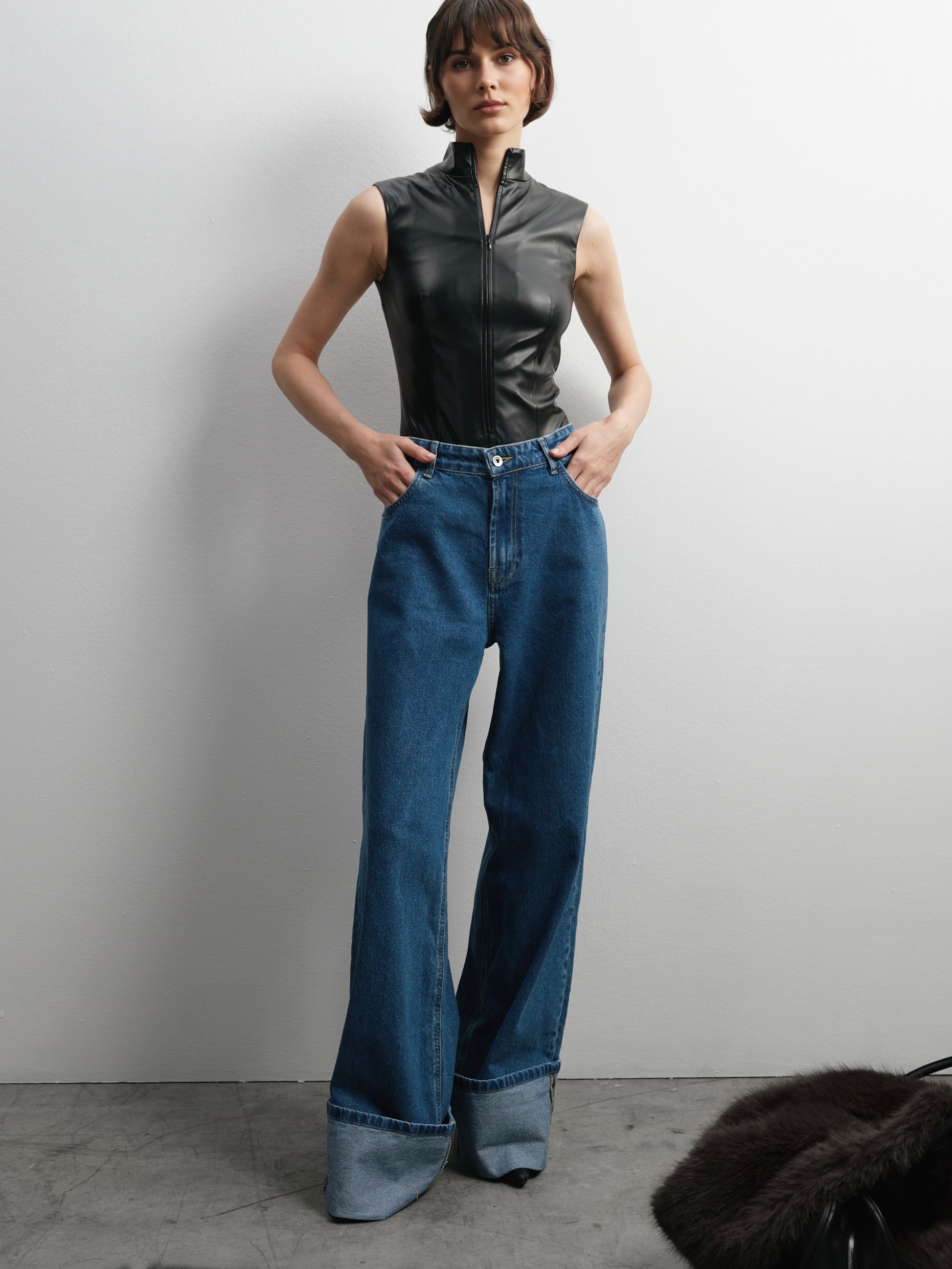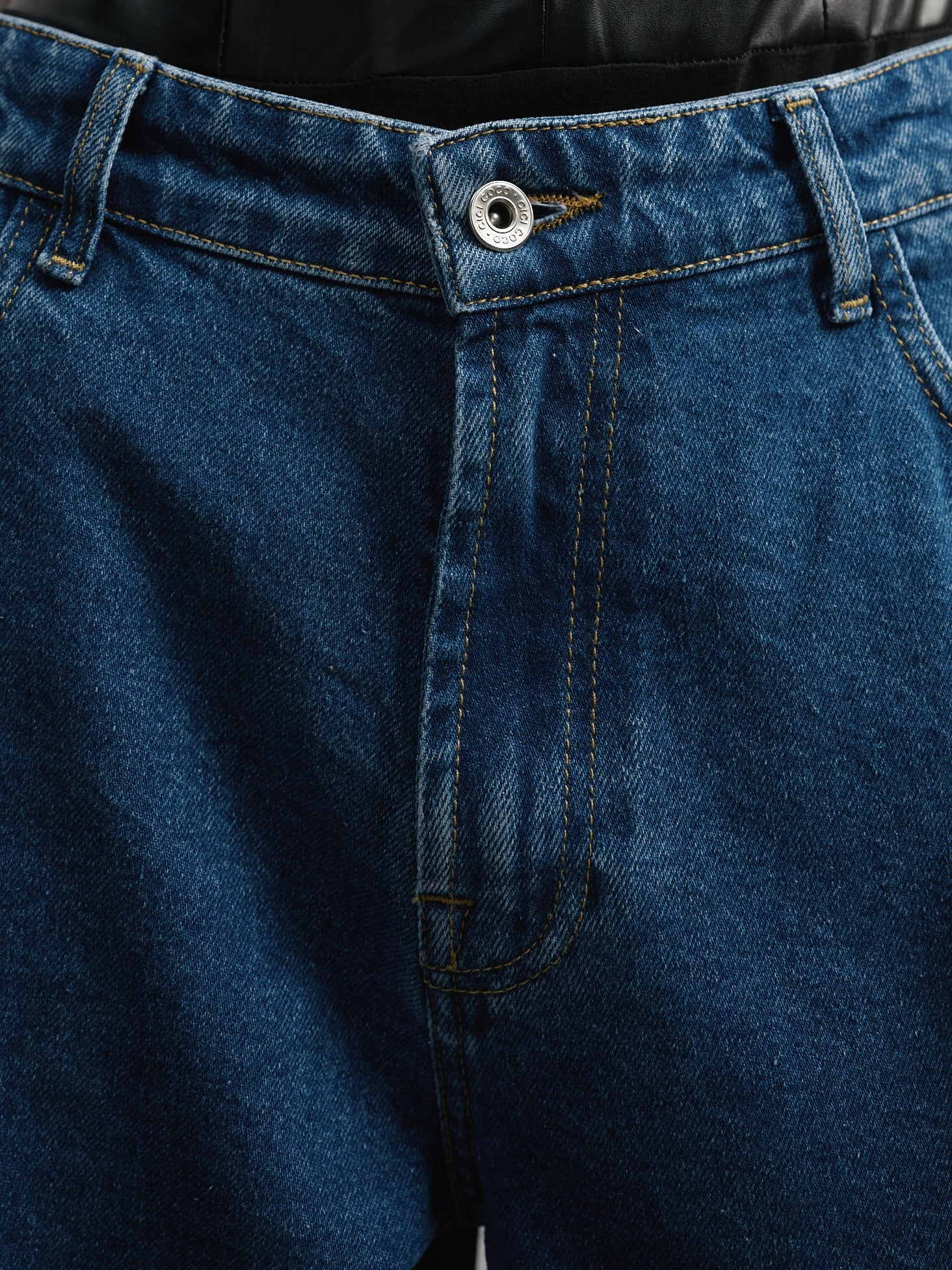 Сині джинси широкого крою з підгинами — це поєднання лаконічного стилю та сучасної жіночності. Вільний силует створює ідеальні пропорції та комфорт у русі, а підгорнений низ додає луку невимушеності. Щільний денім тримає форму, зберігаючи акуратний вигляд протягом усього дня.