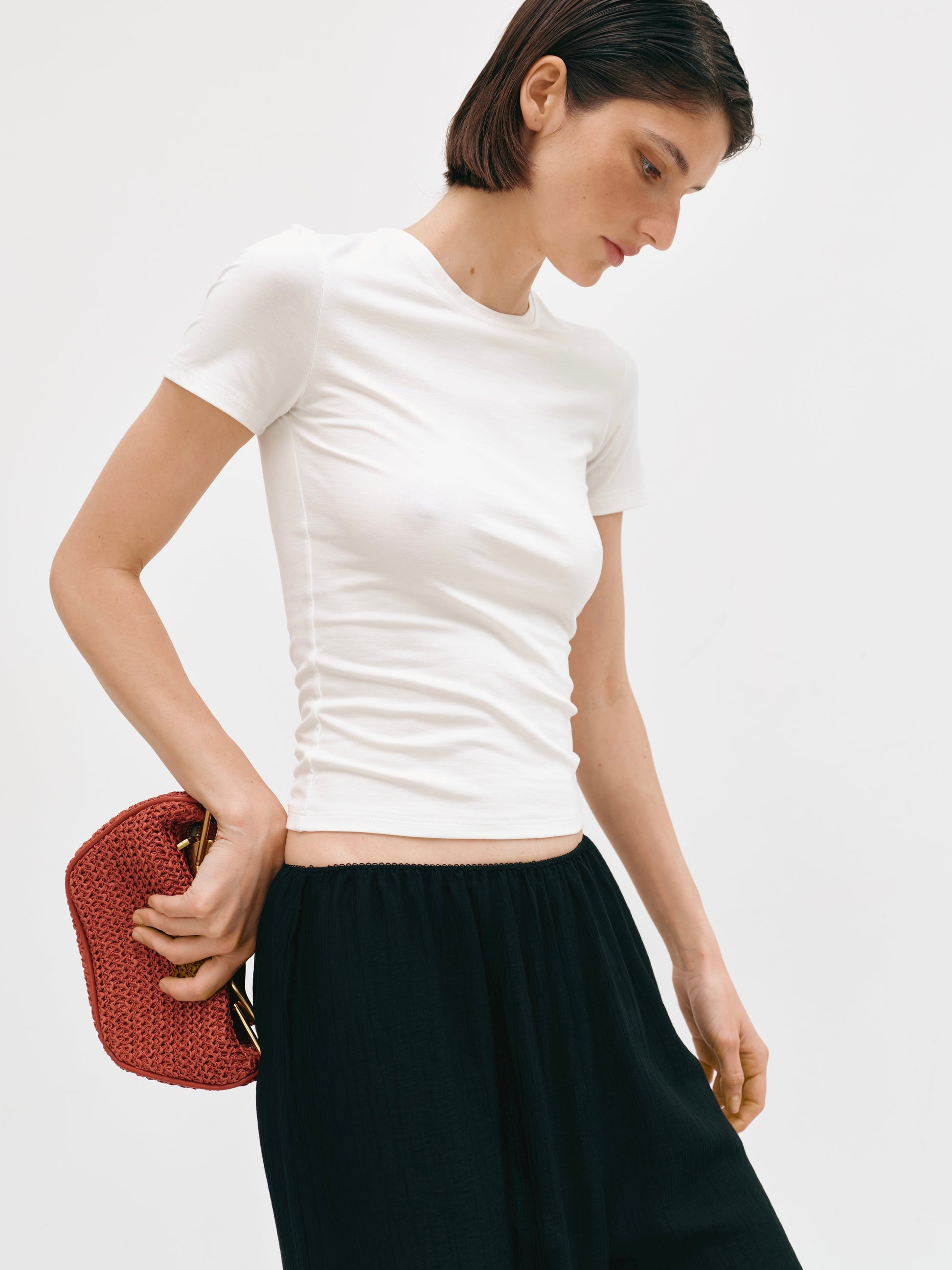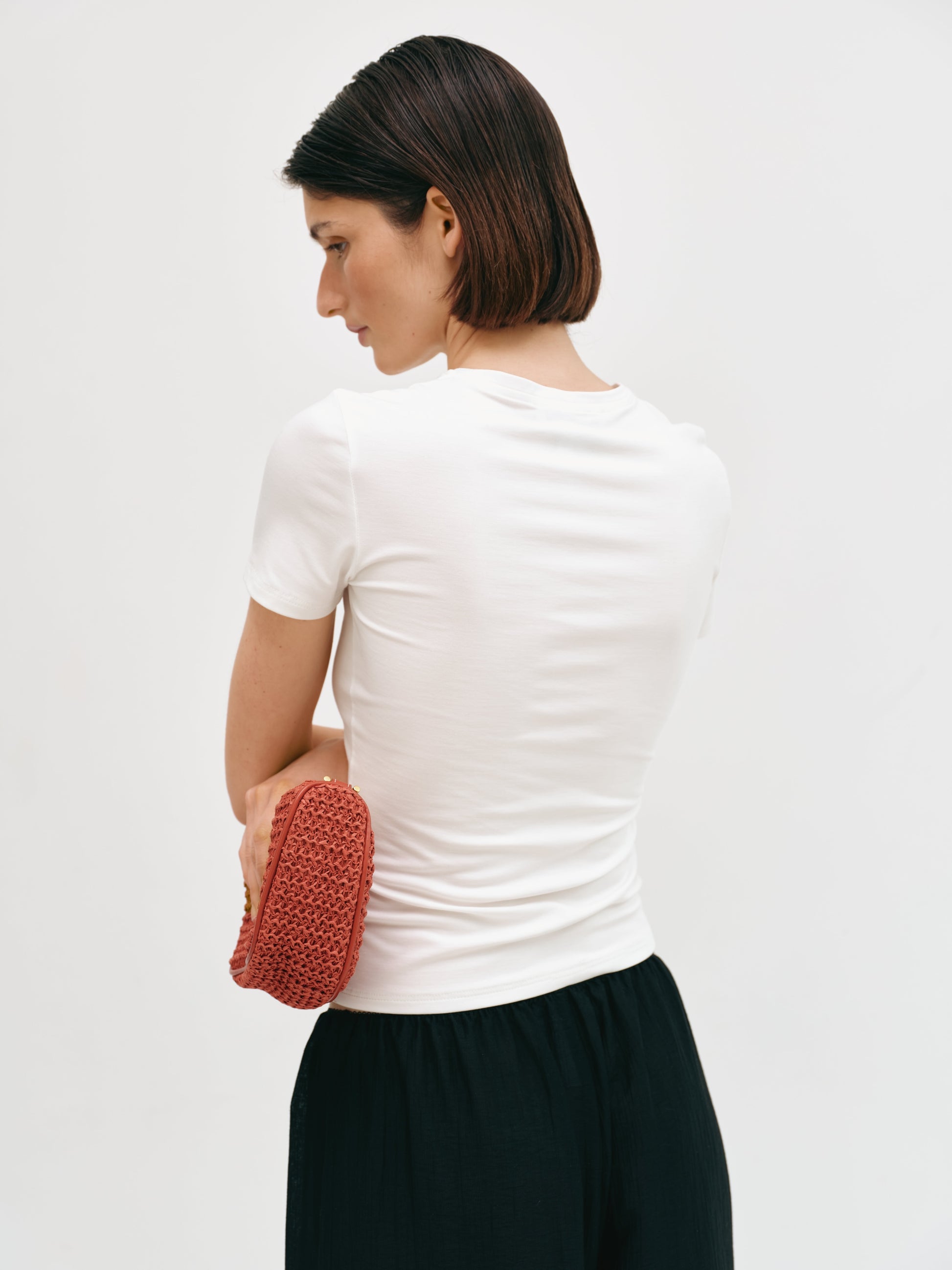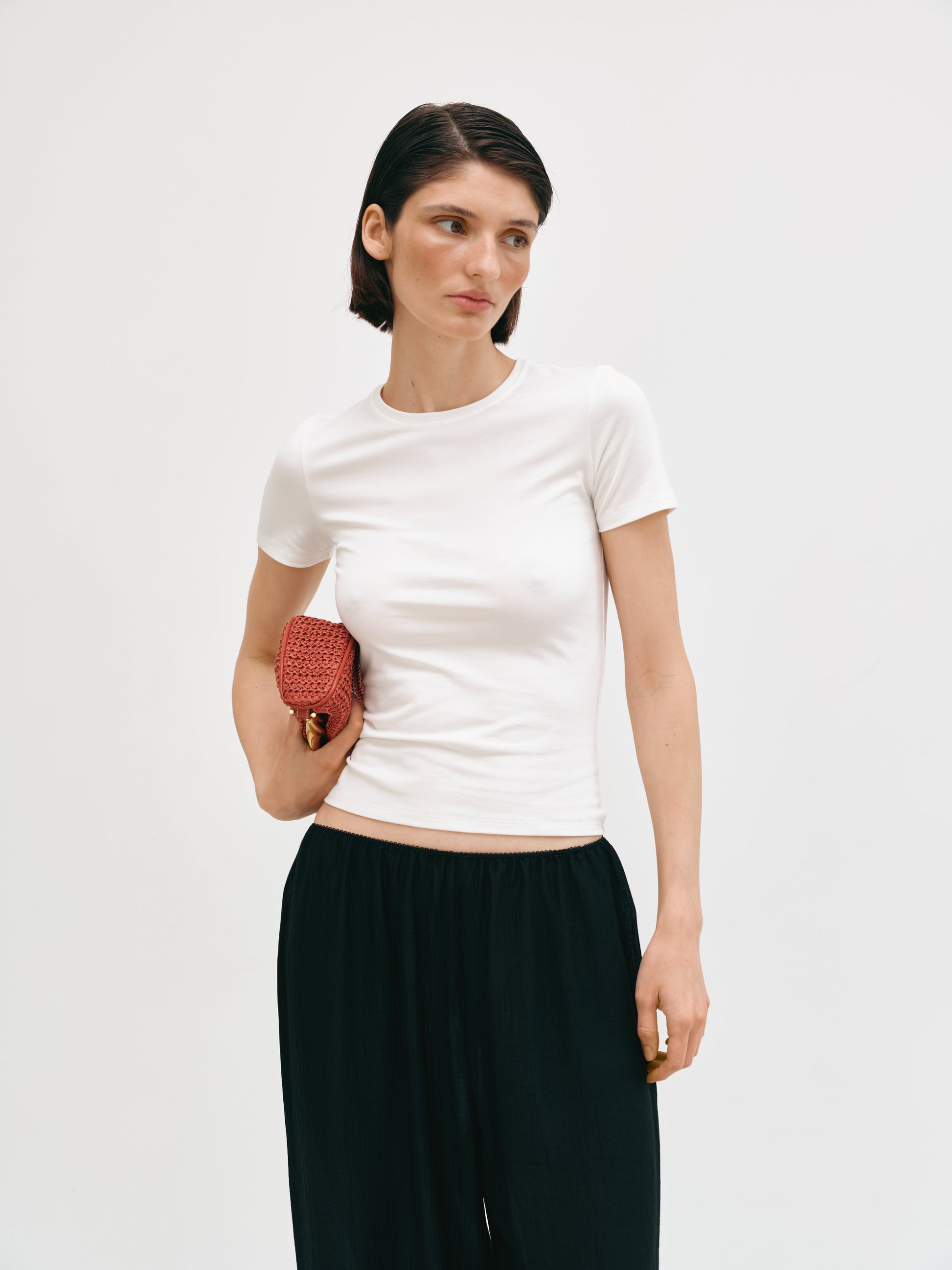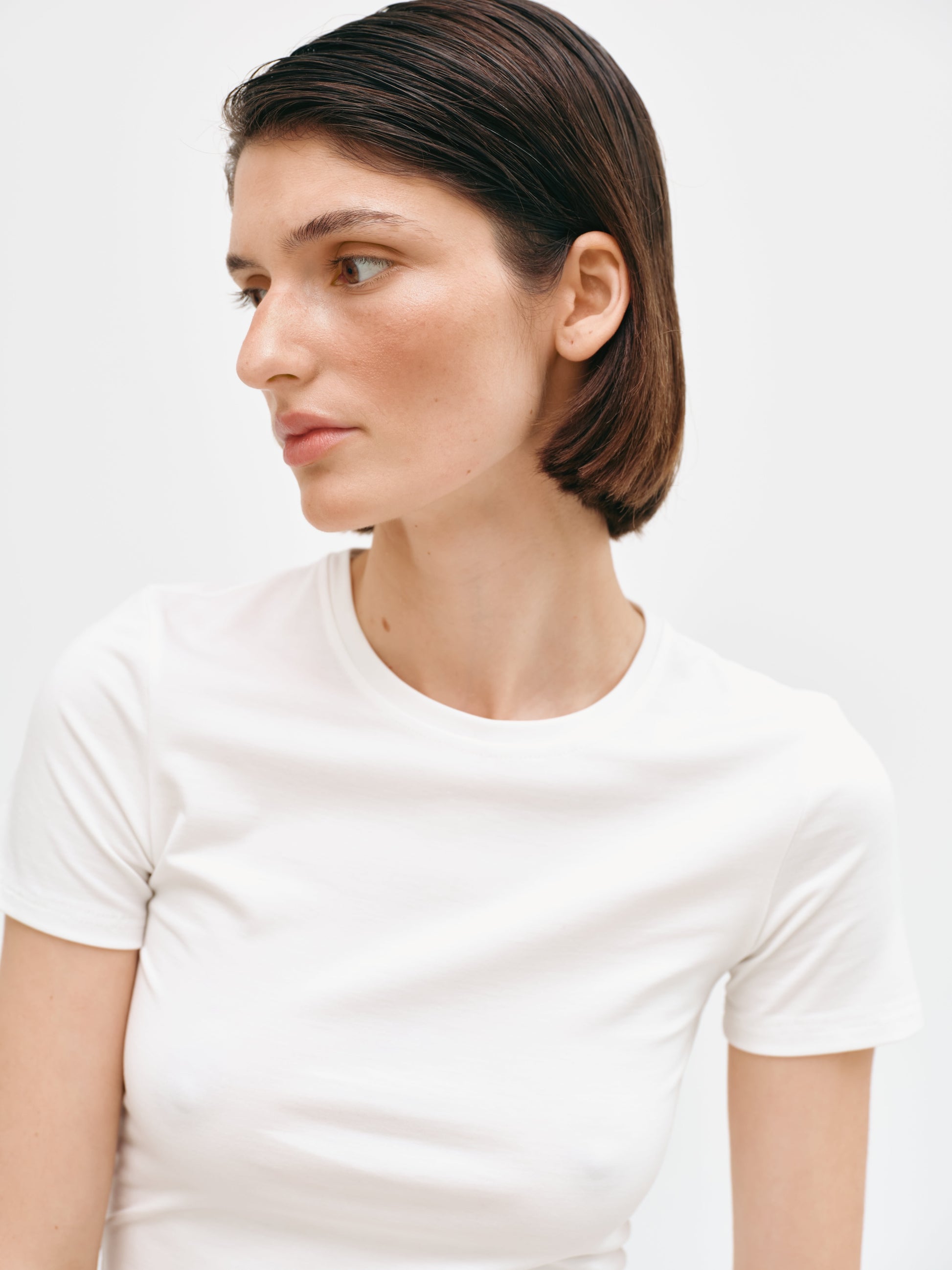 Жіноча футболка трикотажна приталена молочна — це універсальна база, яка підкреслює силует і легко вписується в будь-який гардероб. М’який еластичний трикотаж приємний до тіла, забезпечує комфорт упродовж дня та зберігає форму навіть після численних прань.