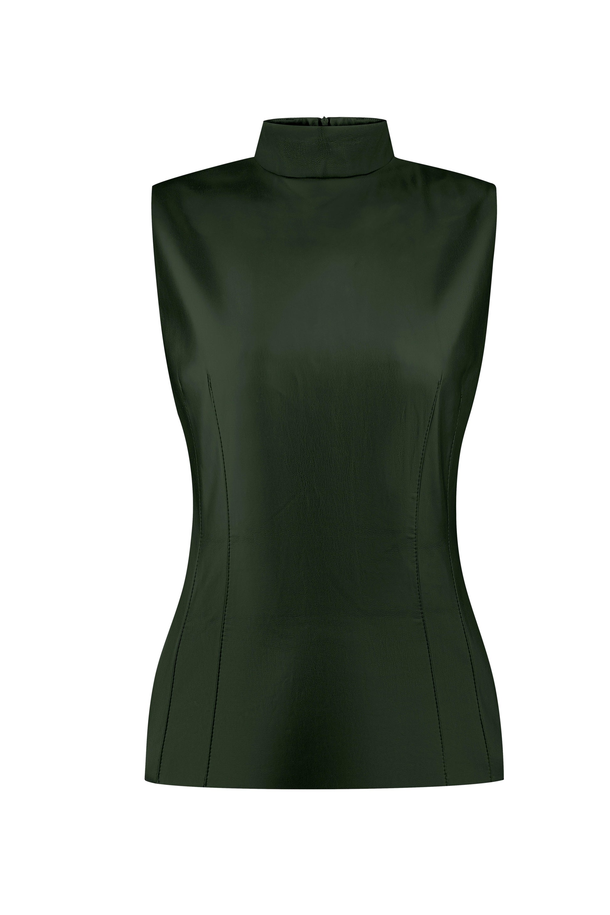 Жіночий гольф без рукавів з еко-шкіри зеленого кольору – це стильний та оригінальний елемент гардероба.