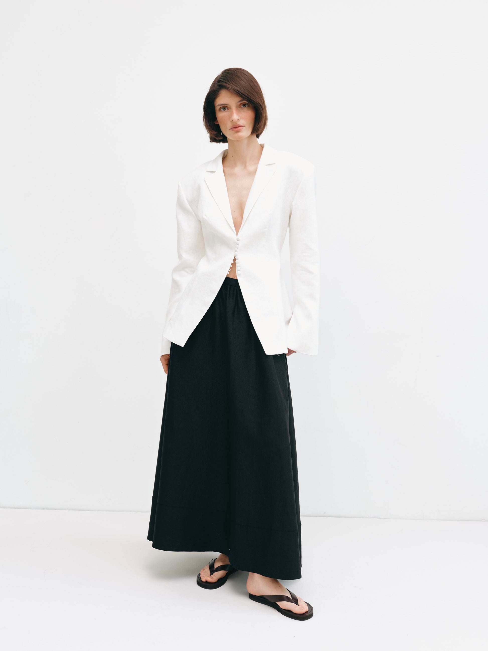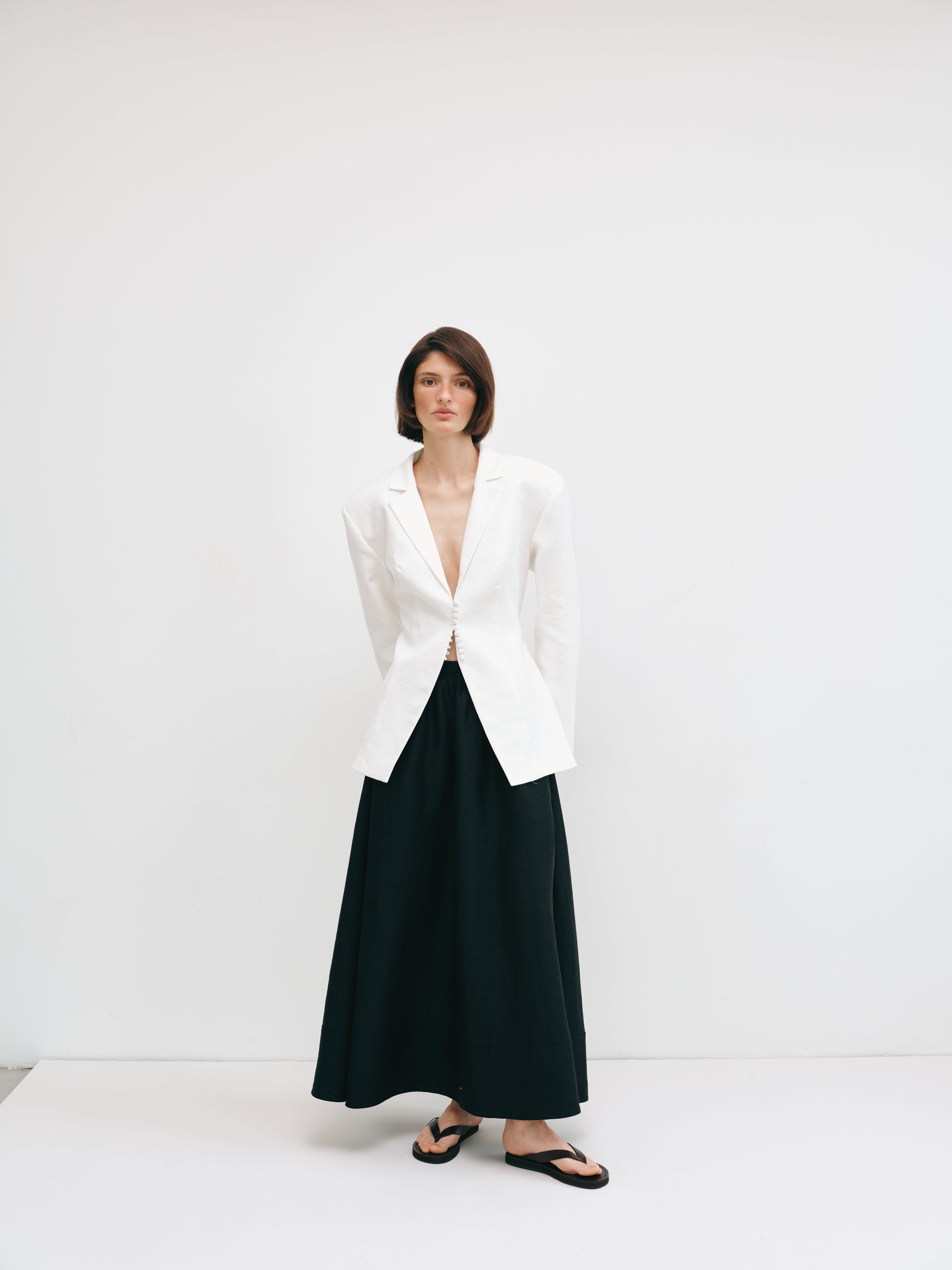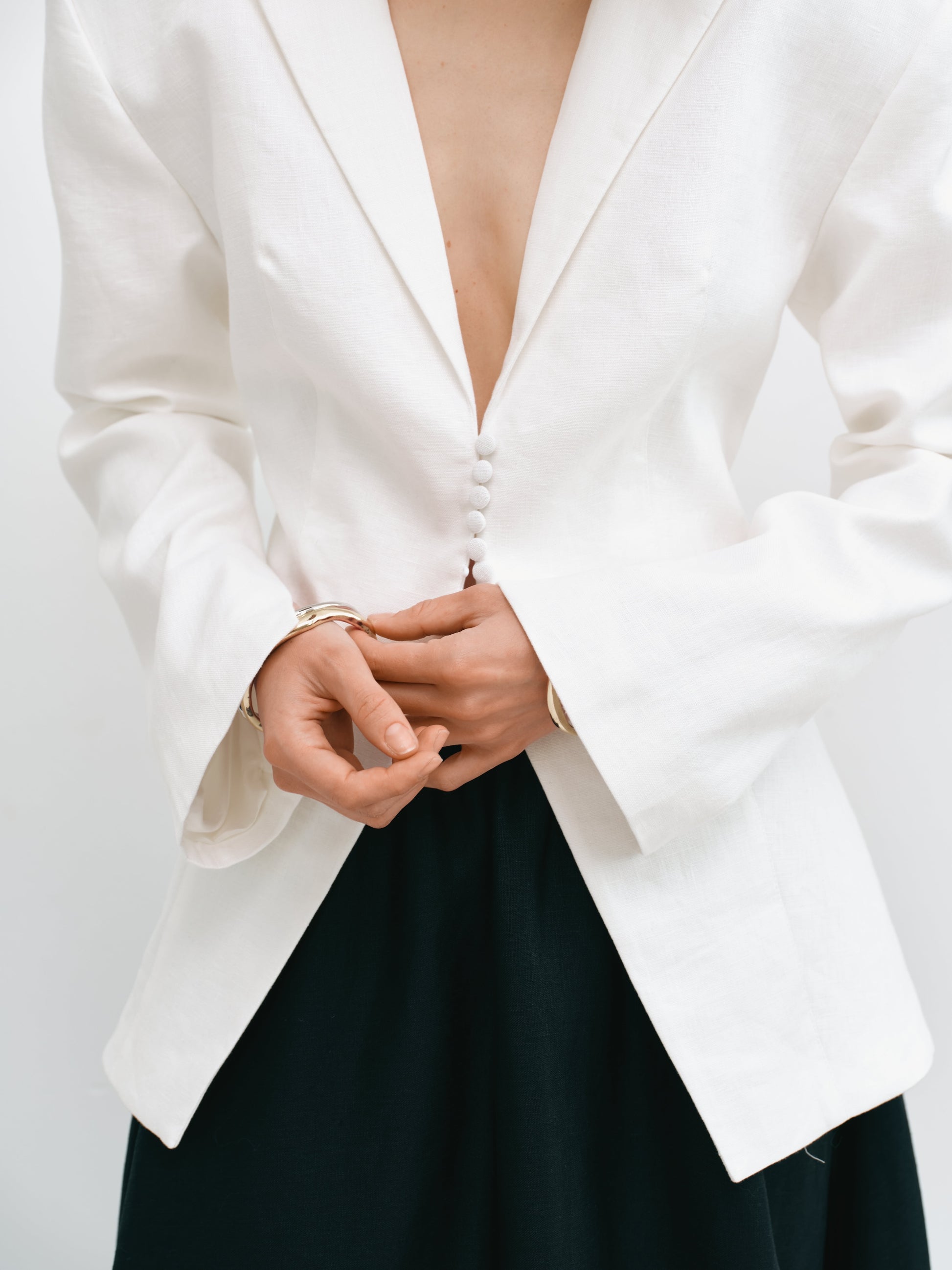 Цей жакет стане універсальним елементом гардеробу: його можна легко поєднувати з палаццо, класичними спідницями або лляними шортами. Якщо купити його в комплекті з такими ж палаццо, можна створити цілісний і стильний образ для офісу, зустрічей чи подій. Додавши підбори — отримаємо витончений, жіночний лук, лофери чи балетки — стриманий, діловий варіант на кожен день.
