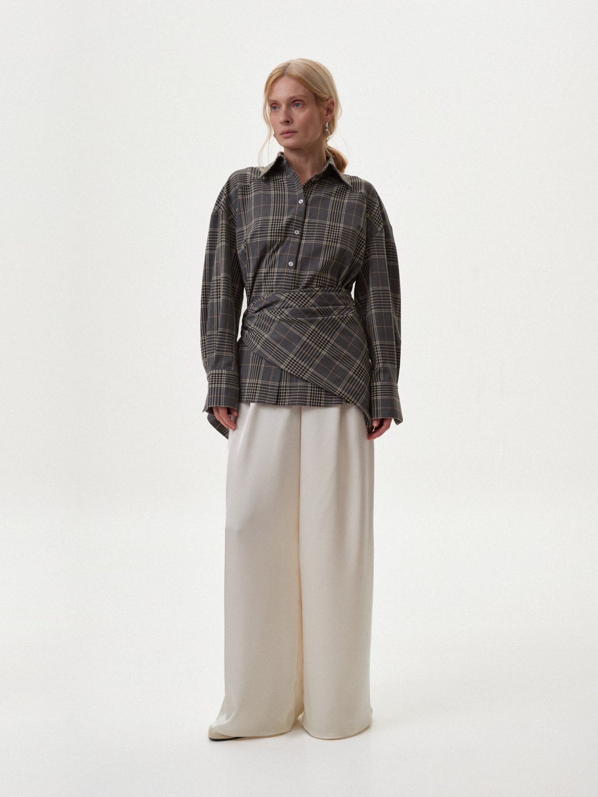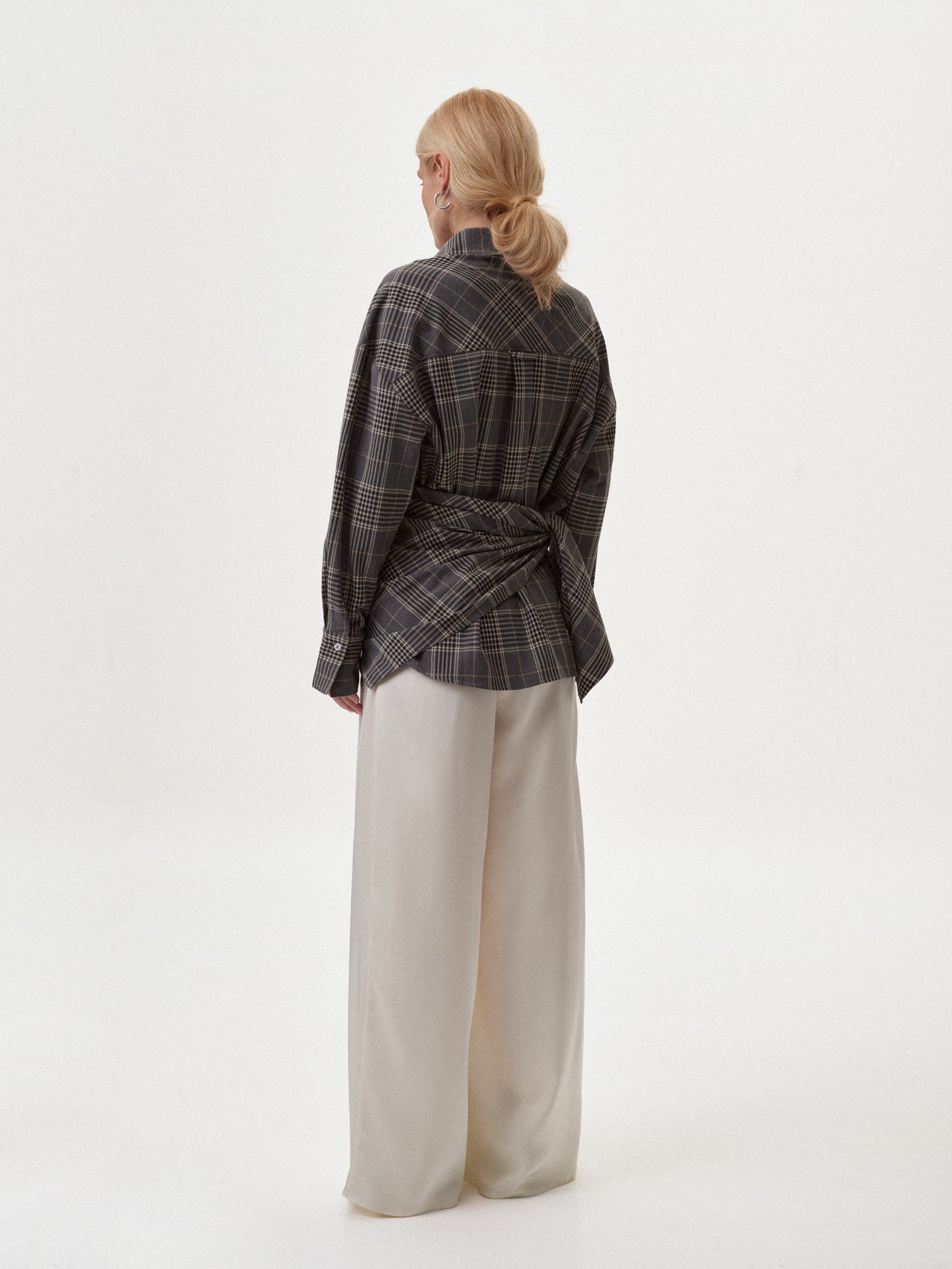 Поєднуйте хустку з сірою сорочкою оверсайз у клітинку для створення гармонійного комплекту з єдиним настроєм. Носіть її як накидку на плечі, зав’язуйте на талії поверх сорочки або використовуйте як шарф для багатошарового образу. Такий аксесуар легко інтегрується як у розслаблені повсякденні стилізації, так і в більш продумані міські образи.