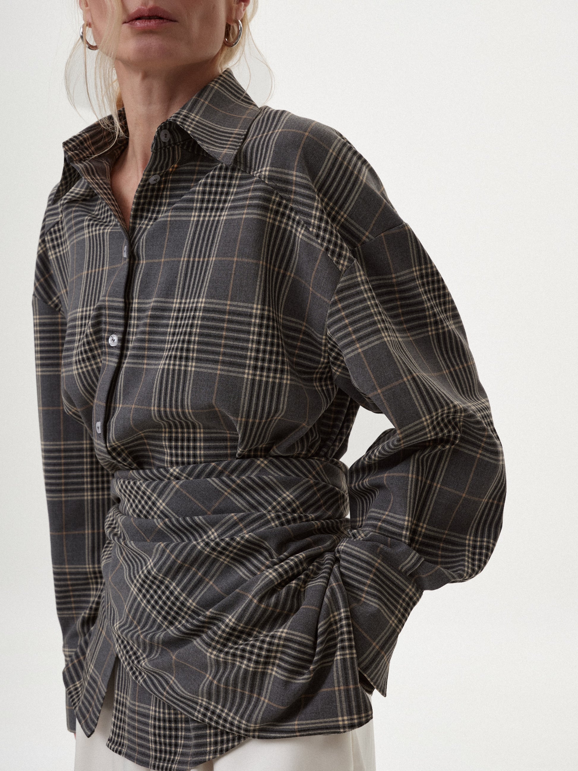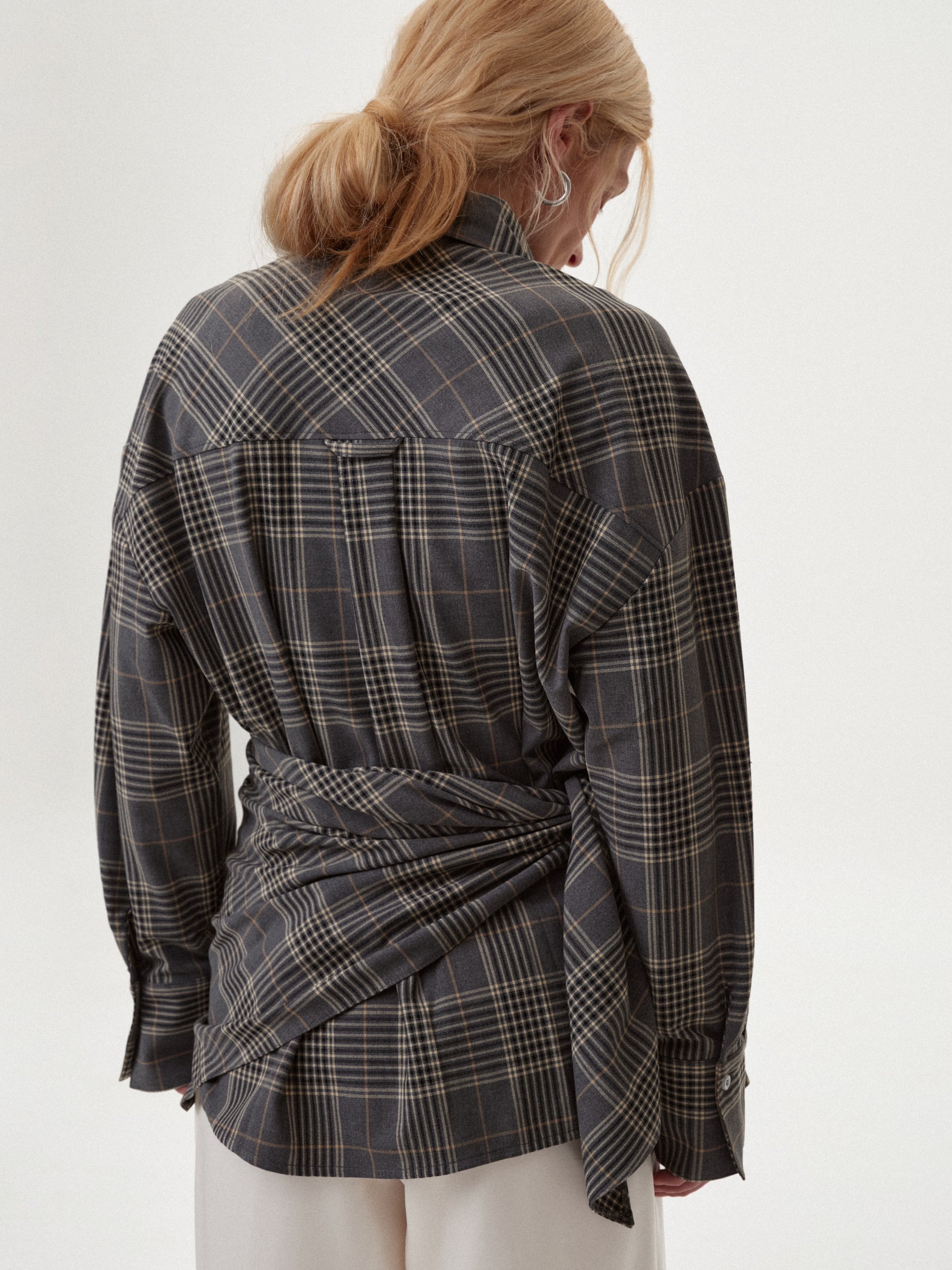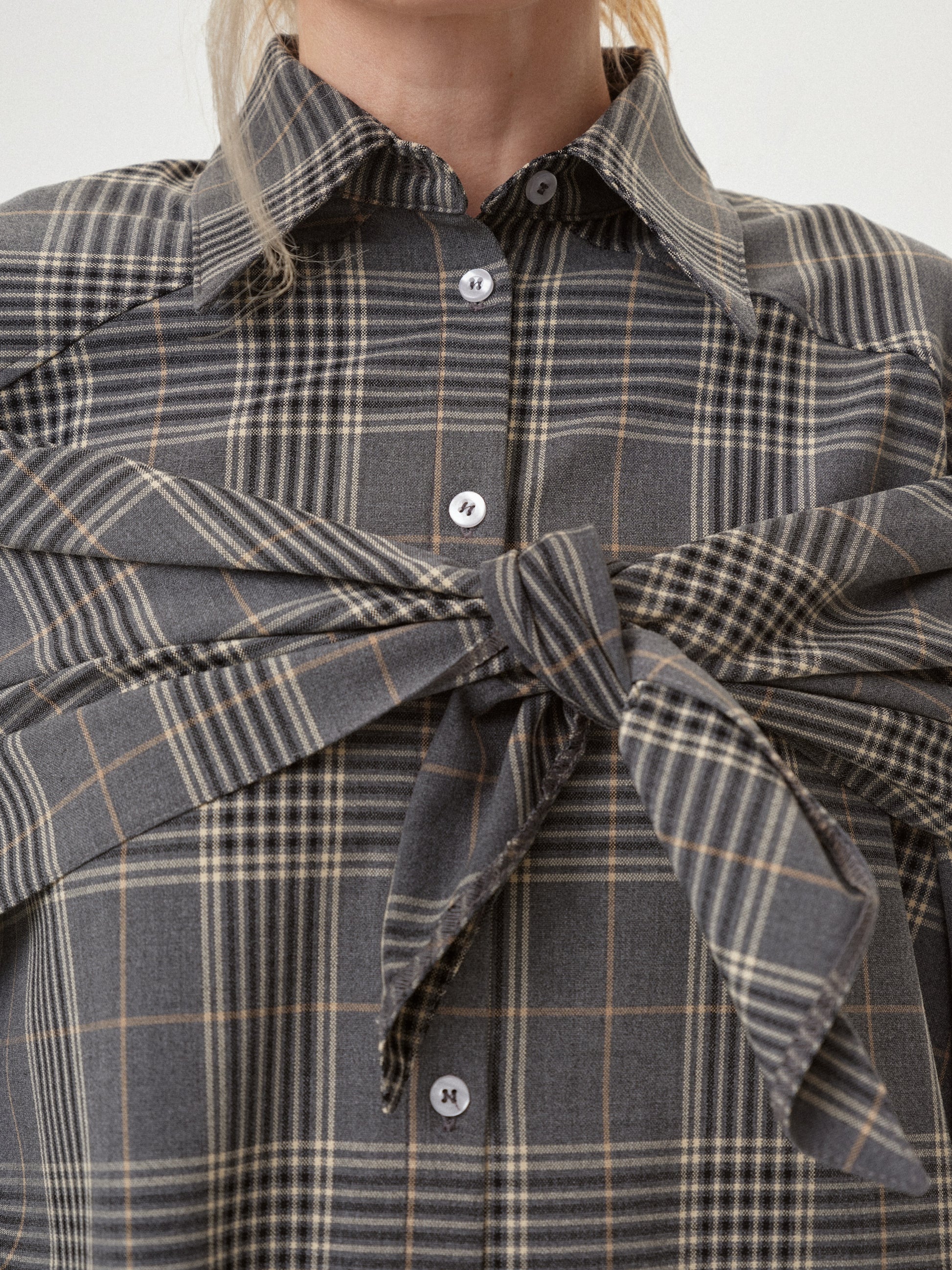 Хустка в клітинку – це акцентний елемент, що додає образу завершеності та характеру. Класичний клітинний візерунок перегукується з нашою сірою сорочкою оверсайз, створюючи цілісну та продуману стилізацію. Завдяки м’якій тканині хустка легко драпірується, дозволяючи експериментувати з формою та способом носіння — від стриманого до більш виразного.