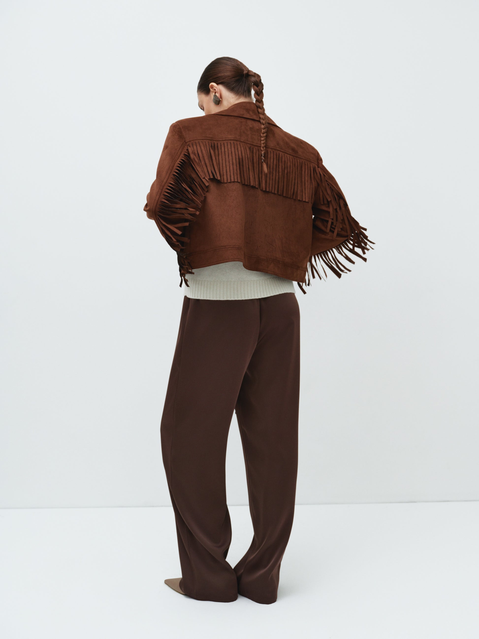 Якщо купити куртку з еко-замші у комплекті з брюками або спідницею, можна створити витончений та сучасний лук. Вона також чудово поєднується з джинсами та базовими топами, додаючи образу легкості та динамічності.