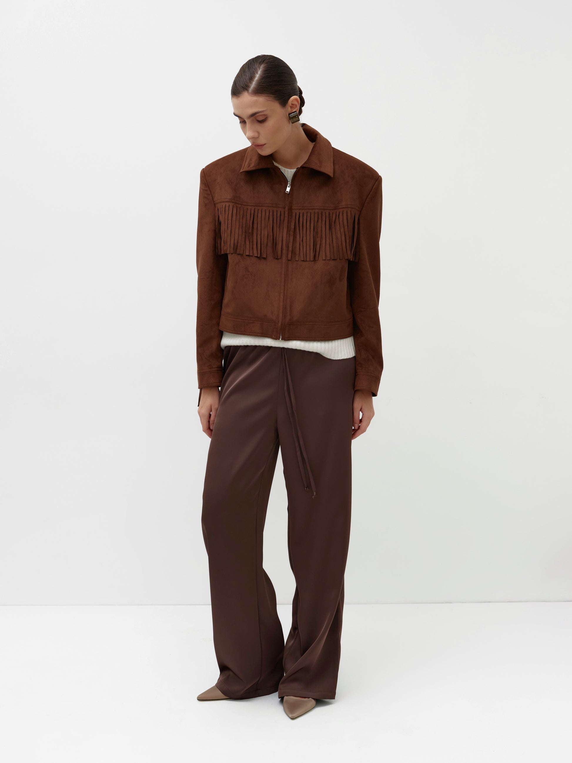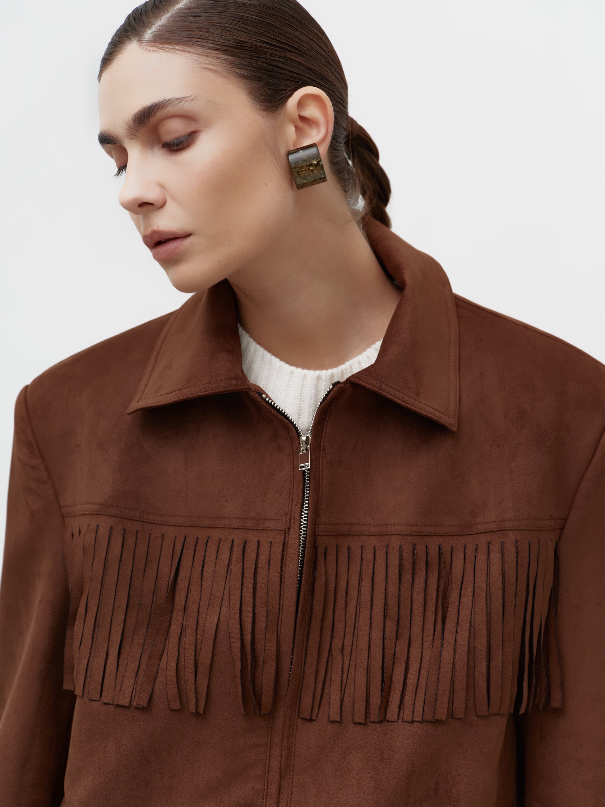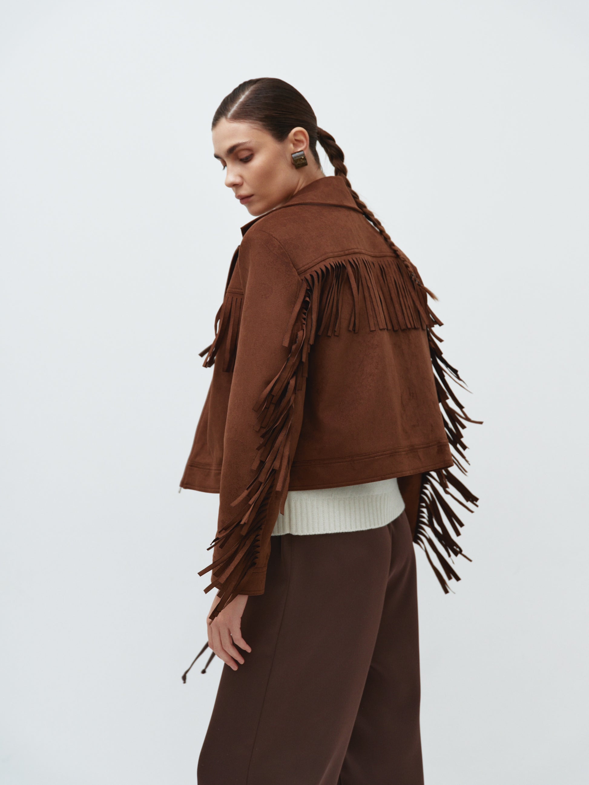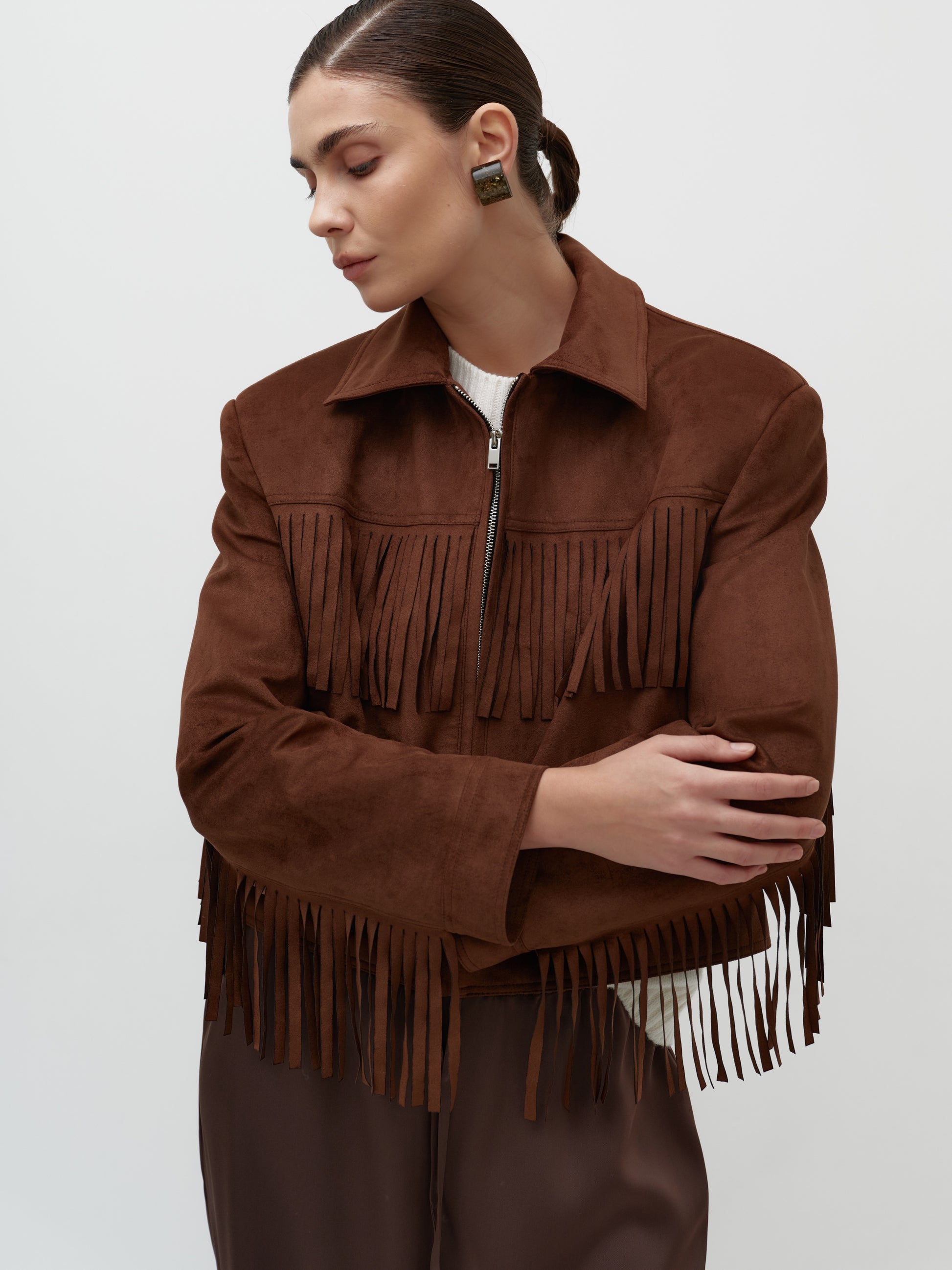 Жіноча куртка з еко-замші карамельна — це поєднання стилю, комфорту та актуальних трендів. Її вільний крій створює невимушений силует, а текстурна еко-замша додає виробу вишуканості. Бахрома надає куртці характерного акценту, що робить її ідеальним вибором для стильних і сміливих образів.