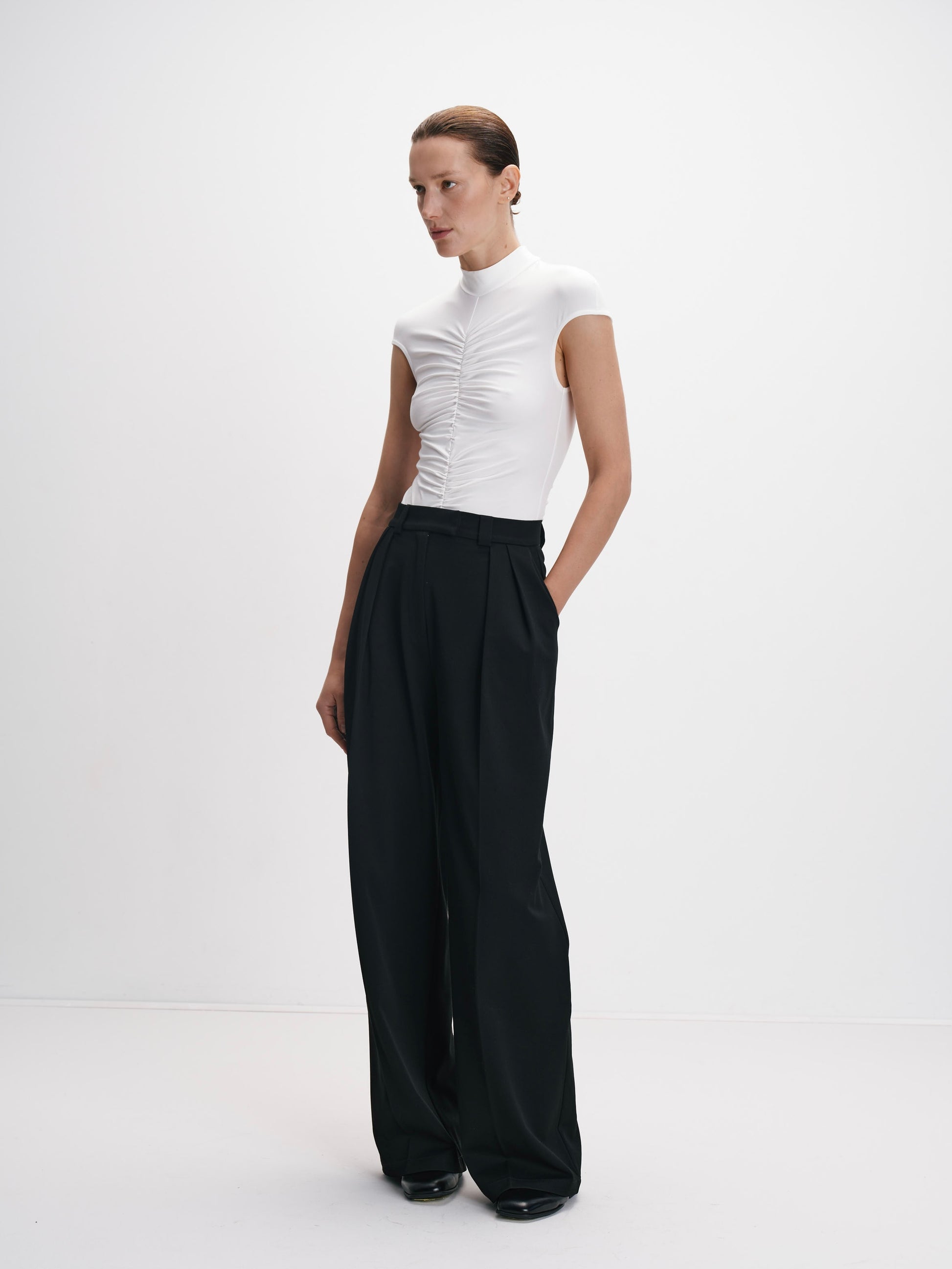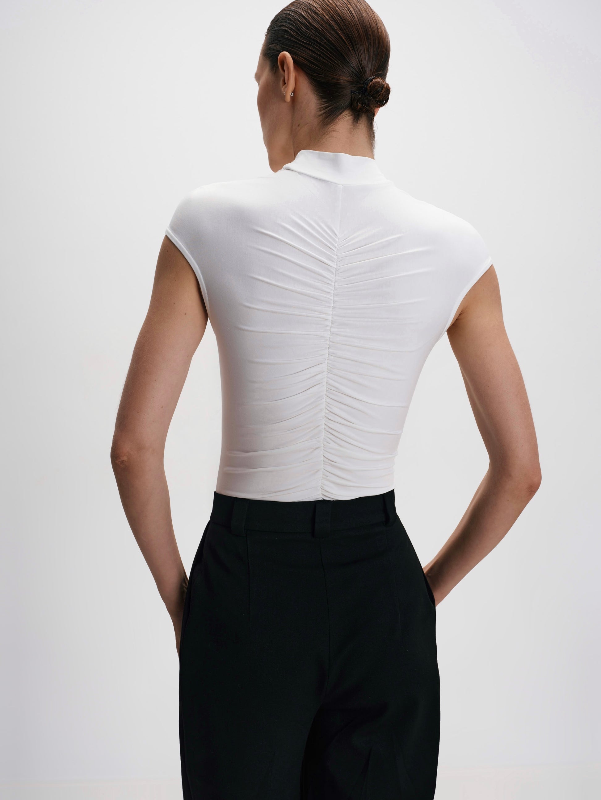 Молочне боді з драпіруванням стане універсальною базою як для офісних луків, так і для вечірніх виходів. Воно ідеально поєднується з брюками з високою талією, спідницями чи жакетом, створюючи сучасний і лаконічний образ.