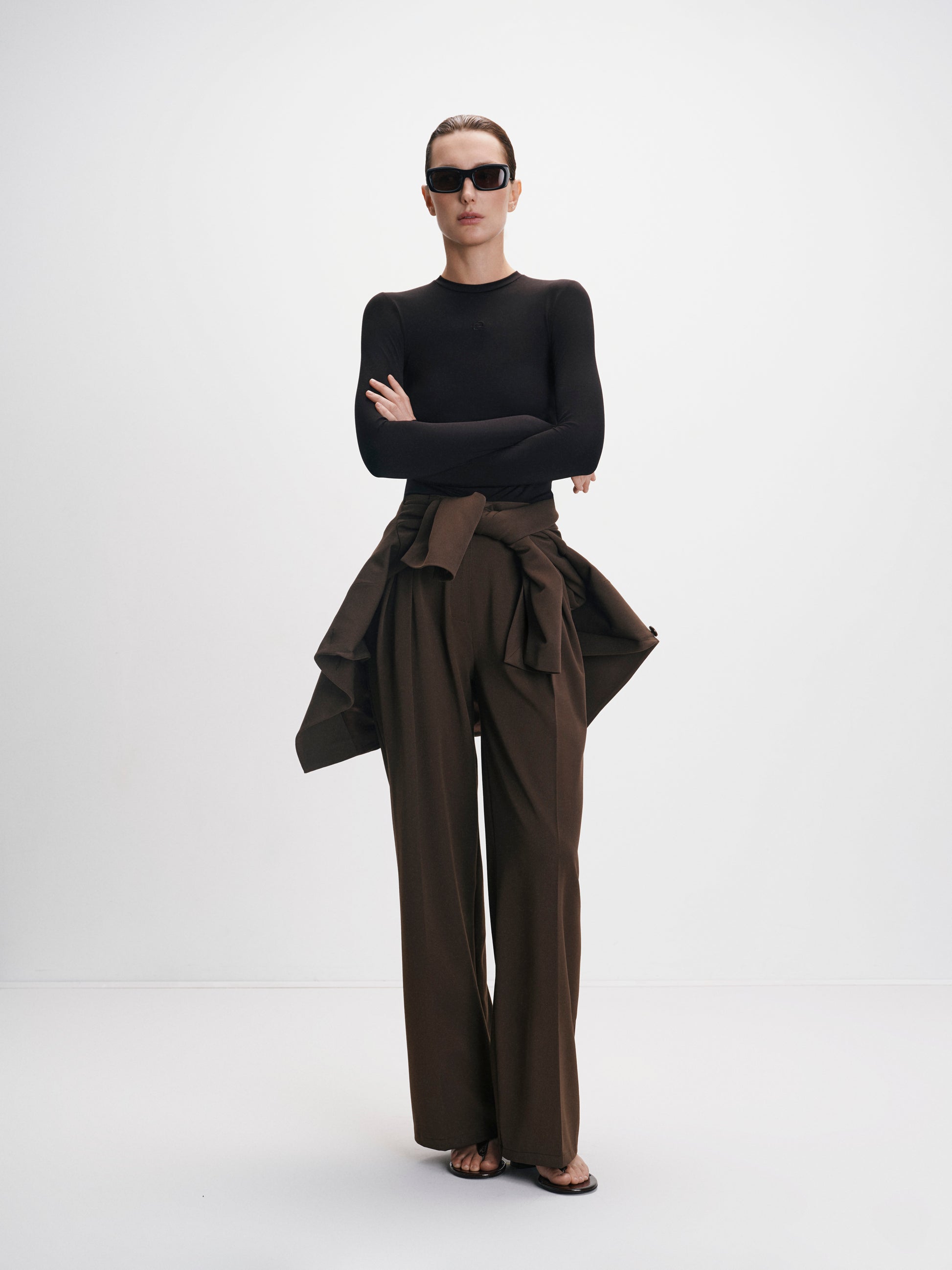 Коричневі жіночі штани палаццо – це стиль, мінімалізм та легкість у стилізації. Вільний крій створює елегантний силует, а висока посадка підкреслює талію. Лаконічний дизайн робить їх універсальними: вони чудово поєднуються як із класичними піджаками, так і з легкими топами.