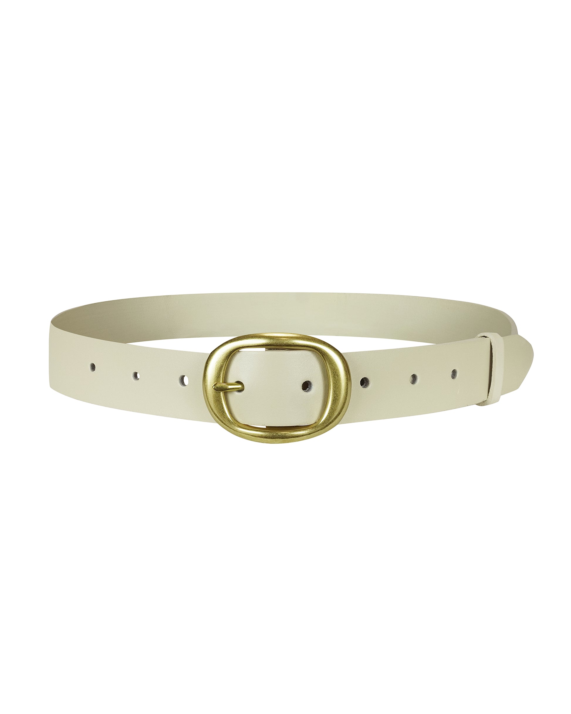 Молочний шкіряний ремінь із круглою пряжкою ідеально підходить для створення світлих монохромних луків, а також чудово поєднується з пастельними й базовими відтінками. Він легко інтегрується як у ділові, так і в повсякденні образи – від брюк і джинсів до спідниць і суконь, додаючи їм легкості та завершеності.