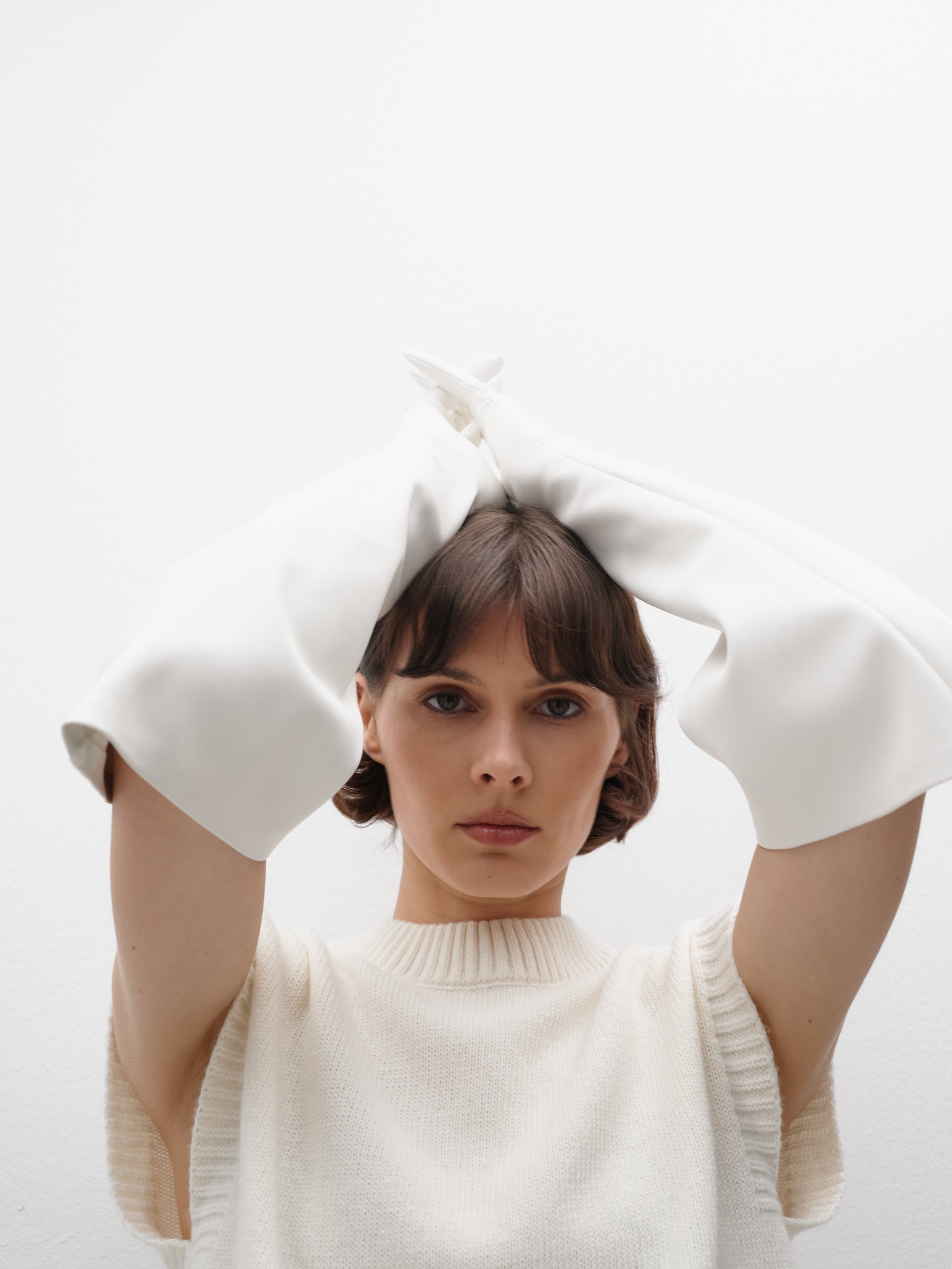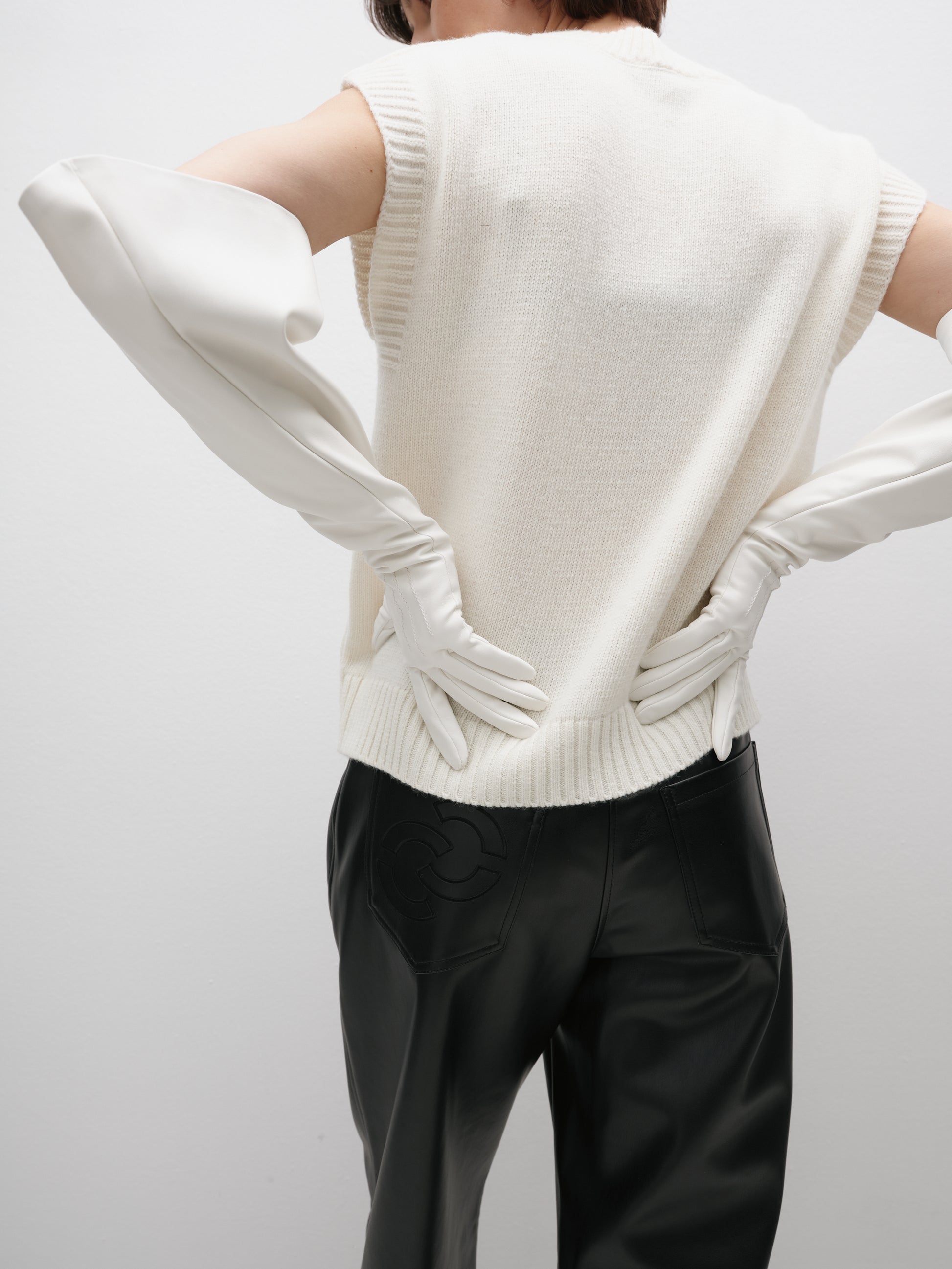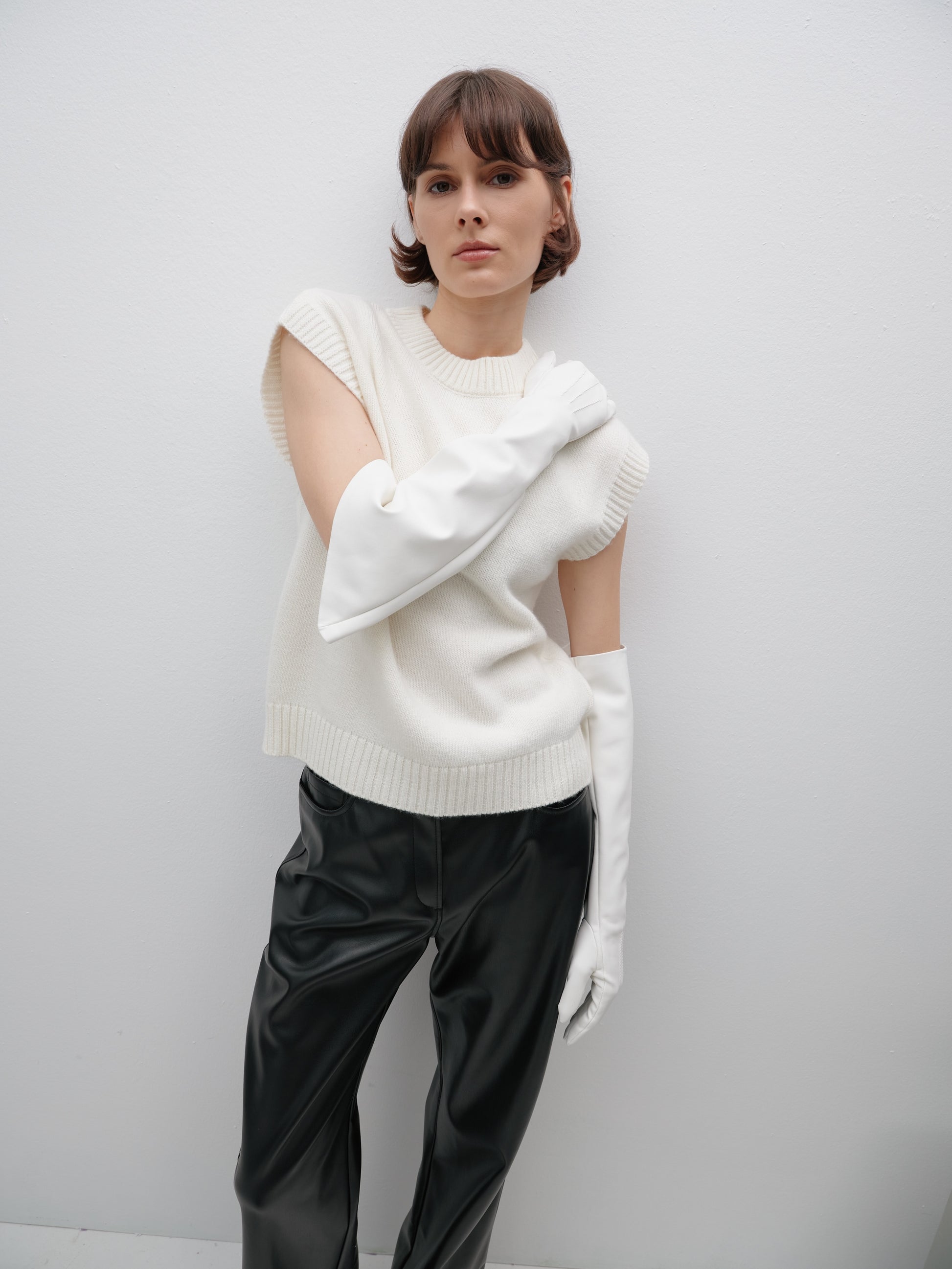 Довгі молочні рукавиці з еко-шкіри чудово поєднуються з пальтами, тренчами чи жакетами. Світлий відтінок додає ніжності та розкоші, підкреслюючи витонченість навіть у мінімалістичних образах.