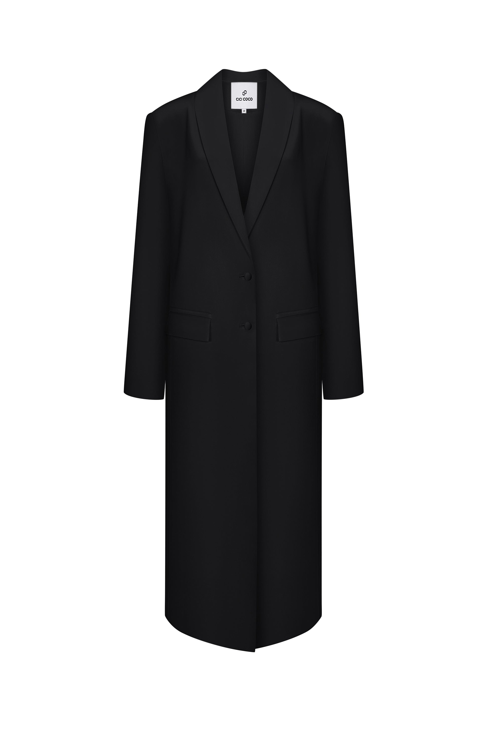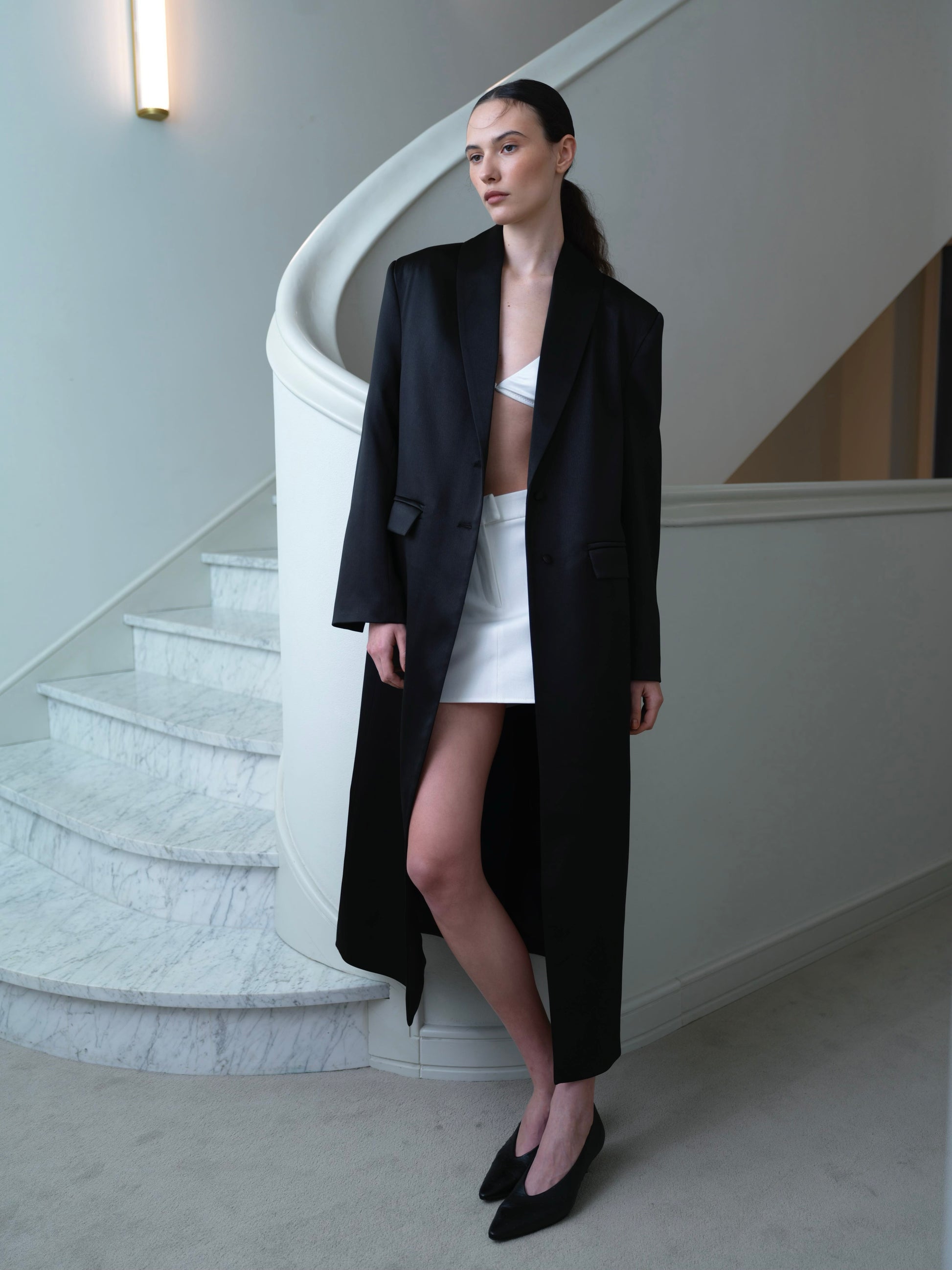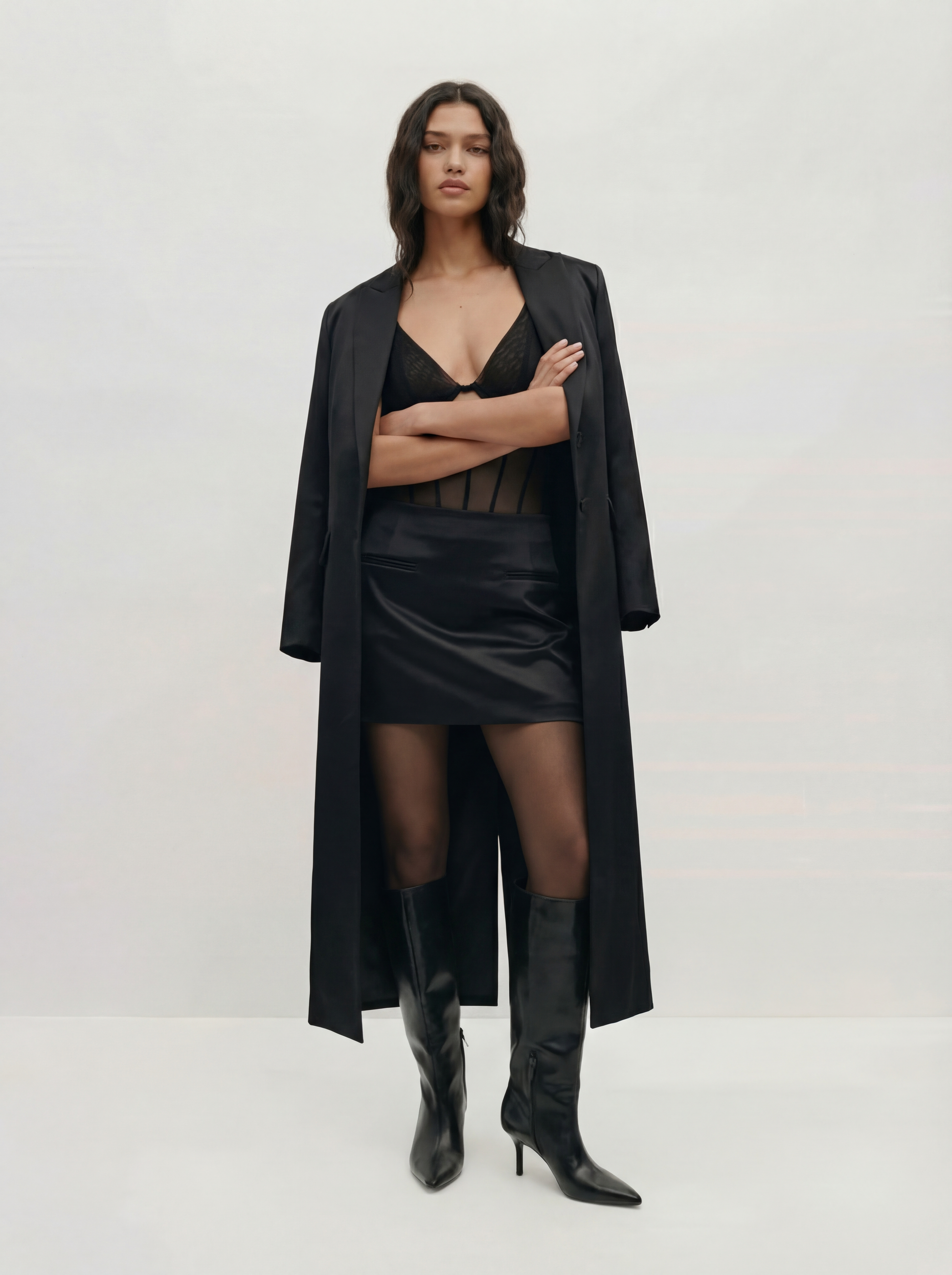 Чорний сатиновий жакет максі довжини – це елегантна та виразна деталь гардеробу, яка митьєво додає форму стилю і структури. Цупкий сатин із делікатним блиском підкреслює вишуканість матеріалу, а подовжена лінія жакета створює витончений силует. Застібка на два акуратні ґудзики спереду дозволяє легко регулювати образ, зберігаючи мінімалістичну та чисту форму. Купуючи чорний максі жакет із сатиною, ви отримуєте універсальний елемент, який легко потратитись як із денними, так і з вечірніми луками.