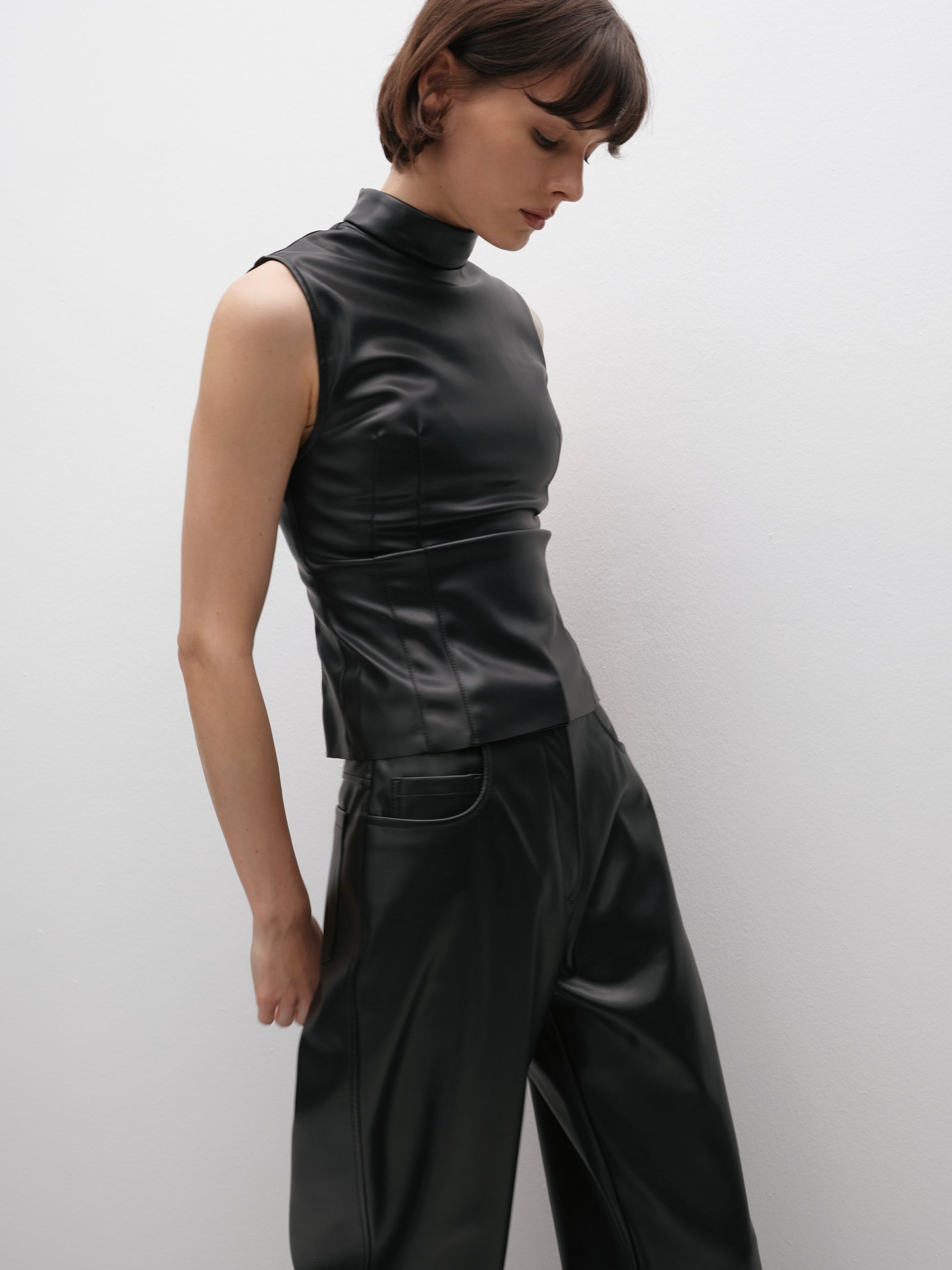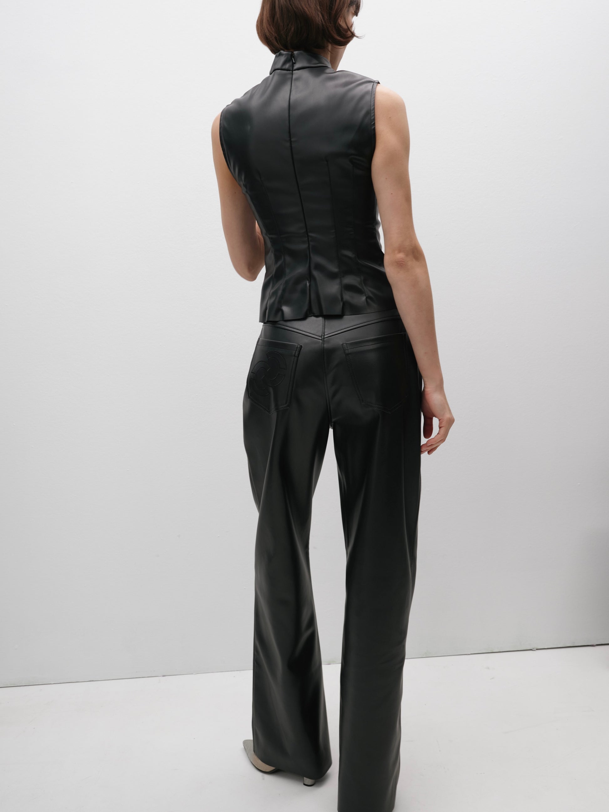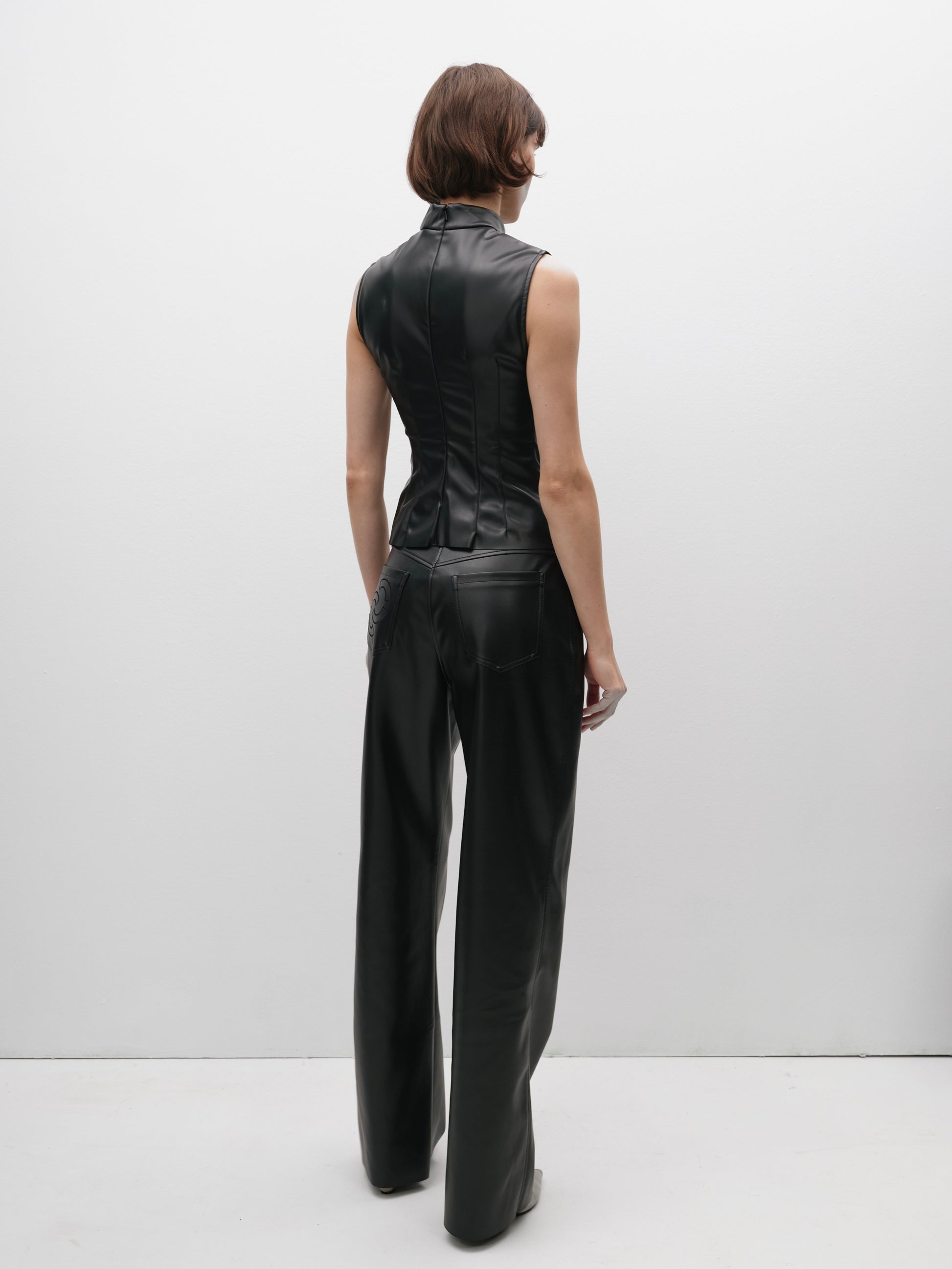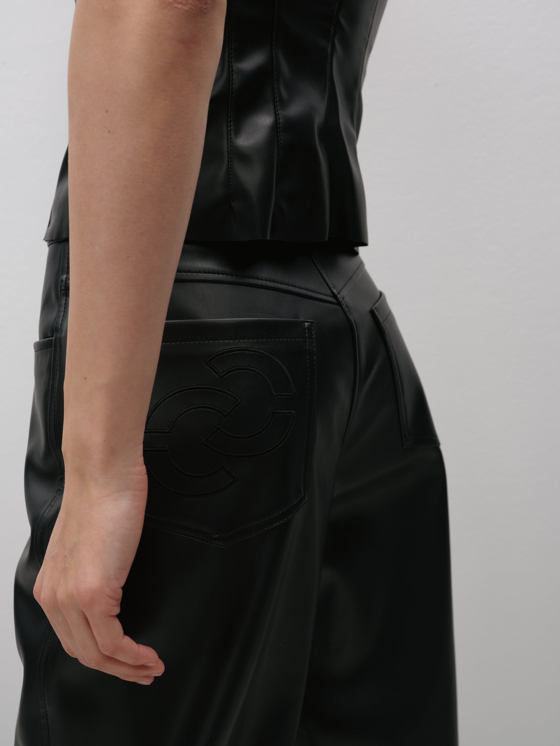Чорні штани з еко-шкіри вільного крою – це стильне поєднання сучасної форми та розкішної текстури. М’яка еко-шкіра має делікатний матовий блиск і добре тримає форму, створюючи виразний, але водночас універсальний силует. Вільний крій додає комфорту, а вишите лого бренду на задній кишені підкреслює увагу до деталей.