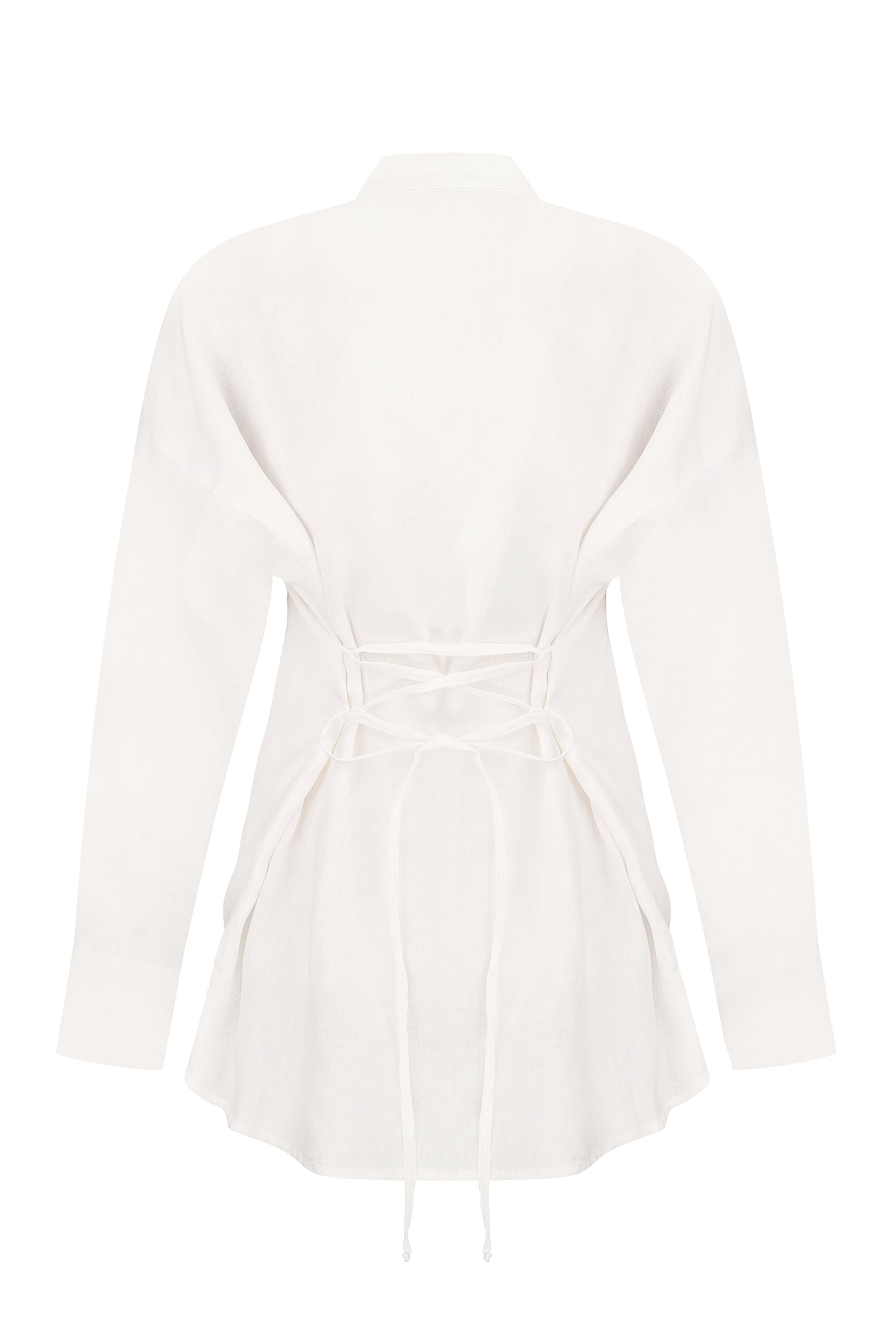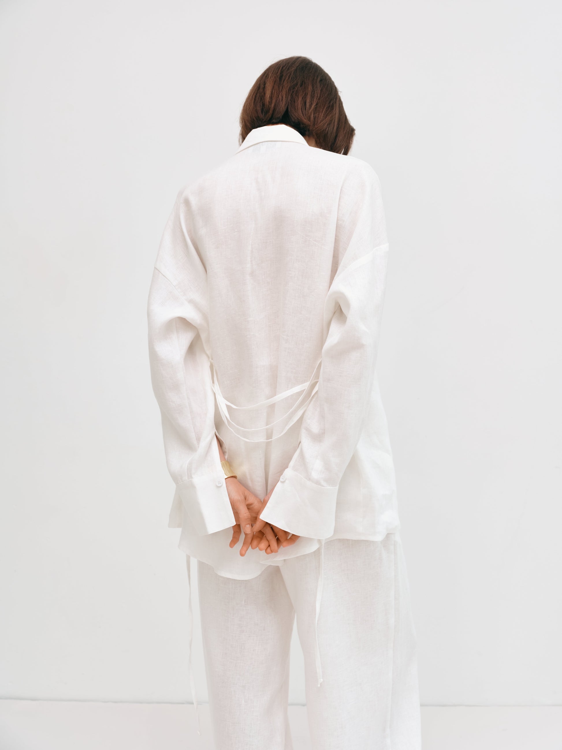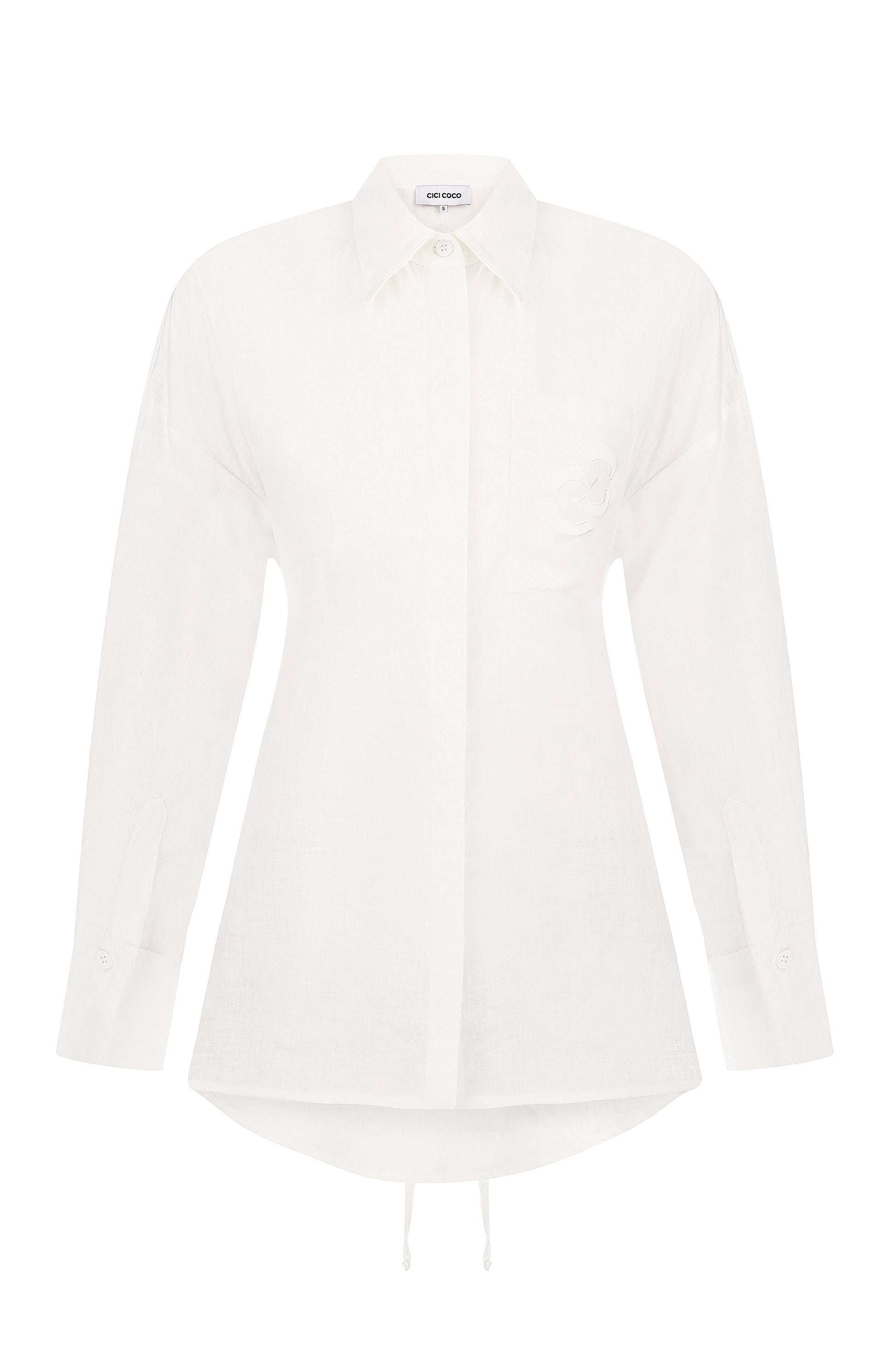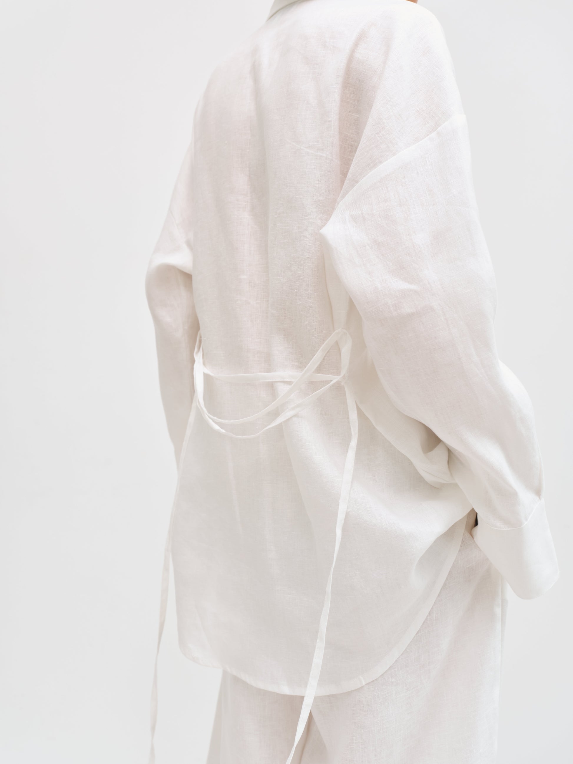 Жіноча сорочка молочна з льону — універсальна річ у гардеробі, яка легко адаптується під твій настрій і образ. Завдяки прямому крою її можна носити як у форматі легкого оверсайзу, так і зробити приталеною — достатньо зав’язати стрічку ззаду, яка акуратно підкреслює талію.