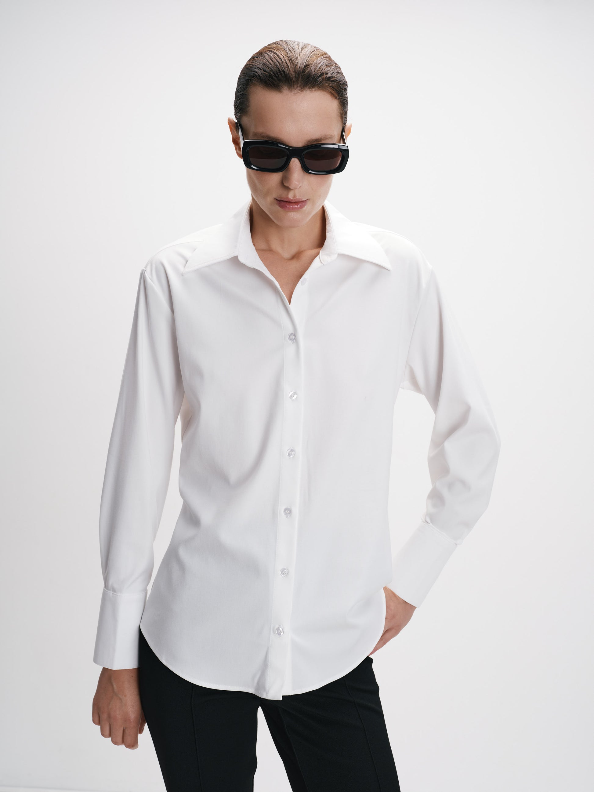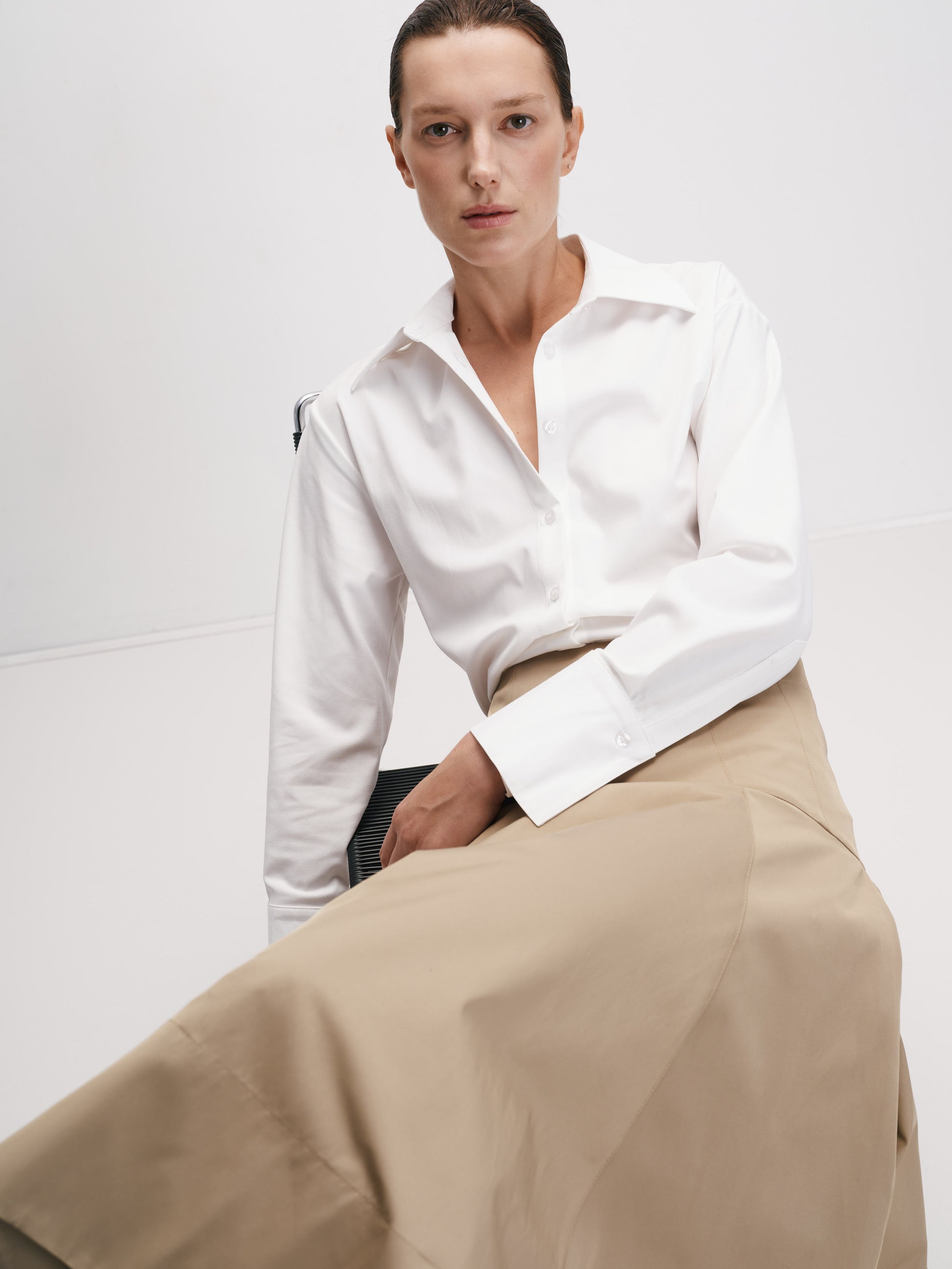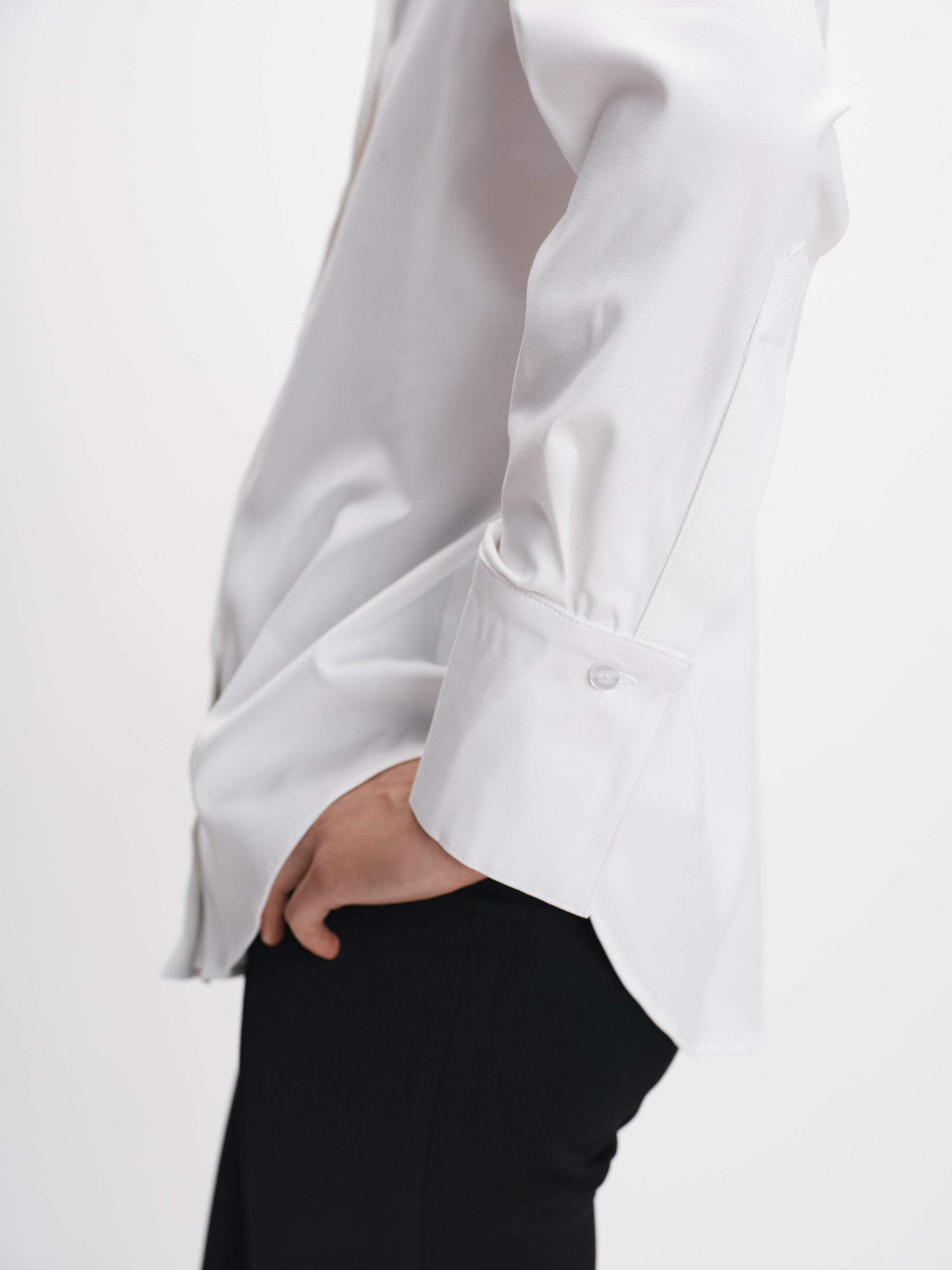 Молочну силуетну сорочку можна поєднувати з широкими штанами, джинсами або спідницею для створення різних образів – від офісного до повсякденного. У парі з тренчем або жакетом вона набуває ще більшої виразності.