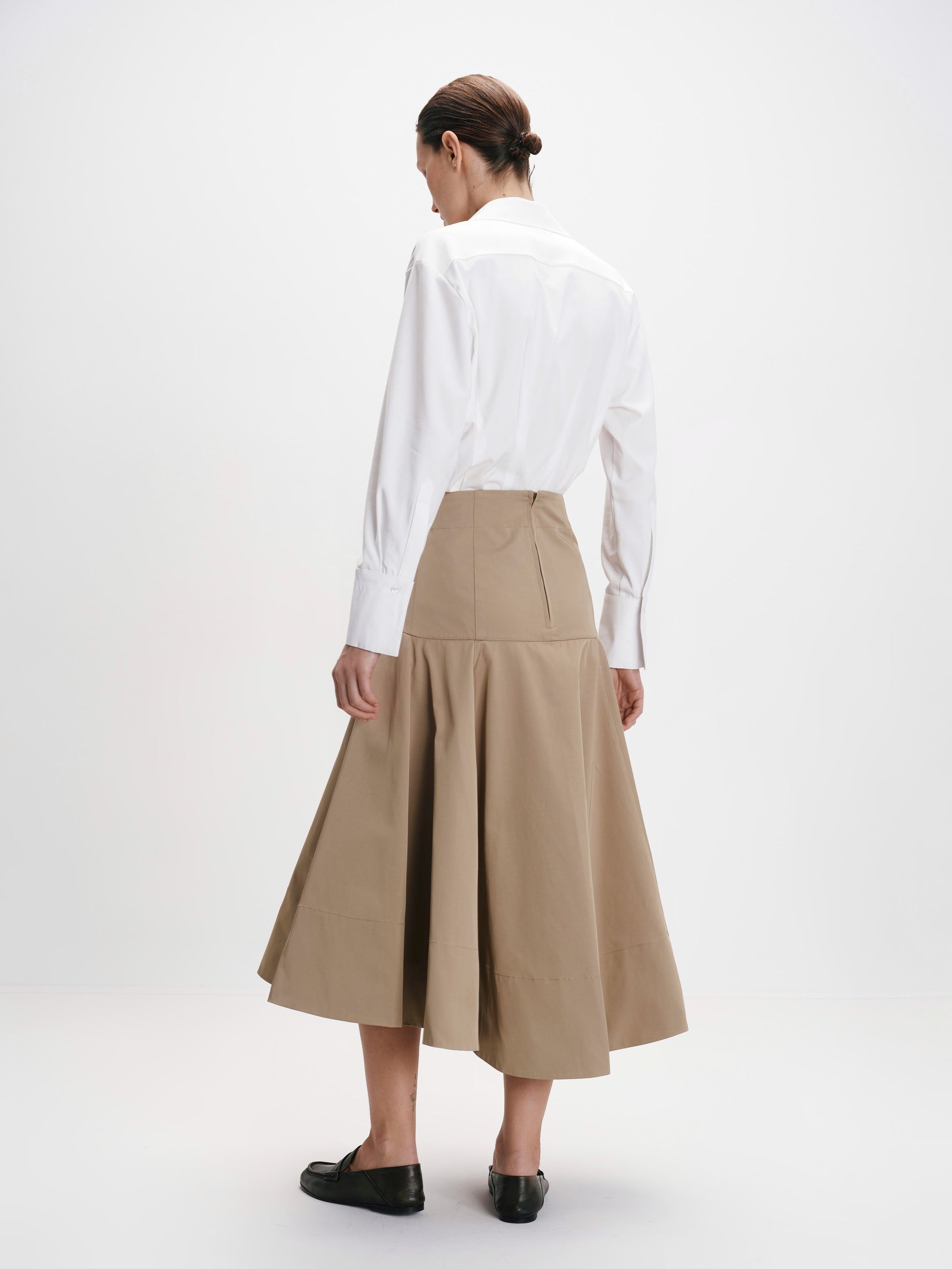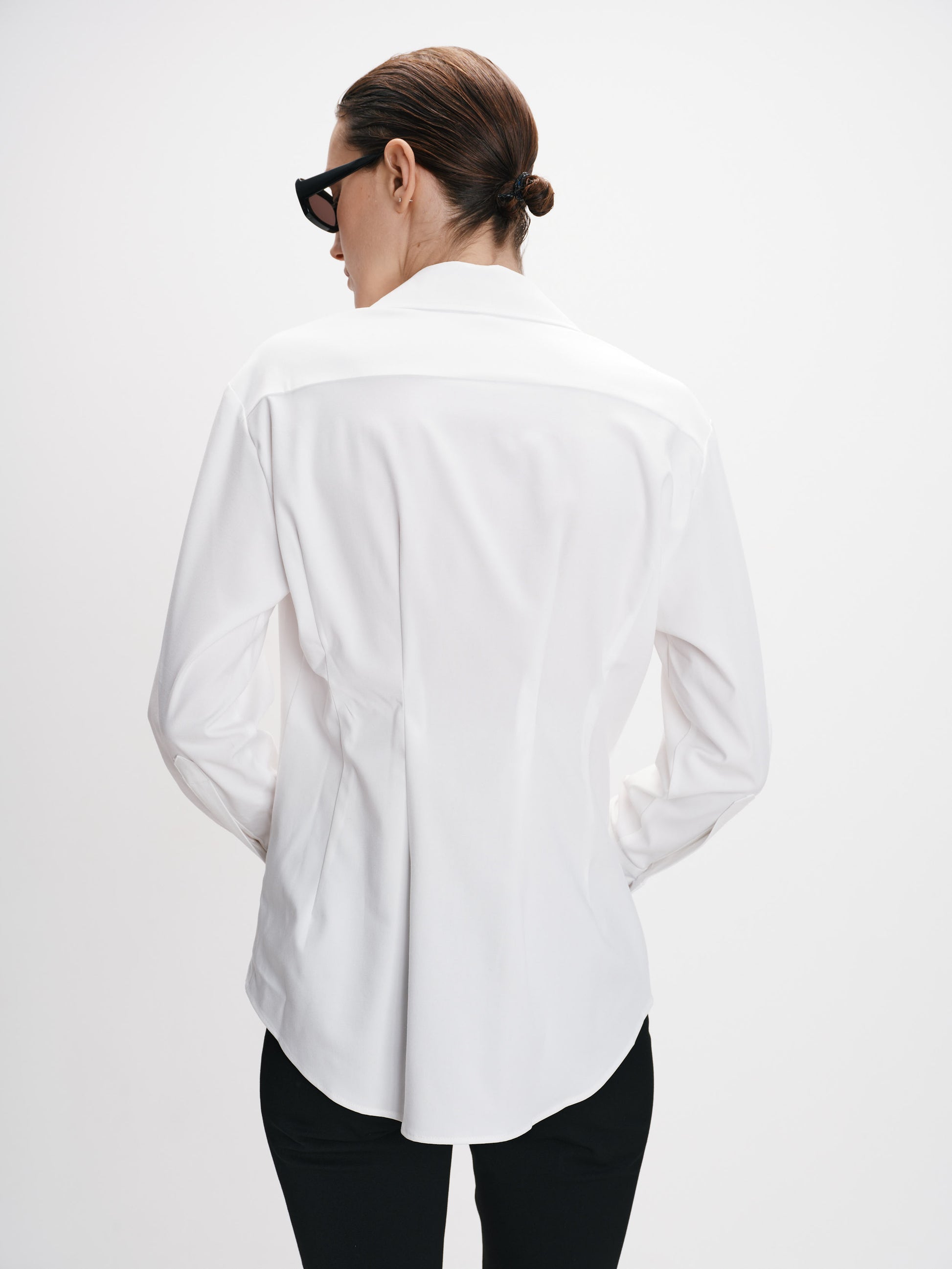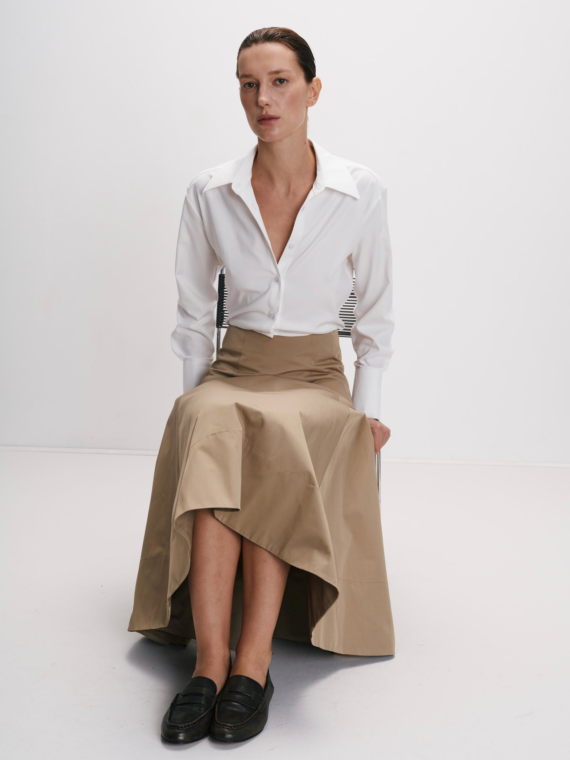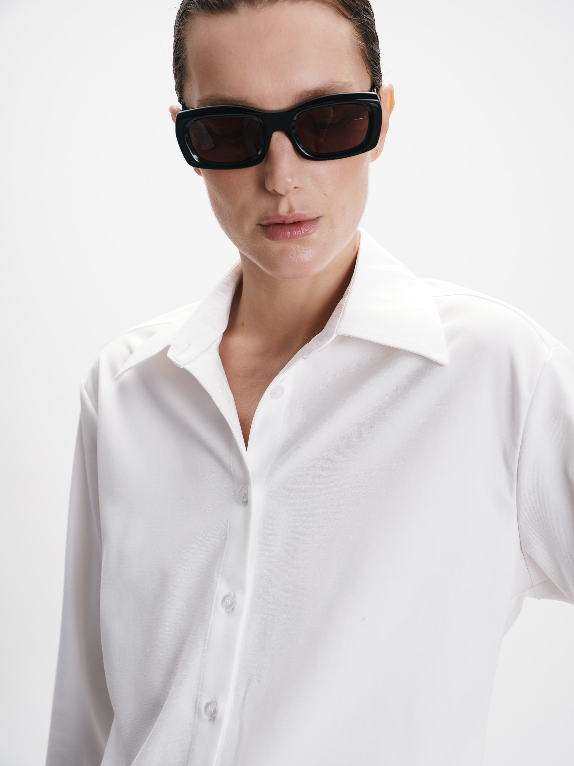 Молочну силуетну сорочку можна поєднувати з широкими штанами, джинсами або спідницею для створення різних образів – від офісного до повсякденного. У парі з тренчем або жакетом вона набуває ще більшої виразності.