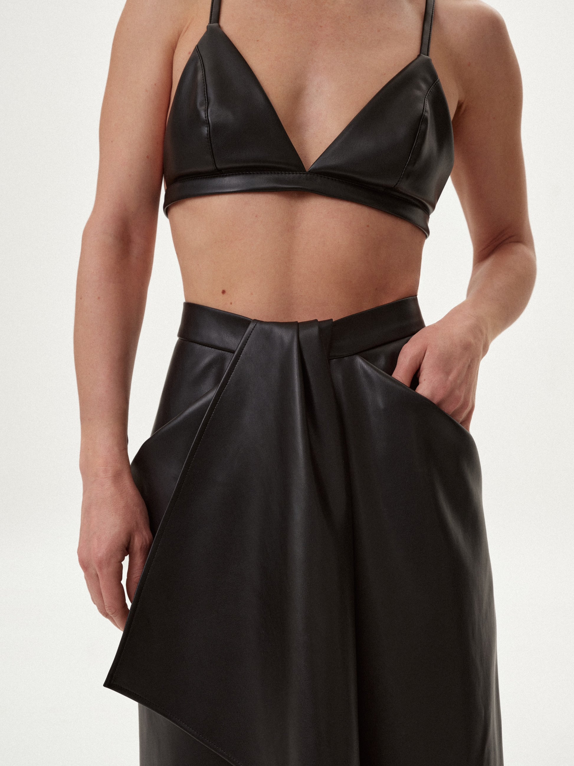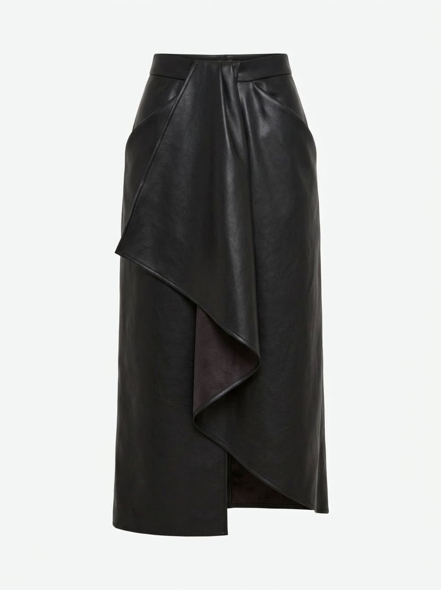 М’яка еко-шкіра комфортно адаптується до силуету, зберігаючи чіткість форми та охайний вигляд. Спідниця формує зібрану пропорцію та стає акцентом навіть у стриманому образі.