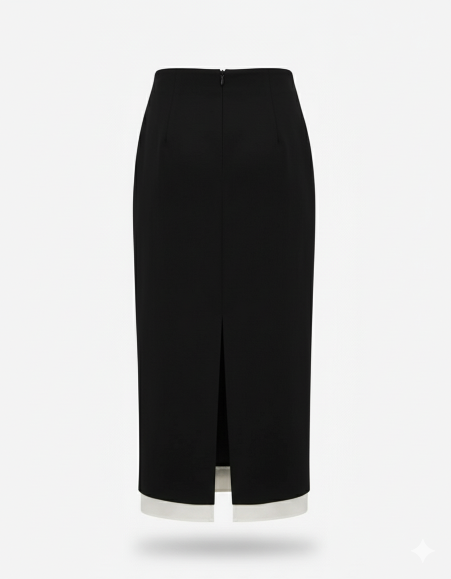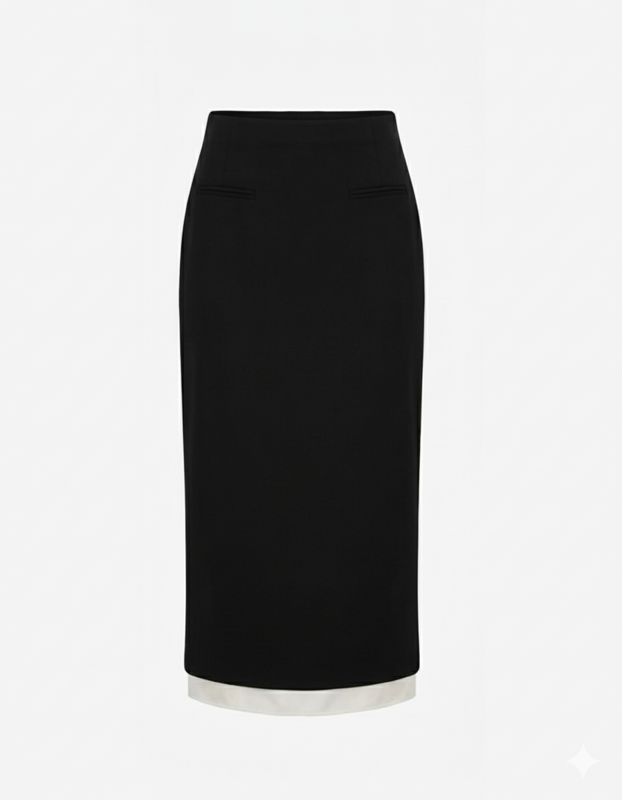 Чорну спідницю максі з контрастною підкладкою можна поєднувати зі жакетими, блузами чи лонгами для стильних повсякденних образів. У парі з тренчем або шкіряною курткою спідниця набуває особливої виразності.
