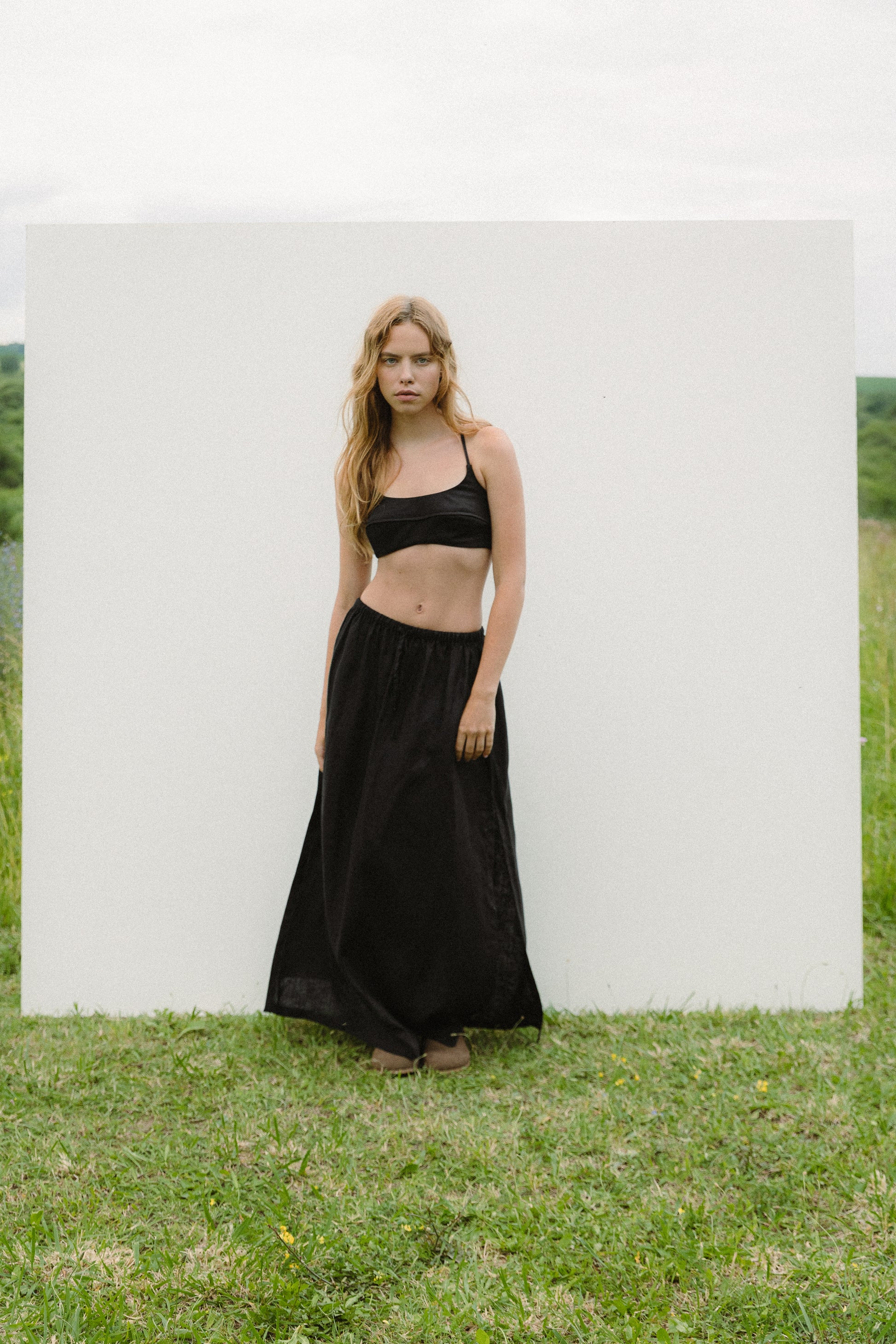 Жіноча чорна спідниця максі з льону – це стиль, елегантність та легкість у створенні образів. Вільний крій формує плавний силует, а натуральний льон забезпечує комфорт. Лаконічний дизайн робить її універсальною: вона чудово поєднується як із класичними блузами, так і з легкими топами.
