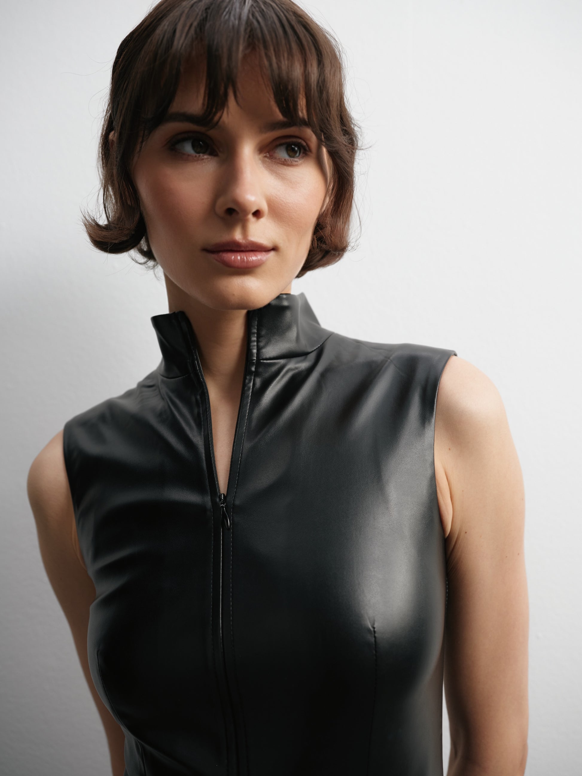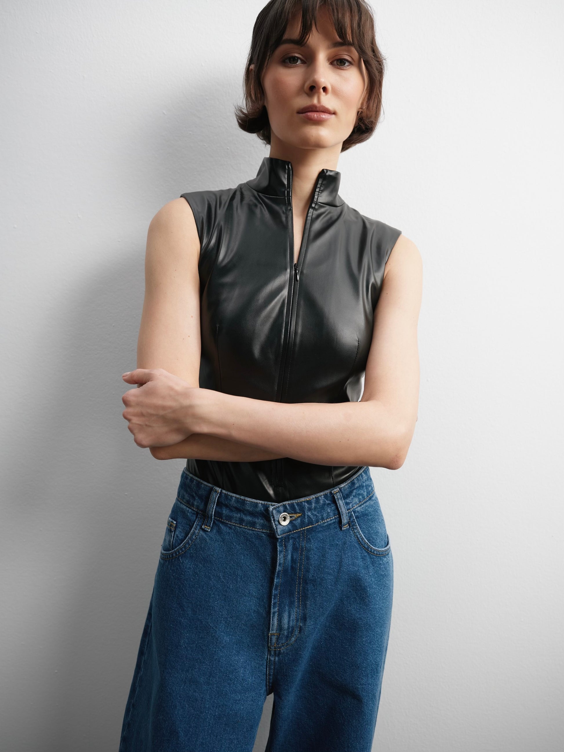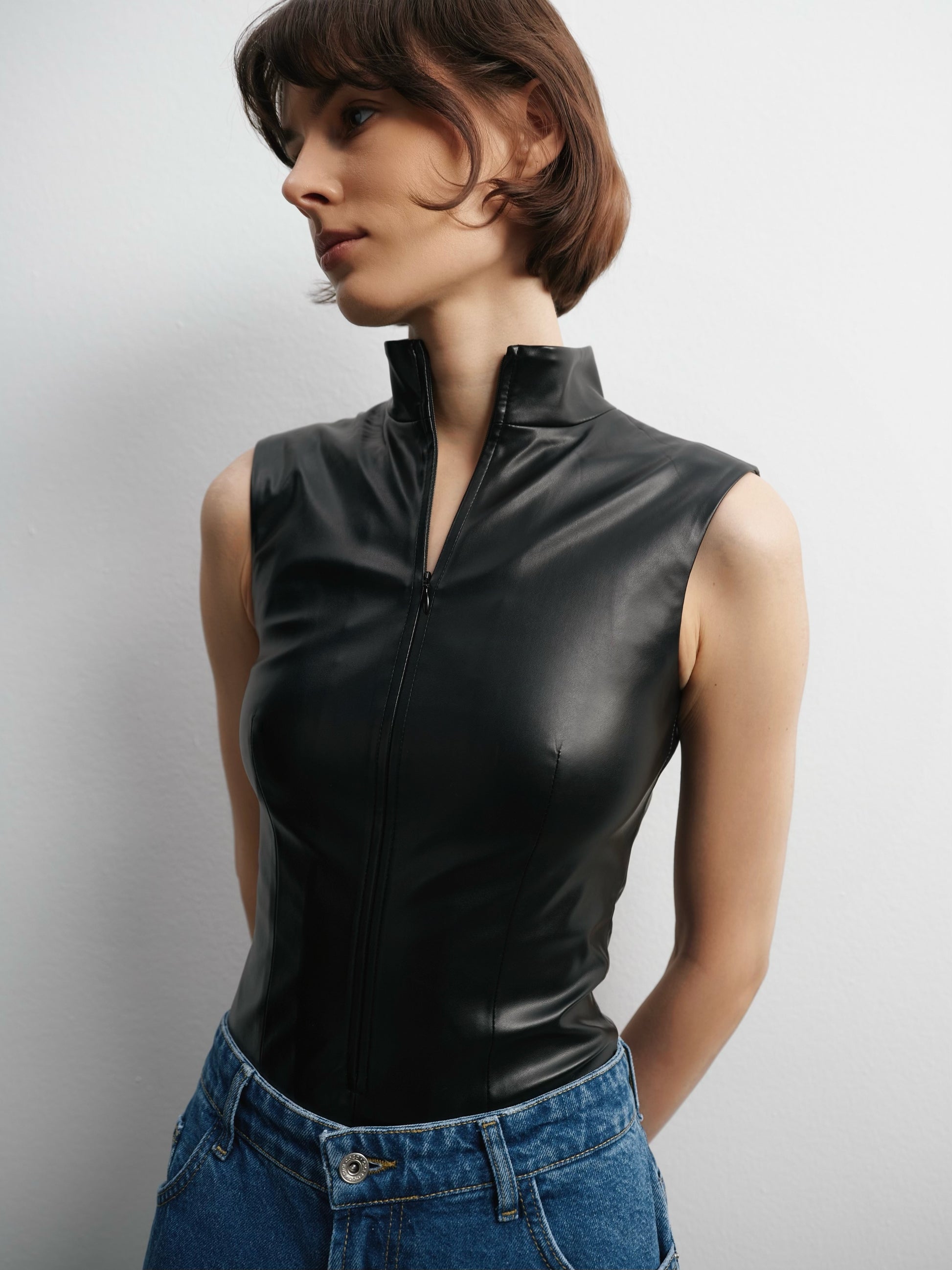 Чорний топ-боді з еко-шкіри із замком — це поєднання елегантності, сміливості та мінімалізму. Завдяки м’якій еластичній еко-шкірі виріб комфортно прилягає до тіла, підкреслюючи фігуру, а блискавка спереду додає сучасного акценту та дозволяє регулювати глибину вирізу.