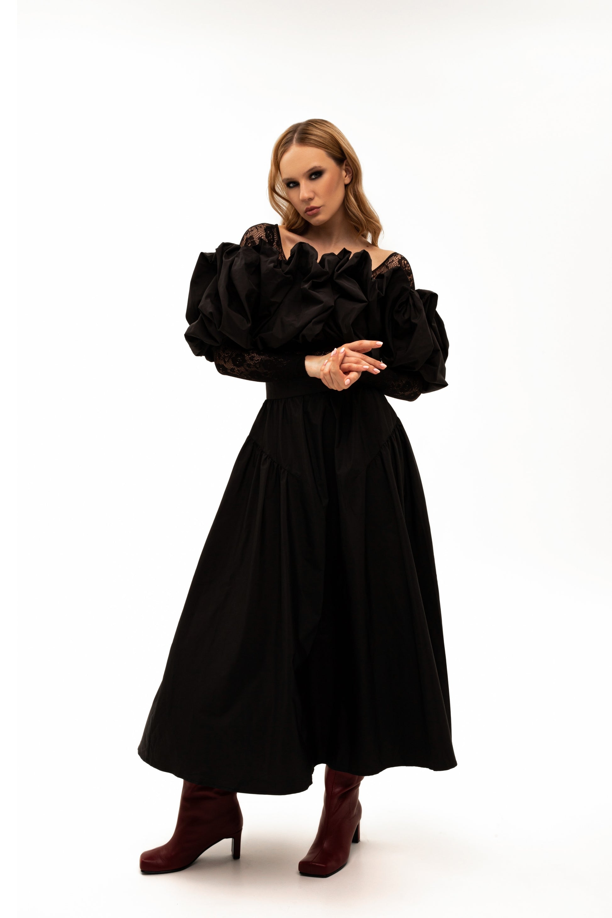 Жіночий топ буф чорний – це стиль, елегантність та легкість у носінні. Об’ємний крій створює ефектний силует, а лаконічний дизайн робить його універсальним: він чудово поєднується як із класичними палаццо, так і зі спідницями.