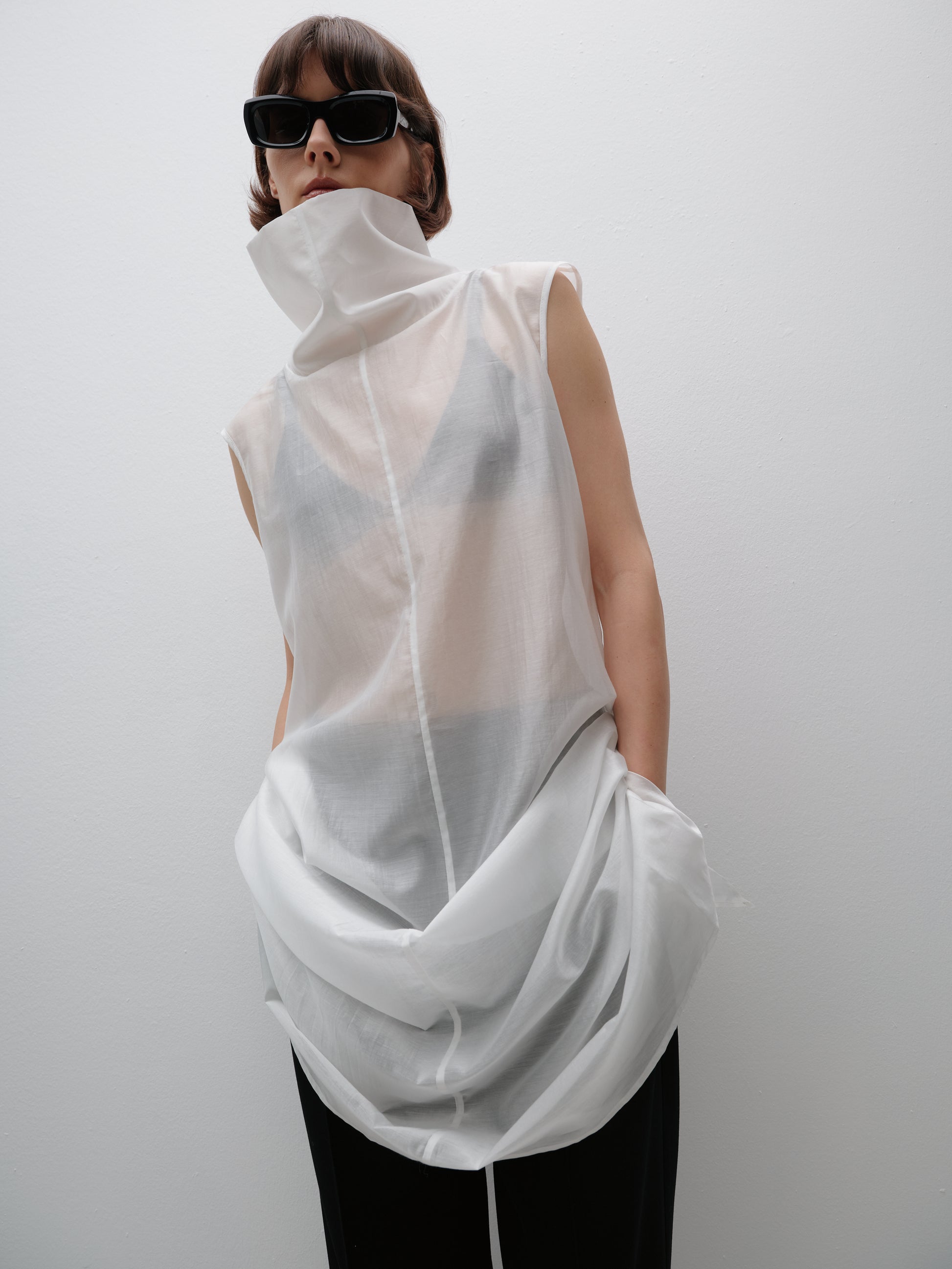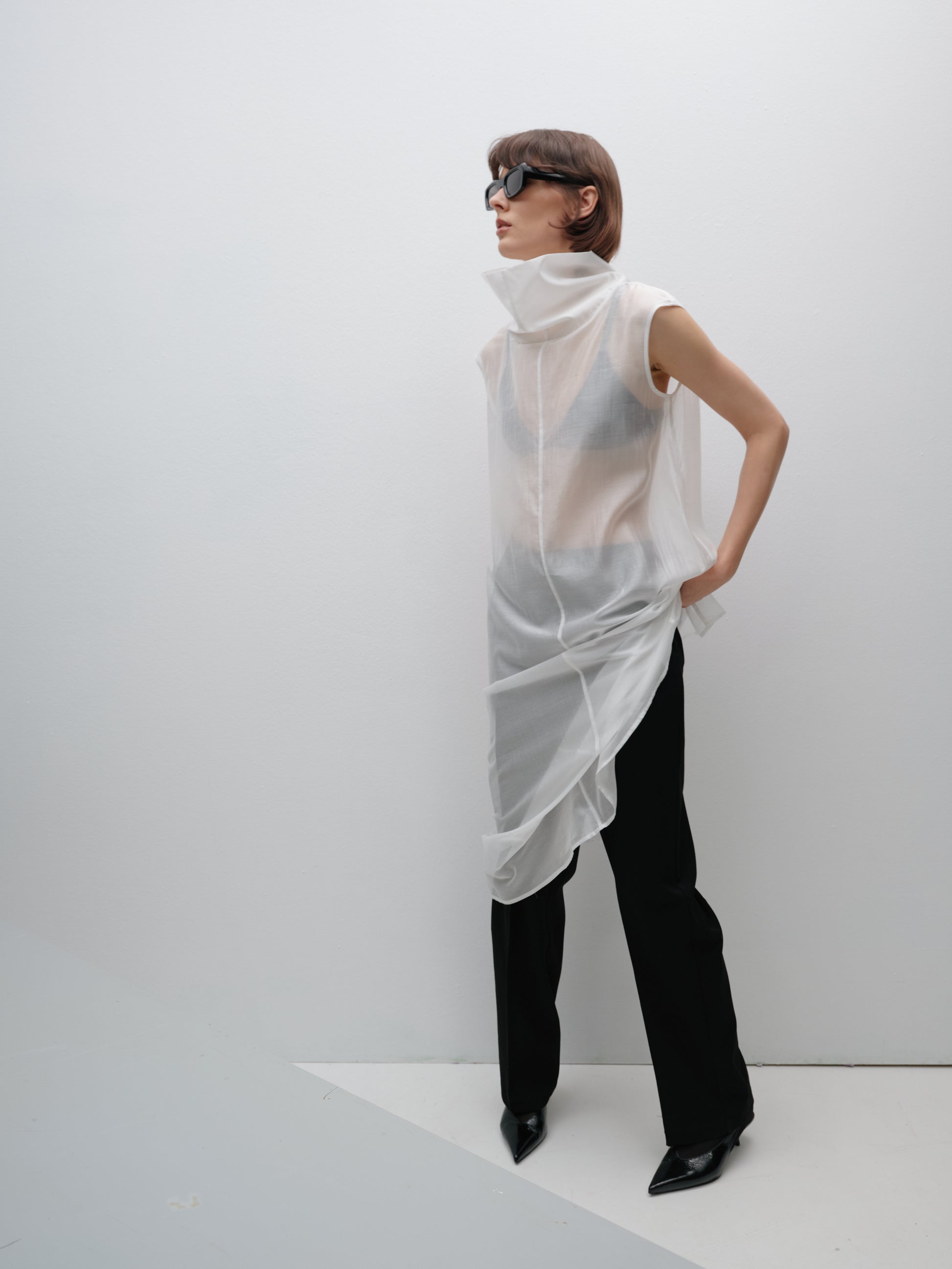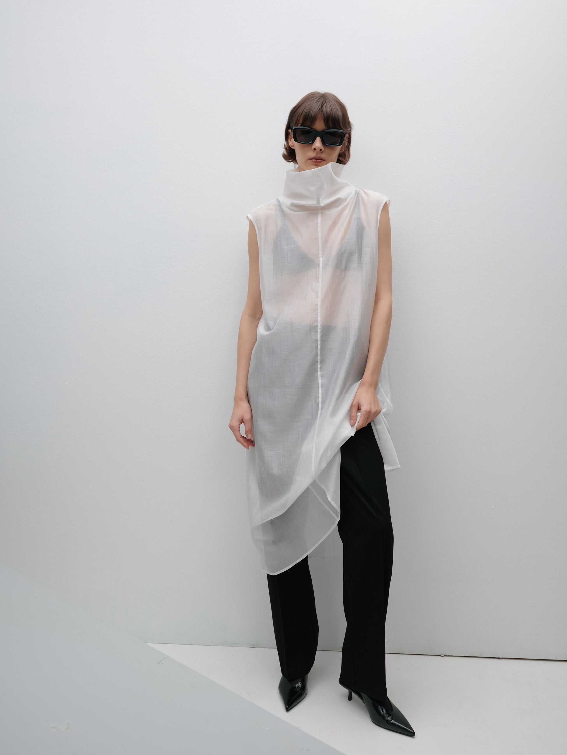 Молочний довгий напівпрозорий топ під горло — це поєднання витонченості та сучасної жіночності. Легка еластична тканина м’яко лягає по фігурі, створюючи елегантний силует, а подовжений крій додає стриманої драматичності. Високий комір підкреслює лінію шиї, роблячи образ вишуканим і завершеним.