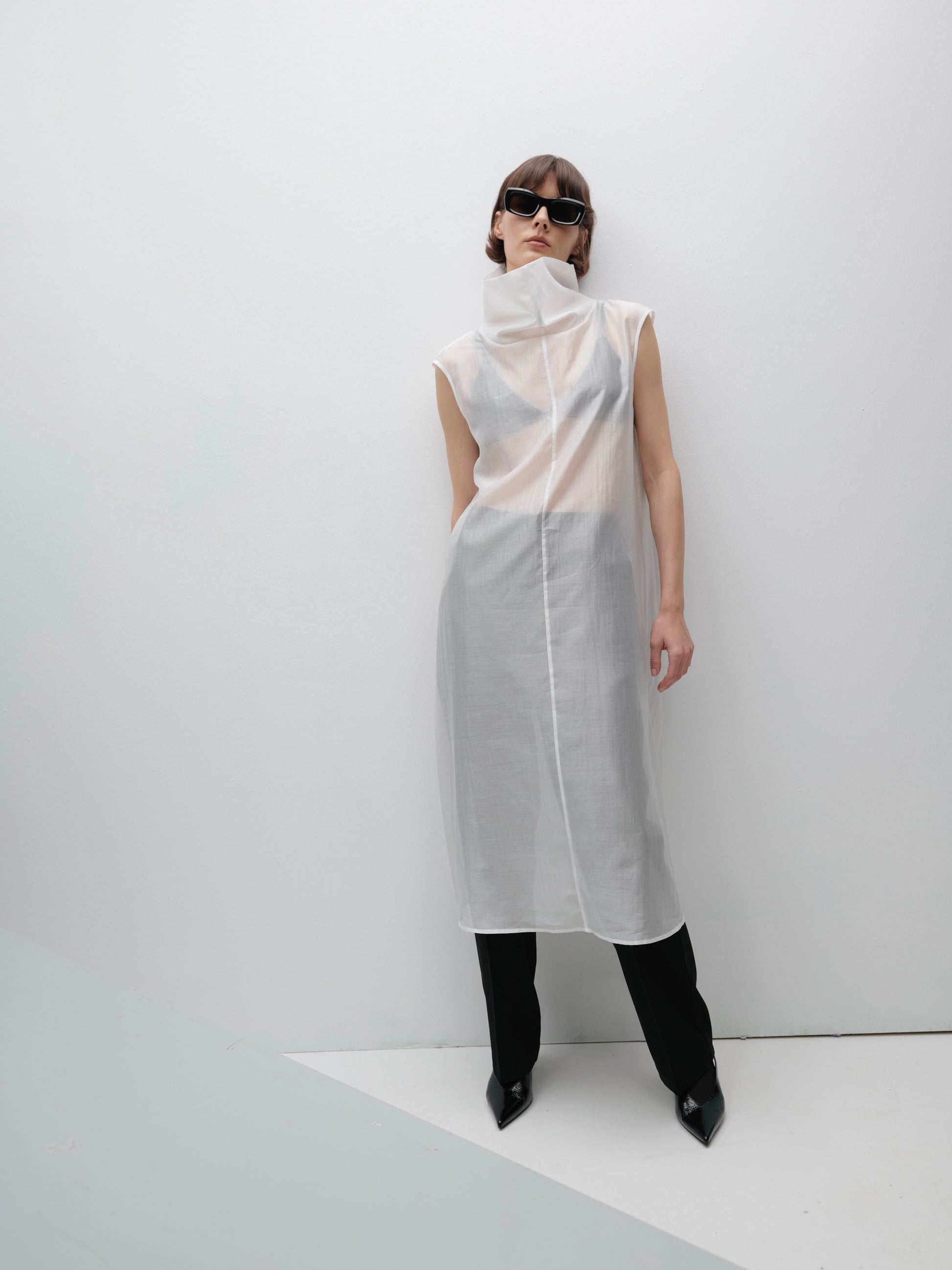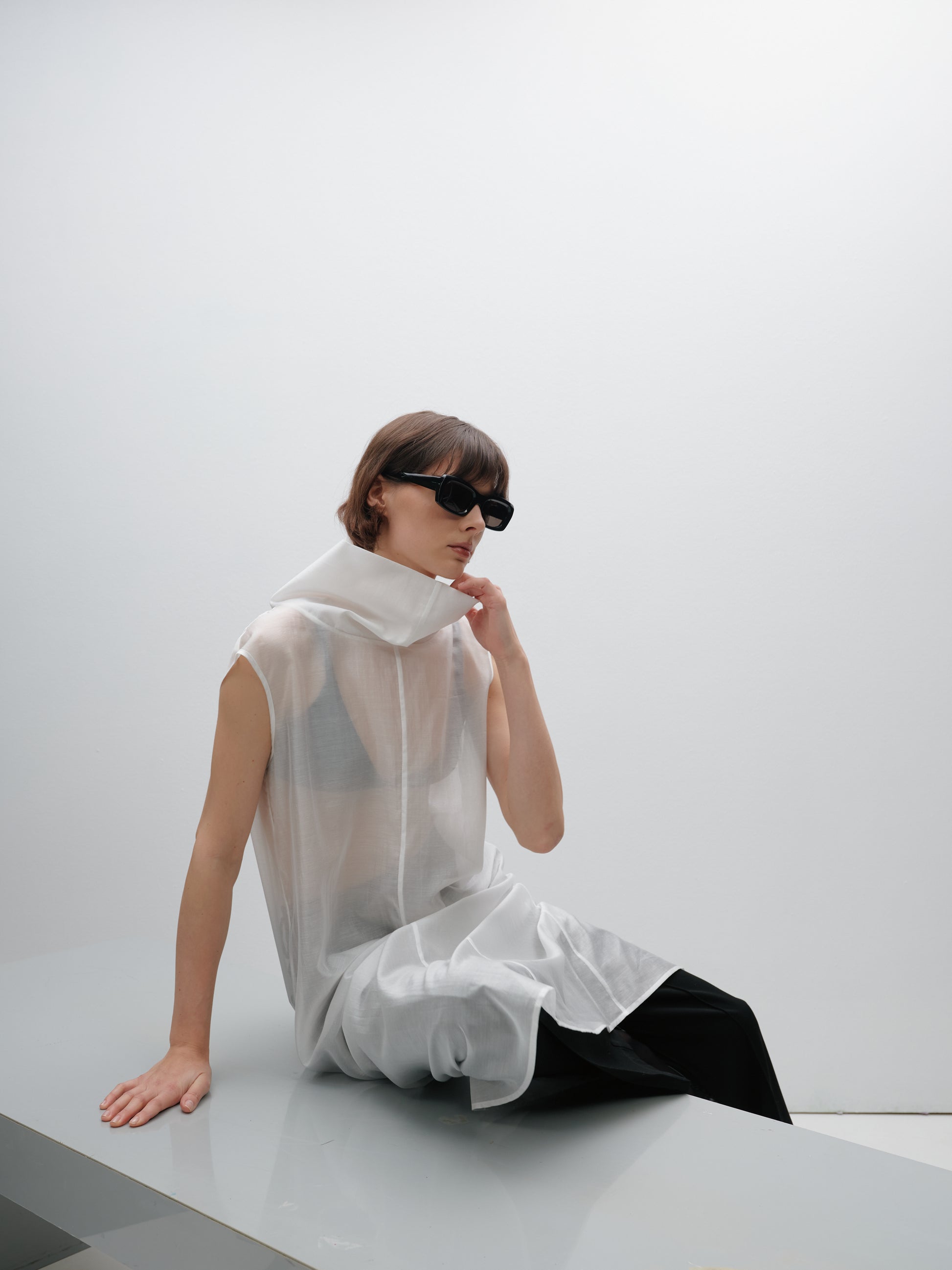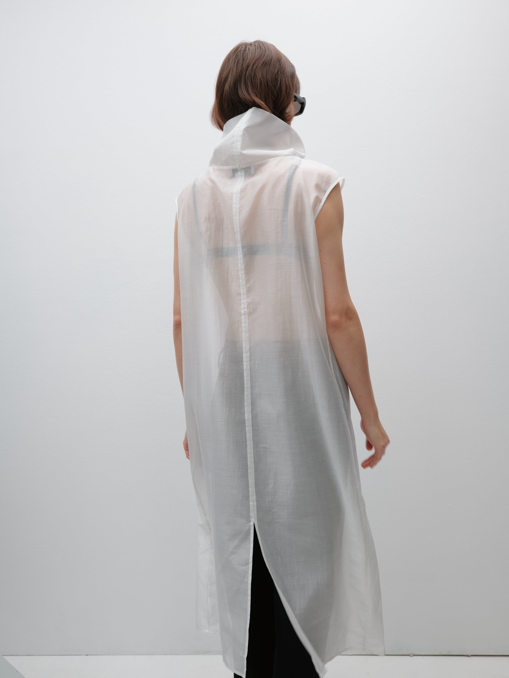 Молочний довгий напівпрозорий топ під горло — це поєднання витонченості та сучасної жіночності. Легка еластична тканина м’яко лягає по фігурі, створюючи елегантний силует, а подовжений крій додає стриманої драматичності. Високий комір підкреслює лінію шиї, роблячи образ вишуканим і завершеним.