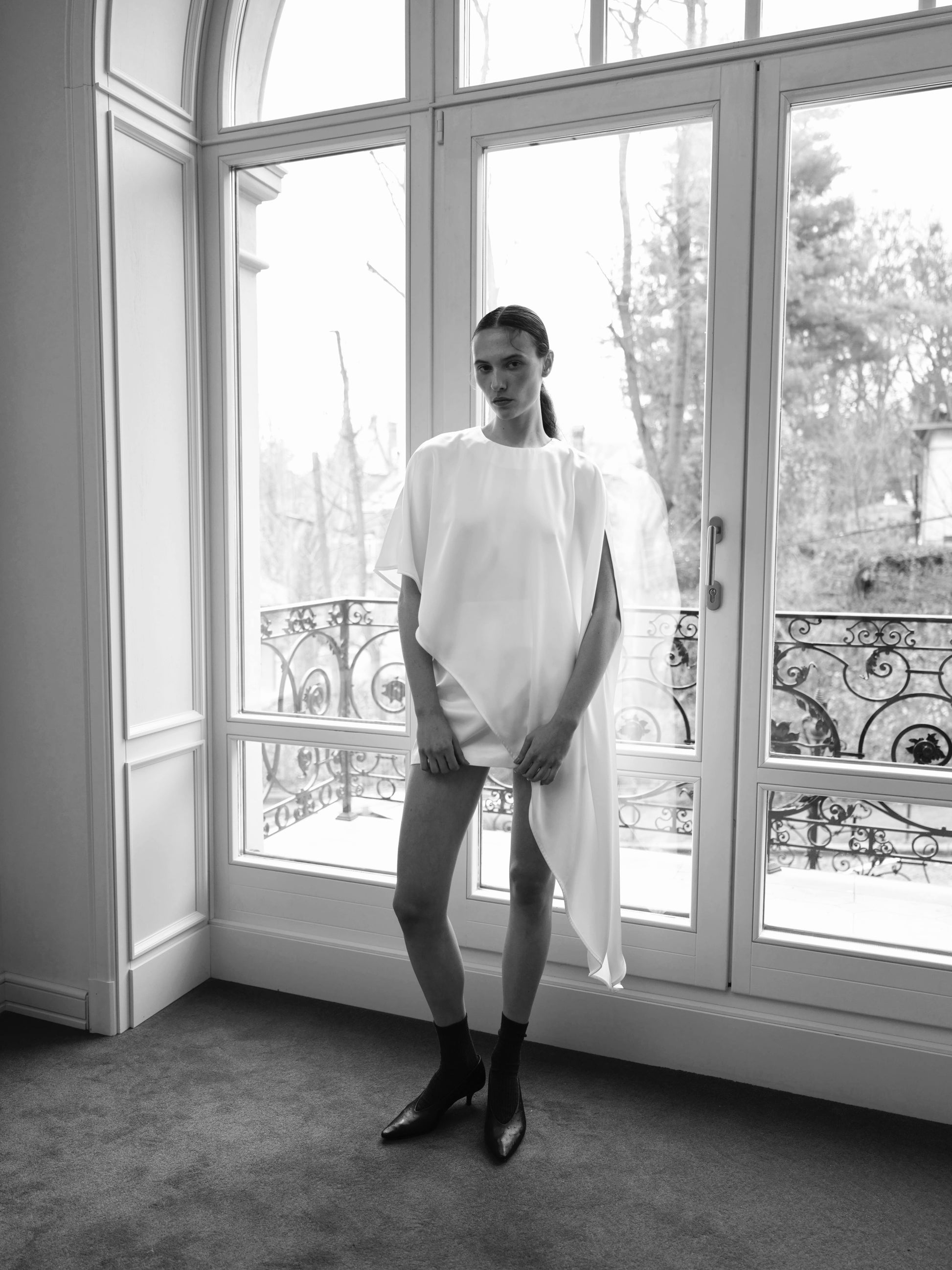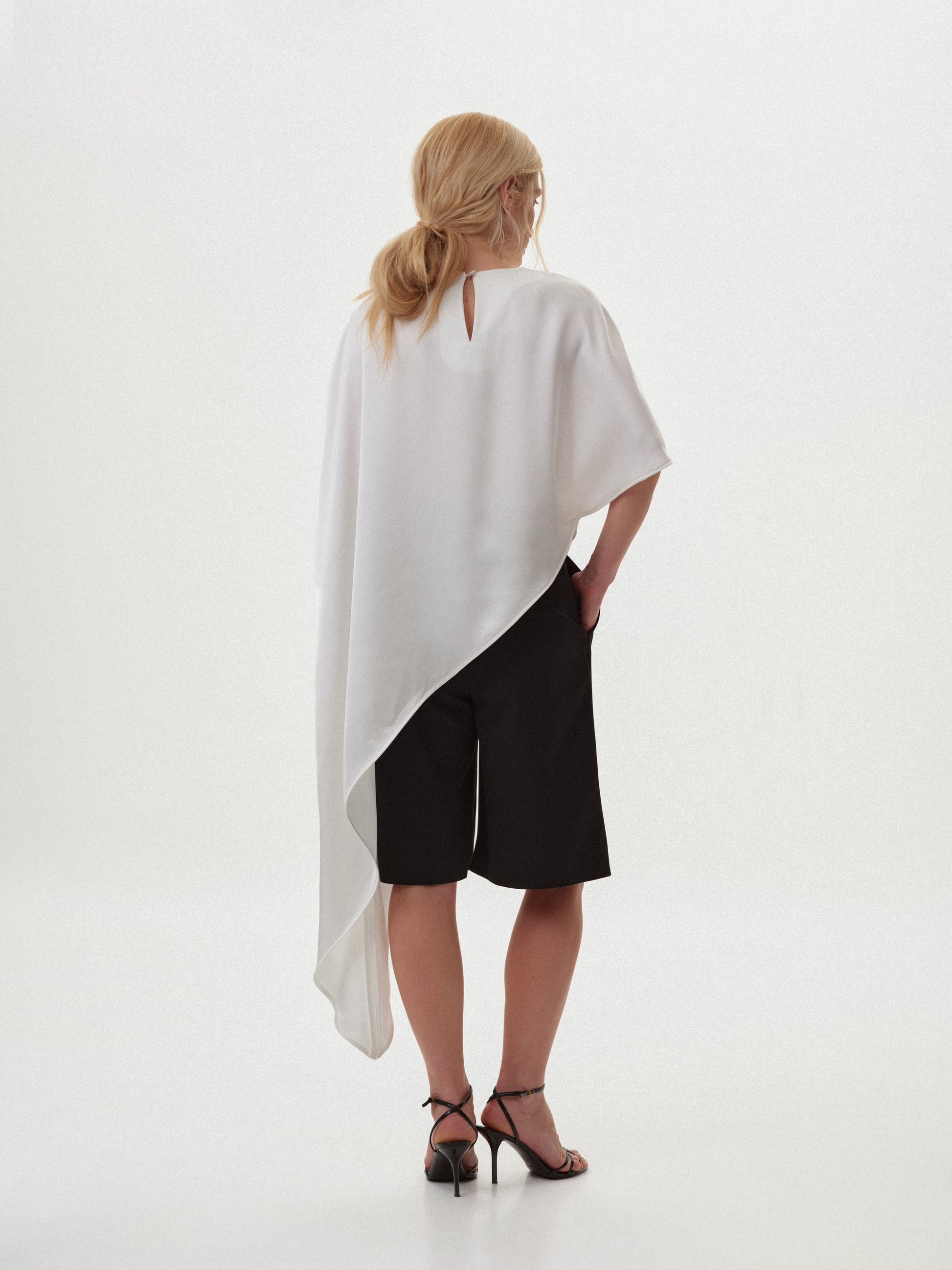 Комбінуйте його зі спідницями-міні, сатиновими низами чи елегантними брюками для створення повітряних та естетичних образів. Завдяки асиметрії й вишуканому молочному кольору топ стає центральним акцентом і чудово підходить для вечірніх подій, урочистостей або стильних мінімалістичних аутфітів.